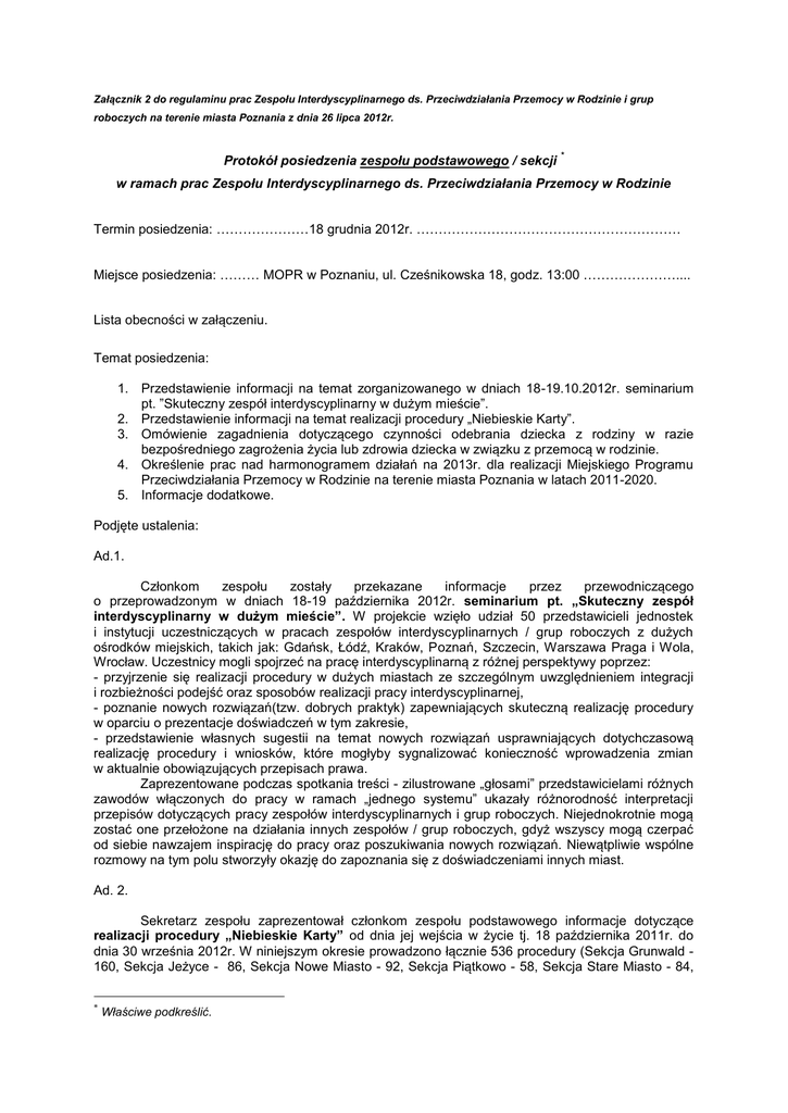 Załącznik 2 do regulaminu prac Zespołu Interdyscyplinarnego ds. Przeciwdziałania Przemocy w Rodzinie i grup roboczych na terenie miasta Poznania z dnia 26 lipca 2012r. Protokół posiedzenia zespołu podstawowego / sekcji * w ramach prac Zespołu Interdyscyplinarnego ds. Przeciwdziałania Przemocy w Rodzinie Termin posiedzenia: …………………18 grudnia 2012r. …………………………………………………… Miejsce posiedzenia: ……… MOPR w Poznaniu, ul. Cześnikowska 18, godz. 13:00 ………………….... Lista obecności w załączeniu. Temat posiedzenia: 1. Przedstawienie informacji na temat zorganizowanego w dniach 18-19.10.2012r. seminarium pt. ”Skuteczny zespół interdyscyplinarny w dużym mieście”. 2. Przedstawienie informacji na temat realizacji procedury „Niebieskie Karty”. 3. Omówienie zagadnienia dotyczącego czynności odebrania dziecka z rodziny w razie bezpośredniego zagrożenia życia lub zdrowia dziecka w związku z przemocą w rodzinie. 4. Określenie prac nad harmonogramem działań na 2013r. dla realizacji Miejskiego Programu Przeciwdziałania Przemocy w Rodzinie na terenie miasta Poznania w latach 2011-2020. 5. Informacje dodatkowe. Podjęte ustalenia: Ad.1. Członkom zespołu zostały przekazane informacje przez przewodniczącego o przeprowadzonym w dniach 18-19 października 2012r. seminarium pt. „Skuteczny zespół interdyscyplinarny w dużym mieście”. W projekcie wzięło udział 50 przedstawicieli jednostek i instytucji uczestniczących w pracach zespołów interdyscyplinarnych / grup roboczych z dużych ośrodków miejskich, takich jak: Gdańsk, Łódź, Kraków, Poznań, Szczecin, Warszawa Praga i Wola, Wrocław. Uczestnicy mogli spojrzeć na pracę interdyscyplinarną z różnej perspektywy poprzez: - przyjrzenie się realizacji procedury w dużych miastach ze szczególnym uwzględnieniem integracji i rozbieżności podejść oraz sposobów realizacji pracy interdyscyplinarnej, - poznanie nowych rozwiązań(tzw. dobrych praktyk) zapewniających skuteczną realizację procedury w oparciu o prezentacje doświadczeń w tym zakresie, - przedstawienie własnych sugestii na temat nowych rozwiązań usprawniających dotychczasową realizację procedury i wniosków, które mogłyby sygnalizować konieczność wprowadzenia zmian w aktualnie obowiązujących przepisach prawa. Zaprezentowane podczas spotkania treści - zilustrowane „głosami” przedstawicielami różnych zawodów włączonych do pracy w ramach „jednego systemu” ukazały różnorodność interpretacji przepisów dotyczących pracy zespołów interdyscyplinarnych i grup roboczych. Niejednokrotnie mogą zostać one przełożone na działania innych zespołów / grup roboczych, gdyż wszyscy mogą czerpać od siebie nawzajem inspirację do pracy oraz poszukiwania nowych rozwiązań. Niewątpliwie wspólne rozmowy na tym polu stworzyły okazję do zapoznania się z doświadczeniami innych miast. Ad. 2. Sekretarz zespołu zaprezentował członkom zespołu podstawowego informacje dotyczące realizacji procedury „Niebieskie Karty” od dnia jej wejścia w życie tj. 18 października 2011r. do dnia 30 września 2012r. W niniejszym okresie prowadzono łącznie 536 procedury (Sekcja Grunwald 160, Sekcja Jeżyce - 86, Sekcja Nowe Miasto - 92, Sekcja Piątkowo - 58, Sekcja Stare Miasto - 84, * Właściwe podkreślić. Sekcja Wilda - 56). Spośród prezentowanych danych 101 procedur uruchomiono w 2011r., zaś 435 procedury w roku 2012. Do tego okresu łącznie zakończono 175 procedur. Ad. 3. Dyskusji członków zespołu podstawowego poddano problem - dotyczący działań o charakterze interwencyjnym, w których uczestniczą dzieci i w konsekwencji potrzeby zapewnienia im opieki - sygnalizowany przez Panią Joannę Kęcińską (przedstawiciela Komendy Miejskiej Policji). Dotyczy to sytuacji, w których funkcjonariusz Policji w razie bezpośredniego zagrożenia życia lub zdrowia dziecka „samodzielnie” dokonuje czynności jego odebrania z rodziny (m.in. w przypadku ostrego kryzysu w rodzinie). W tym kontekście zgłaszane trudności związane są z dwoma okolicznościami: potrzebą określenia stanu zdrowia dziecka (i tym samym udziału przedstawiciela służby zdrowia w ww. działaniach) oraz obawą odnoszącą się do okoliczności przewiezienia dziecka przy umieszczeniu go w placówce opiekuńczo-wychowawczej. Mając na uwadze obowiązujące przepisy prawa (w szczególności ustawę z dnia 9 czerwca 2011r. o wspieraniu rodziny i systemie pieczy zastępczej) przewodniczący stwierdził, iż nie wynika z nich potrzeba przedstawienia dokumentów o stanie zdrowia dziecka przy umieszczeniu go interwencyjnie w placówce opiekuńczo - wychowawczej. Z kolei kwestię doprowadzenia dziecka do ww. placówki określa szczegółowo art. 103 ust. 2. pkt. 2 cytowanej ustawy, który stwarza funkcjonariuszom Policji lub Straży Granicznej taką możliwość (do placówki opiekuńczo wychowawczej typu interwencyjnego) „dziecko przyjmuje się: (…) w przypadku gdy dziecko zostało doprowadzone przez Policję lub Straż Graniczną”. W trakcie posiedzenie Pan Hieronim Mazurek (przedstawiciel Prokuratury Okręgowej) zasugerował potrzebę opracowania i na bieżąco uaktualniania informacji dotyczącej spisu „dostępnych miejsc” w placówkach opiekuńczo - wychowawczych na wypadek konieczności interwencyjnego umieszczenia dziecka w takiej placówce. Wskazał, iż taka informacja byłaby przydatna dla osób dokonujących odbioru dziecka z rodziny, m.in. funkcjonariuszy Policji, dyżurujących sędziów sądu oraz pracowników socjalnych. W odniesieniu do powyższych rozważań zwrócono uwagę na trudności związane z przyjęciem dziecka do placówki opiekuńczo - wychowawczej i sytuacje nie udzielenia pomocy dziecku (w okresie ostrego kryzysu lub w związku z przemocą w rodzinie). Ustalono, iż w miesiącu styczniu 2013r. zorganizowane zostanie spotkanie z przedstawic