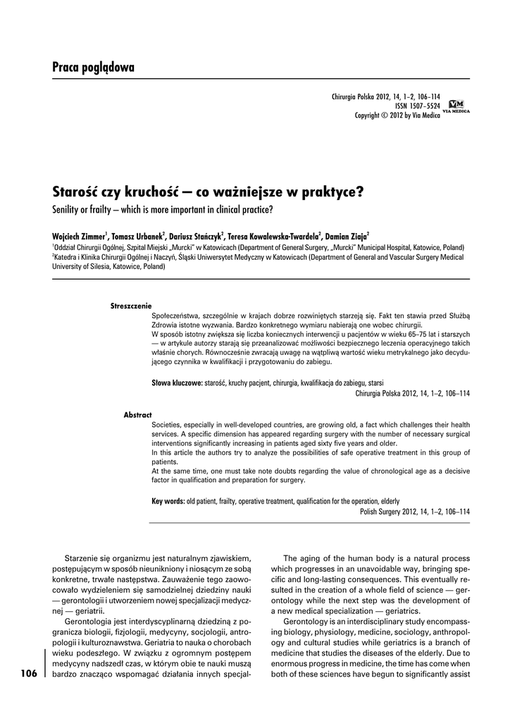 Praca poglądowa Chirurgia Polska 2012, 14, 1–2, 106–114 ISSN 1507–5524 Copyright © 2012 by Via Medica Starość czy kruchość — co ważniejsze w praktyce? Senility or frailty — which is more important in clinical practice? Wojciech Zimmer1, Tomasz Urbanek2, Dariusz Stańczyk2, Teresa Kowalewska-Twardela2, Damian Ziaja2 1 Oddział Chirurgii Ogólnej, Szpital Miejski „Murcki” w Katowicach (Department of General Surgery, „Murcki” Municipal Hospital, Katowice, Poland) Katedra i Klinika Chirurgii Ogólnej i Naczyń, Śląski Uniwersytet Medyczny w Katowicach (Department of General and Vascular Surgery Medical University of Silesia, Katowice, Poland) 2 Streszczenie Społeczeństwa, szczególnie w krajach dobrze rozwiniętych starzeją się. Fakt ten stawia przed Służbą Zdrowia istotne wyzwania. Bardzo konkretnego wymiaru nabierają one wobec chirurgii. W sposób istotny zwiększa się liczba koniecznych interwencji u pacjentów w wieku 65–75 lat i starszych — w artykule autorzy starają się przeanalizować możliwości bezpiecznego leczenia operacyjnego takich właśnie chorych. Równocześnie zwracają uwagę na wątpliwą wartość wieku metrykalnego jako decydującego czynnika w kwalifikacji i przygotowaniu do zabiegu. Słowa kluczowe: starość, kruchy pacjent, chirurgia, kwalifikacja do zabiegu, starsi Chirurgia Polska 2012, 14, 1–2, 106–114 Abstract Societies, especially in well-developed countries, are growing old, a fact which challenges their health services. A specific dimension has appeared regarding surgery with the number of necessary surgical interventions significantly increasing in patients aged sixty five years and older. In this article the authors try to analyze the possibilities of safe operative treatment in this group of patients. At the same time, one must take note doubts regarding the value of chronological age as a decisive factor in qualification and preparation for surgery. Key words: old patient, frailty, operative treatment, qualification for the operation, elderly Polish Surgery 2012, 14, 1–2, 106–114 106 Starzenie się organizmu jest naturalnym zjawiskiem, postępującym w sposób nieunikniony i niosącym ze sobą konkretne, trwałe następstwa. Zauważenie tego zaowocowało wydzieleniem się samodzielnej dziedziny nauki — gerontologii i utworzeniem nowej specjalizacji medycznej — geriatrii. Gerontologia jest interdyscyplinarną dziedziną z pogranicza biologii, fizjologii, medycyny, socjologii, antropologii i kulturoznawstwa. Geriatria to nauka o chorobach wieku podeszłego. W związku z ogromnym postępem medycyny nadszedł czas, w którym obie te nauki muszą bardzo znacząco wspomagać działania innych specjal- The aging of the human body is a natural process which progresses in an unavoidable way, bringing specific and long-lasting consequences. This eventually resulted in the creation of a whole field of science — gerontology while the next step was the development of a new medical specialization — geriatrics. Gerontology is an interdisciplinary study encompassing biology, physiology, medicine, sociology, anthropology and cultural studies while geriatrics is a branch of medicine that studies the diseases of the elderly. Due to enormous progress in medicine, the time has come when both of these sciences have begun to significantly assist Chirurgia Polska 2012, 14, 1—2 ności medycznych. Punktem wyjścia dla dalszych rozważań uzasadniających takie stwierdzenie, powinno być zdefiniowanie pojęć: starość i wiek podeszły. Tu jednak pojawia się problem. Wszelkie obecnie wykorzystywane klasyfikacje mają charakter bardzo płynnych ram czasowych [1]. Światowa Organizacja Zdrowia przyjęła podział na: 60–75 lat — wiek podeszły (wczesna starość), 75–90 lat — wiek starczy (późna starość), 90 lat i więcej — wiek sędziwy (długowieczność). W innych źródłach znaleźć można całkiem inną klasyfikację: 60–69 lat — wiek początkowej starości, 70–74 lata — wiek przejściowy między początkową starością a wiekiem ograniczonej sprawności fizycznej i umysłowej, 75–84 lata — wiek zaawansowanej starości, 85 lat i powyżej — niedołężna starość [1]. Z punktu widzenia społecznego i socjologicznego można określić również podstawowe cechy starości, do których zalicza się: znaczny spadek zdolności adaptacyjnych w wymiarze biologicznym i psychospołecznym, postępujące ograniczenie samodzielności życiowej jak również stopniowe nasilanie się uzależnienia od otoczenia. Przyjmując, że w latach 30. XX wieku populacja ludzi określanych jako starzy, czyli po 65. roku stanowiła 4–6%, pod koniec XX wieku już 12–15%, a prognoza na rok 2030 to 17%, należy zauważyć, że powstaje sytuacja, w której znaczna, jeśli nie przeważająca część naszego społeczeństwa, będzie właśnie w tym wieku. Prognozy mówią również o tym, że 50% ludzi z tej grupy wiekowej będzie wymagać interwencji chirurgicznej [2]. Pytania, na które próbują odpowiedzieć autorzy tego artykułu, odnoszą się do następujących zagadnień: — czy należy się obawiać powyższych prognoz? — czy należy zweryfikować podejście do leczenia tak zwanych „ludzi starych”? — czy w ogóle wiek metrykalny powinien odgrywać tak istotną rolę w kwalifikowaniu do zabiegu i prognozowaniu? W latach 80. XX wieku pojawiło się określenie frailty patient [3–8]. W dosłownym tłumaczeniu oznacza to „kruchy pacjent”. Określenie to, podobnie jak starość i wiek podeszły, jest bardzo trudne do zdefiniowania. Wydaje się, że wszystkie te trzy pojęcia są ze sobą bardzo mocno związane. Pomimo braku jednolitej definicji, wielu autorów zgodnie podaje pięć cech przemawiających za kruchością (frailty) pacjenta: utrata masy ciała, wyczerpanie/zmęczenie, niską aktywność fizyczną, osłabienie mięśniowe i powolne chodzenie [9–11]. Jednym z kluczowych zjawisk zwi