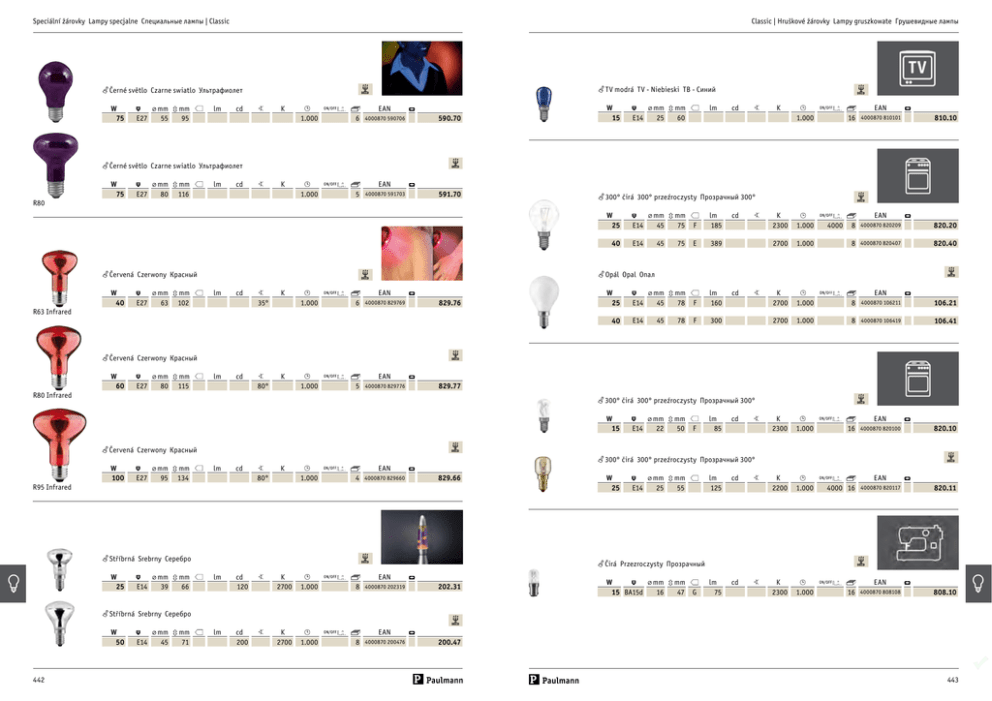 Classic | Hruškové žárovky Lampy gruszkowate Грушевидные лампы Speciální žárovky Lampy specjalne Специальные лампы | Classic 3DXOPDQQ/LJKWɉɚɭɥɦɚɧɧ +7 (495) 410-24-40 / 410-25-95 f Černé světlo Czarne swiatlo Ультрафиолет W 75 ⌀ mm 3 mm E27 55 95 lm cd f TV modrá TV - Niebieski ТВ - Синий DECO 5 K EAN 1.000 6 г. Москва, ул. Выборгская, 411а W 16/1, офис ⌀ mm 3 mm (4й этаж). lm cd ¥ 590.70 4000870 590706 DECO 15 E14 25 5 K 60 EAN 1.000 16 ¥ 810.10 4000870 810101 WEB: http://www.paulmann.su E-mail: [email protected] f Černé světlo Czarne swiatlo Ультрафиолет W 75 E27 ⌀ mm 3 mm 80 116 lm cd DECO 5 K EAN 1.000 5 ¥ 591.70 4000870 591703 R80 f Červená Czerwony Красный W 40 E27 ⌀ mm 3 mm 63 102 cd 5 K 35° EAN 1.000 6 ¥ 829.76 4000870 829769 R63 Infrared f Červená Czerwony Красный W 60 E27 ⌀ mm 3 mm 80 115 W 25 E14 40 E14 ⌀ mm 3 mm 45 75 45 75 F lm 185 E 389 cd 5 DECO K 2300 1.000 EAN 2700 1.000 4000 4000870 820209 820.20 8 4000870 820407 820.40 W 25 E14 40 E14 DECO ⌀ mm 3 mm 45 78 45 78 F lm 160 F 300 cd 5 K 2700 1.000 8 4000870 106211 EAN 106.21 2700 1.000 8 4000870 106419 106.41 lm cd 5 K 80° EAN 1.000 5 ¥ 829.77 4000870 829776 f 300° čirá 300° przeźroczysty Прозрачный 300° W 15 f Červená Czerwony Красный ⌀ mm 3 mm E27 95 134 lm cd 5 K 80° EAN 1.000 4 f Stříbrná Srebrny Cepeбpo E14 ⌀ mm 3 mm 39 66 E14 ⌀ mm 3 mm 22 50 F lm 85 cd 5 DECO K 2300 EAN 1.000 16 ¥ 820.10 4000870 820100 DECO f 300° čirá 300° przeźroczysty Прозрачный 300° 829.66 4000870 829660 cd 120 5 cd 200 5 K 2700 EAN 1.000 8 W 25 E14 ⌀ mm 3 mm 25 55 lm 125 cd 5 K 2200 EAN 1.000 4000 16 f Čirá Przezroczysty Прозрачный DECO lm DECO ¥ R95 Infrared W 25 ¥ DECO R80 Infrared W 100 ¥ 8 f Opál Opal Опал DECO lm f 300° čirá 300° przeźroczysty Прозрачный 300° ¥ 202.31 4000870 202319 W ⌀ mm 3 mm 16 47 G 15 BA15d ¥ 820.11 4000870 820117 DECO lm 75 cd 5 K 2300 EAN 1.000 16 4000870 808108 ¥ 808.10 f Stříbrná Srebrny Cepeбpo DECO W 50 442 ⌀ mm 3 mm E14 45 71 lm K 2700 EAN 1.000 8 4000870 200476 ¥ 200.47 443