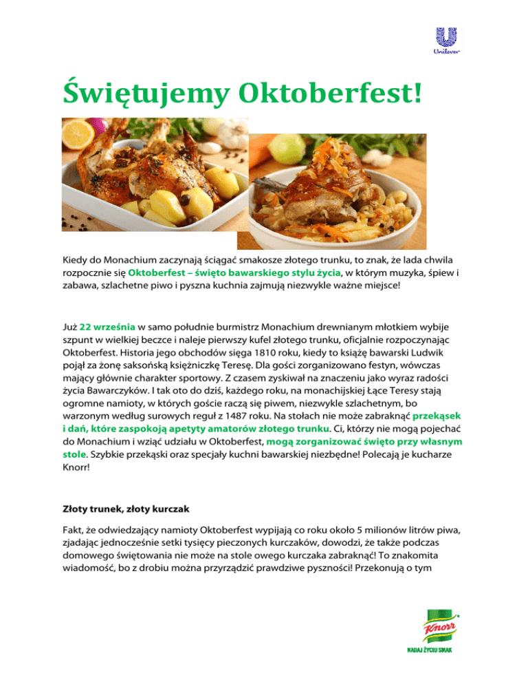 Świętujemy Oktoberfest! Kiedy do Monachium zaczynają ściągać smakosze złotego trunku, to znak, że lada chwila rozpocznie się Oktoberfest – święto bawarskiego stylu życia, w którym muzyka, śpiew i zabawa, szlachetne piwo i pyszna kuchnia zajmują niezwykle ważne miejsce! Już 22 września w samo południe burmistrz Monachium drewnianym młotkiem wybije szpunt w wielkiej beczce i naleje pierwszy kufel złotego trunku, oficjalnie rozpoczynając Oktoberfest. Historia jego obchodów sięga 1810 roku, kiedy to książę bawarski Ludwik pojął za żonę saksońską księżniczkę Teresę. Dla gości zorganizowano festyn, wówczas mający głównie charakter sportowy. Z czasem zyskiwał na znaczeniu jako wyraz radości życia Bawarczyków. I tak oto do dziś, każdego roku, na monachijskiej Łące Teresy stają ogromne namioty, w których goście raczą się piwem, niezwykle szlachetnym, bo warzonym według surowych reguł z 1487 roku. Na stołach nie może zabraknąć przekąsek i dań, które zaspokoją apetyty amatorów złotego trunku. Ci, którzy nie mogą pojechać do Monachium i wziąć udziału w Oktoberfest, mogą zorganizować święto przy własnym stole. Szybkie przekąski oraz specjały kuchni bawarskiej niezbędne! Polecają je kucharze Knorr! Złoty trunek, złoty kurczak Fakt, że odwiedzający namioty Oktoberfest wypijają co roku około 5 milionów litrów piwa, zjadając jednocześnie setki tysięcy pieczonych kurczaków, dowodzi, że także podczas domowego świętowania nie może na stole owego kurczaka zabraknąć! To znakomita wiadomość, bo z drobiu można przyrządzić prawdziwe pyszności! Przekonują o tym kucharze Knorr, proponując przygotowanie zarówno soczystego złotego kurczaka dla większej rzeszy gości, jak i szybkich drobiowych przekąsek. Jeśli mamy nieco więcej czasu na przygotowanie, możemy pokusić się o Kurczaka nadziewanego czy też jeszcze bardziej wykwintnego Kurczaka pieczonego w mleku z orzechami – z pewnością zaspokoją apetyty gości na domowym Oktoberfest! http://www.przepisy.pl/przepis/kurczak-nadziewany-2#szukaj/kurczak pieczony/przepisy http://www.przepisy.pl/przepis/kurczak-pieczony-w-mleku-z-orzechami#szukaj/kurczak pieczony/przepisy Na stole koniecznie muszą się pojawić także drobiowe przekąski – szybkie w przygotowaniu, jeszcze szybciej znikną z talerzy! Chrupiące skrzydełka z kurczaka z dipem BBQ, Paluszki z kurczaka czy Skrzydełka inaczej – to może być naprawdę smakowity wieczór! I to dzięki samodzielnie przygotowanym przekąskom, a nie zamawianym z restauracji fast food. Przepisy to naprawdę proste kulinarne wskazówki, z którymi poradzą sobie nawet mniej wprawni domowi kucharze: http://www.przepisy.pl/przepis/chrupiace-skrzydelka-z-kurczaka-z-dipem-bbq#szukaj/fix chrupery/przepisy http://www.przepisy.pl/przepis/skrzydelka-inaczej#szukaj/fix chrupery/przepisy Przekąski, czyli prosto i smacznie Na takim domowym party nie może też rzecz jasna zabraknąć innych przekąsek, które nadzwyczaj dobrze smakować będą w towarzystwie złotego trunku. Zdawałoby się zwyczajne frytki, odpowiednio przygotowane, koniecznie chrupiące i aromatyczne, okażą się prawdziwym hitem imprezy! Takie właśnie pomoże przygotować Fix Knorr Domowe Frytki, do wyboru z dipem meksykańskim lub czosnkowym. Efekt może być zaskakujący – np. Domowe frytki z salsą pomidorową w mig znikną z talerzy! Dzięki Fixowi szybko przygotujemy również inne przekąski, którymi zaskoczymy gości, jak Pieczone ziemniaki po amerykańsku czy Angielskie ziemniaki fondant: http://www.przepisy.pl/przepis/domowe-frytki-z-salsa-pomidorowa#szukaj/fix domowe frytki/przepisy http://www.przepisy.pl/przepis/pieczone-ziemniaki-po-amerykansku#szukaj/fix domowe frytki/przepisy Po bawarsku! Możemy też jednak trochę zaszaleć i potraktować Oktoberfest jako okazję do poznania kuchni bawarskiej. W tym czasie ona również świętuje – przyjezdni zachwycają się tradycyjnymi potrawami, a lokalni mieszkańcy na nowo doceniają ich niepowtarzalny smak. Podstawą najpopularniejszych dań tej kuchni jest mięso, zarówno wieprzowina, wołowina, baranina, jak i drób. Turyści szczególnie chętnie sięgają po słynną pieczeń wieprzową pieczoną wraz ze skórą, podawaną zawsze z knedlem oraz kapustą. W menu miejscowych restauracji serwujących tradycyjną kuchnię zawsze znajdzie się także rolada z boczku w sosie pieczeniowym, golonka po bawarsku i pasztet wątrobiany. Zgodnie ze starą bawarską recepturą przyrządzana jest tu ponadto biała kiełbasa, czyli Weiswurst. Co prawda, owych tradycyjnych receptur nie odtworzymy we własnej kuchni, ale kucharze Knorr polecają przepisy, które przybliżą nam bawarskie smaki podczas domowego przyjęcia. I tak oto zdradzają sposób na Golonkę po bawarsku czy Kiszoną kapustę na sposób bawarski. Nastrój święta pomoże wprowadzić także Biała kiełbasa w sosie piwnym: http://www.przepisy.pl/przepis/golonka-po-bawarsku#szukaj/bawarska/przepisy http://www.przepisy.pl/przepis/kiszona-kapusta-na-sposob-bawarski#szukaj/bawarska/przepisy http://www.przepisy.pl/przepis/biala-kielbasa-w-sosie-piwnym#szukaj/biała kiełbasa/przepisy Przepisy i porady, w jaki sposób przygotować potrawy na domowy Oktoberfest, znajdziecie na www.przepisy.pl oraz na profilu na Facebooku http://www.facebook.com/przepisypl lub w postaci wideo na kanale „Przepisy.pl” na You Tube http://www.youtube.com/user/codzisnaobiad. Przepisy są również dostępne za pośrednictwem bezpłatnej aplikacji mobilnej Przepisy.pl. Kontakt prasowy: Joanna Szałasz specjalista public relations e-mail: [email protected] tel.: +48 536 410 824 Anna Bielecka PR manager e-mail: [email protected] tel.: +48 22 570 65 21