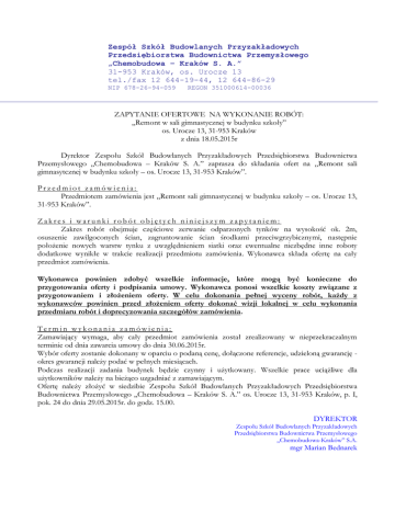 Zespół Szkół Budowlanych Przyzakładowych Przedsiębiorstwa Budownictwa Przemysłowego „Chemobudowa – Kraków S. A.” 31-953 Kraków, os. Urocze 13 tel./fax 12 644-19-44, 12 644-86-29 NIP 678-26-94-059 REGON 351000614-00036 ZAPYTANIE OFERTOWE NA WYKONANIE ROBÓT: „Remont w sali gimnastycznej w budynku szkoły” os. Urocze 13, 31-953 Kraków z dnia 18.05.2015r Dyrektor Zespołu Szkół Budowlanych Przyzakładowych Przedsiębiorstwa Budownictwa Przemysłowego „Chemobudowa – Kraków S. A.” zaprasza do składania ofert na „Remont sali gimnasytcznej w budynku szkoły – os. Urocze 13, 31-953 Kraków”. Przedmiot zamówienia: Przedmiotem zamówienia jest „Remont sali gimnastycznej w budynku szkoły – os. Urocze 13, 31-953 Kraków”. Zakres i warunki robót objętych niniejszym zapytaniem: Zakres robót obejmuje częściowe zerwanie odparzonych tynków na wysokość ok. 2m, osuszenie zawilgoconych ścian, zagruntowanie ścian środkami przeciwgrzybicznymi, następnie położenie nowych warstw tynku z uwzględnieniem siatki oraz ewentualne niezbędne inne roboty dodatkowe wynikłe w trakcie realizacji przedmiotu zamówienia. Wykonawca składa ofertę na cały przedmiot zamówienia. Wykonawca powinien zdobyć wszelkie informacje, które mogą być konieczne do przygotowania oferty i podpisania umowy. Wykonawca ponosi wszelkie koszty związane z przygotowaniem i złożeniem oferty. W celu dokonania pełnej wyceny robót, każdy z wykonawców powinien przed złożeniem oferty dokonać wizji lokalnej w celu wykonania przedmiaru robót i doprecyzowania szczegółów zamówienia. Termin wykonania zamówienia: Zamawiający wymaga, aby cały przedmiot zamówienia został zrealizowany w nieprzekraczalnym terminie od dnia zawarcia umowy do dnia 30.06.2015r. Wybór oferty zostanie dokonany w oparciu o podaną cenę, dołączone referencje, udzieloną gwarancję okres gwarancji należy podać w pełnych miesiącach. Podczas realizacji zadania budynek będzie czynny i użytkowany. Wszelkie prace uciążliwe dla użytkowników należy na bieżąco uzgadniać z zamawiającym. Ofertę należy złożyć w siedzibie Zespołu Szkół Budowlanych Przyzakładowych Przedsiębiorstwa Budownictwa Przemysłowego „Chemobudowa – Kraków S. A.” os. Urocze 13, 31-953 Kraków, p. I, pok. 24 do dnia 29.05.2015r. do godz. 15.00. DYREKTOR Zespołu Szkół Budowlanych Przyzakładowych Przedsiębiorstwa Budownictwa Przemysłowego „Chemobudowa-Kraków” S.A. mgr Marian Bednarek