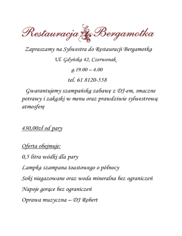 Zapraszamy na Sylwestra do Restauracji Bergamotka tel. 61 8120