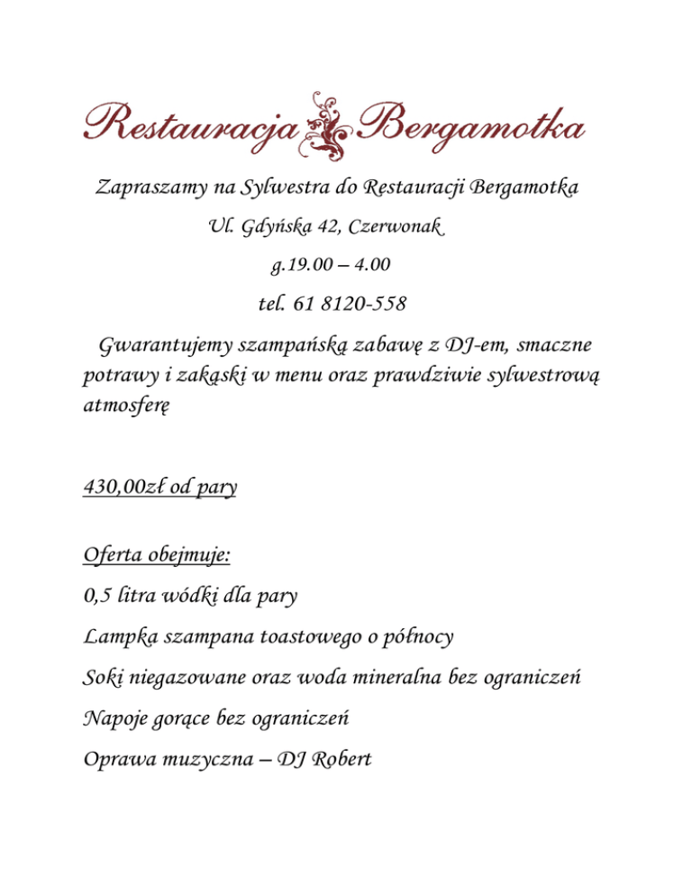 Zapraszamy na Sylwestra do Restauracji Bergamotka Ul. Gdyńska 42, Czerwonak g.19.00 – 4.00 tel. 61 8120-558 Gwarantujemy szampańską zabawę z DJ-em, smaczne potrawy i zakąski w menu oraz prawdziwie sylwestrową atmosferę 430,00zł od pary Oferta obejmuje: 0,5 litra wódki dla pary Lampka szampana toastowego o północy Soki niegazowane oraz woda mineralna bez ograniczeń Napoje gorące bez ograniczeń Oprawa muzyczna – DJ Robert Menu sylwestrowe Rukola z opiekaną fetą w orzechach laskowych i mango w lekkim dressingu Przystawka: zupa serowa z kurczakiem na białym winie z chmurką mascarpone i pestkami dyni Zupa: wołowina faszerowana borowikami i czosnkiem podana z kluskami śląskimi, buraczkami i pieczoną papryką Danie ciepłe: Deser: czekoladowe ciasteczko z lodami śmietankowymi i sosem wiśniowym Zakąska 3 porcje/osoba: Timbalki Rostbef po angielsku podany z chrzanem Szparagi zawinięte w szynkę podane na sałatce jarzynowej Pasztet z sosem cumberland Koreczki śledziowe Schab z podgrzybkami otulony szynką parmeńską Pierś z kurczaka z brokułami Świeże sałaty z dressingiem Kolacja ciepła podana ok. 2.00 Barszcz czerwony Flaczki Golonka gotowana Udko faszerowane suszonymi pomidorami ,szpinakiem oraz serem gorgonzola
