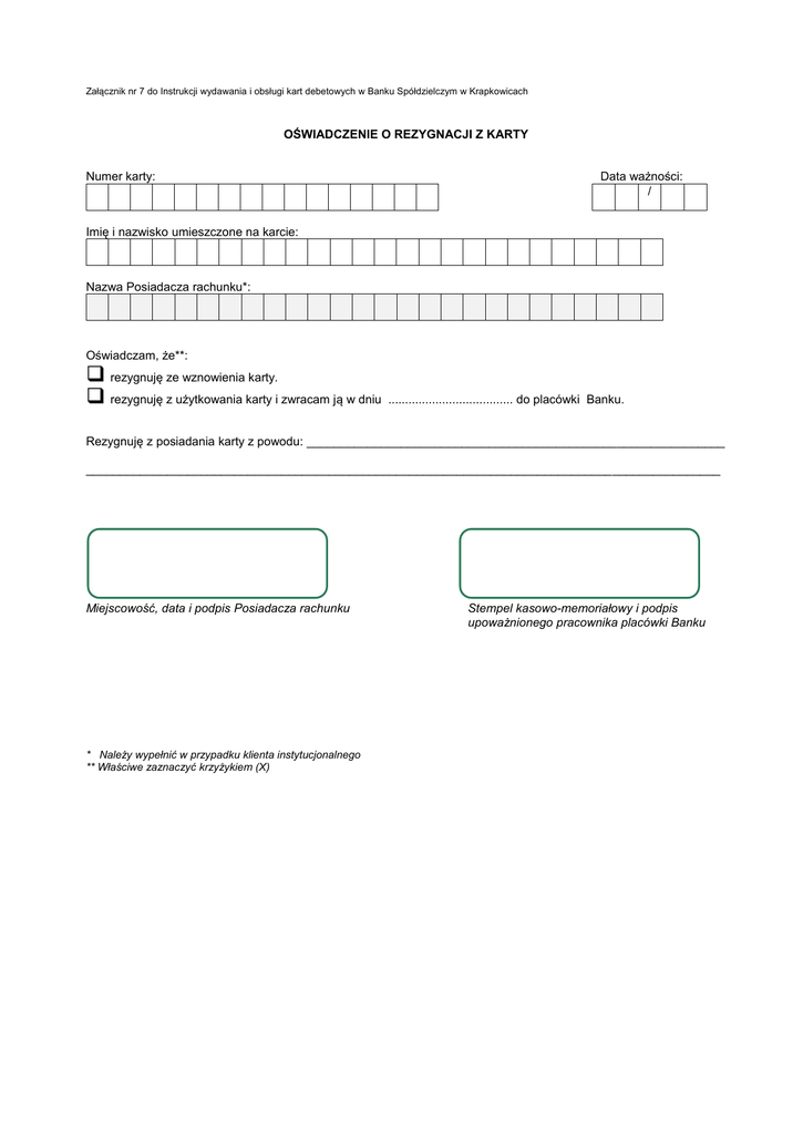 Załącznik nr 7 do Instrukcji wydawania i obsługi kart debetowych w Banku Spółdzielczym w Krapkowicach OŚWIADCZENIE O REZYGNACJI Z KARTY Numer karty: Data ważności: / Imię i nazwisko umieszczone na karcie: Nazwa Posiadacza rachunku*: Oświadczam, że**: rezygnuję ze wznowienia karty. rezygnuję z użytkowania karty i zwracam ją w dniu ..................................... do placówki Banku. Rezygnuję z posiadania karty z powodu: ______________________________________________________________ ______________________________________________________________________________________________ Miejscowość, data i podpis Posiadacza rachunku * Należy wypełnić w przypadku klienta instytucjonalnego ** Właściwe zaznaczyć krzyżykiem (X) Stempel kasowo-memoriałowy i podpis upoważnionego pracownika placówki Banku