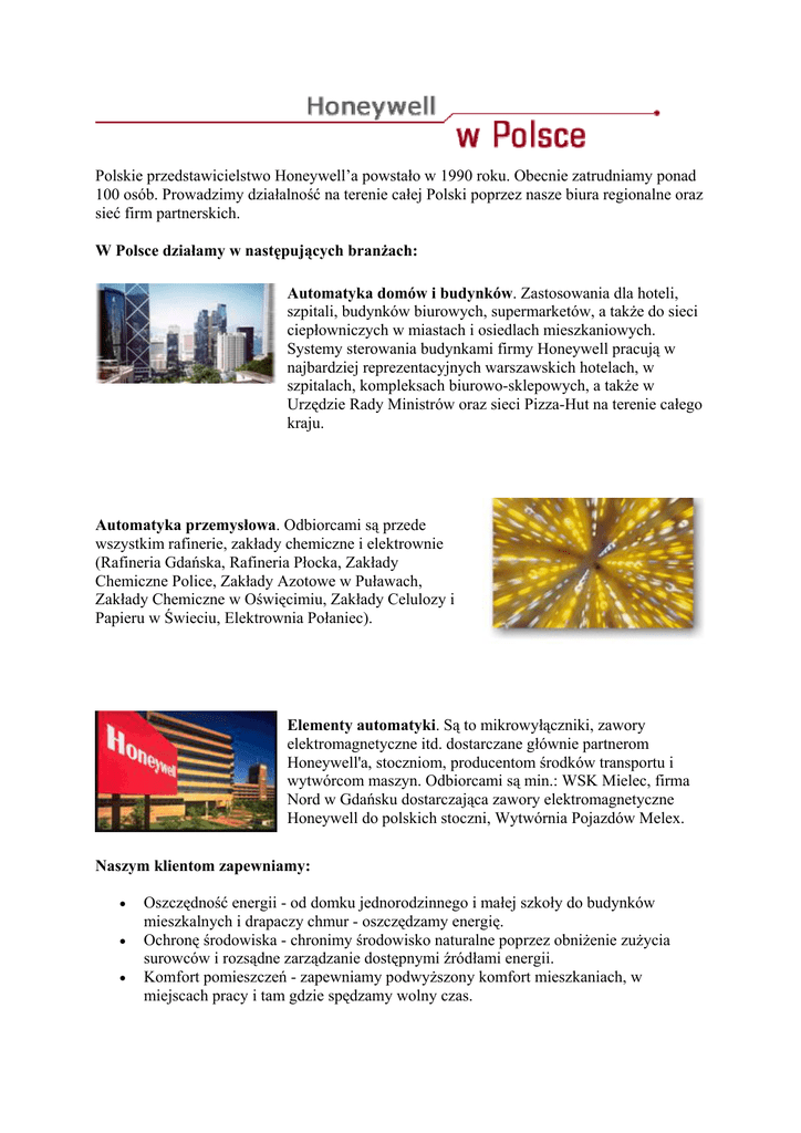 Polskie przedstawicielstwo Honeywell’a powstało w 1990 roku. Obecnie zatrudniamy ponad 100 osób. Prowadzimy działalność na terenie całej Polski poprzez nasze biura regionalne oraz sieć firm partnerskich. W Polsce działamy w następujących branżach: Automatyka domów i budynków. Zastosowania dla hoteli, szpitali, budynków biurowych, supermarketów, a także do sieci ciepłowniczych w miastach i osiedlach mieszkaniowych. Systemy sterowania budynkami firmy Honeywell pracują w najbardziej reprezentacyjnych warszawskich hotelach, w szpitalach, kompleksach biurowo-sklepowych, a także w Urzędzie Rady Ministrów oraz sieci Pizza-Hut na terenie całego kraju. Automatyka przemysłowa. Odbiorcami są przede wszystkim rafinerie, zakłady chemiczne i elektrownie (Rafineria Gdańska, Rafineria Płocka, Zakłady Chemiczne Police, Zakłady Azotowe w Puławach, Zakłady Chemiczne w Oświęcimiu, Zakłady Celulozy i Papieru w Świeciu, Elektrownia Połaniec). Elementy automatyki. Są to mikrowyłączniki, zawory elektromagnetyczne itd. dostarczane głównie partnerom Honeywell'a, stoczniom, producentom środków transportu i wytwórcom maszyn. Odbiorcami są min.: WSK Mielec, firma Nord w Gdańsku dostarczająca zawory elektromagnetyczne Honeywell do polskich stoczni, Wytwórnia Pojazdów Melex. Naszym klientom zapewniamy: • • • Oszczędność energii - od domku jednorodzinnego i małej szkoły do budynków mieszkalnych i drapaczy chmur - oszczędzamy energię. Ochronę środowiska - chronimy środowisko naturalne poprzez obniżenie zużycia surowców i rozsądne zarządzanie dostępnymi źródłami energii. Komfort pomieszczeń - zapewniamy podwyższony komfort mieszkaniach, w miejscach pracy i tam gdzie spędzamy wolny czas. • • Zwiększone bezpieczeństwo - także w powietrzu chronimy ludzi i dbamy o ich poczucie pełnego komfortu. Doskonalenie procesów produkcyjnych - jesteśmy z naszymi produktami w większości zakładów przemysłowych w celu obniżenia kosztów i podwyższenia wydajności produkcji. Historia • • • • • • • • Lata sześćdziesiąte: kontakty Honeywell'a z polskimi zakładami przemysłu chemicznego, rafineryjnego i naftowego (systemy kontrolujące przetwórstwo ropy naftowej, produkcję leków, nawozów sztucznych, papieru). Lata siedemdziesiąte: poszerzenie działalności o produkty automatyki domów i budynków, dostarczenie pierwszych systemów ogrzewania, wentylacji i klimatyzacji dla warszawskich hoteli. 1972: przyznanie licencji firmie Mera - Pnefal na produkcję elektronicznego, analogowego systemu sterowania przemysłowego Vutronik oraz na montaż i produkcję przetworników Class 41. 1990: otwarcie przedstawicielstwa Honeywell w Warszawie. 1993: przekształcenie przedstawicielstwa w Honeywell Sp. z o.o. - spółkę prawa polskiego. 1996: uzyskanie certyfikatu potwierdzającego wdrożenie normy ISO 9001. 1997: otwarcie oddziału firmy w Gdańsku (obsługa klientów w zakresie automatyki domów i budynków) i we Wrocławiu (obsługa klientów w zakresie automatyki przemysłowej). 1999: otwarcie oddziału firmy na Śląsku (obsługa klientów w zakresie automatyki budynków). Biuro Warszawskie Honeywell ul. Domaniewska 41 (budynek Mars), 02-672 Warszawa, tel. centrali: (0-22) 60 60 900.