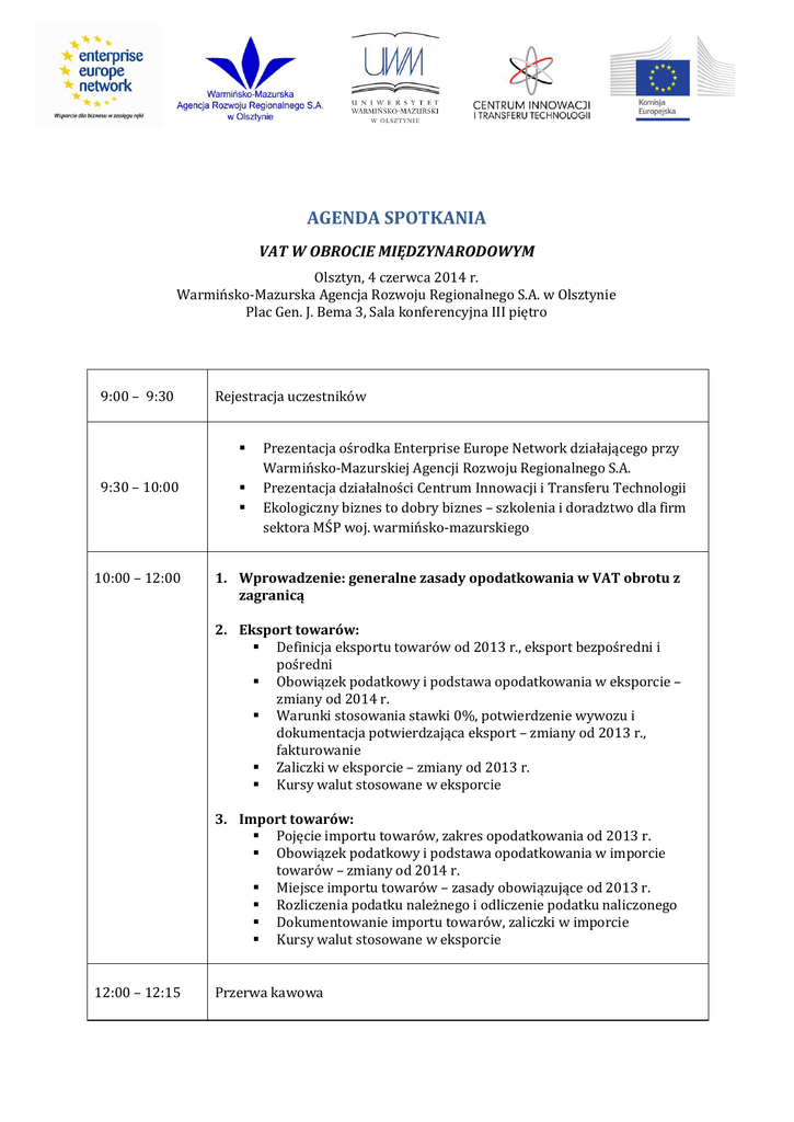 AGENDA SPOTKANIA VAT W OBROCIE MIĘDZYNARODOWYM Olsztyn, 4 czerwca 2014 r. Warmińsko-Mazurska Agencja Rozwoju Regionalnego S.A. w Olsztynie Plac Gen. J. Bema 3, Sala konferencyjna III piętro 9:00 – 9:30 Rejestracja uczestników 9:30 – 10:00 10:00 – 12:00 Prezentacja ośrodka Enterprise Europe Network działającego przy Warmińsko-Mazurskiej Agencji Rozwoju Regionalnego S.A. Prezentacja działalności Centrum Innowacji i Transferu Technologii Ekologiczny biznes to dobry biznes – szkolenia i doradztwo dla firm sektora MŚP woj. warmińsko-mazurskiego 1. Wprowadzenie: generalne zasady opodatkowania w VAT obrotu z zagranicą 2. Eksport towarów: Definicja eksportu towarów od 2013 r., eksport bezpośredni i pośredni Obowiązek podatkowy i podstawa opodatkowania w eksporcie – zmiany od 2014 r. Warunki stosowania stawki 0%, potwierdzenie wywozu i dokumentacja potwierdzająca eksport – zmiany od 2013 r., fakturowanie Zaliczki w eksporcie – zmiany od 2013 r. Kursy walut stosowane w eksporcie 3. Import towarów: Pojęcie importu towarów, zakres opodatkowania od 2013 r. Obowiązek podatkowy i podstawa opodatkowania w imporcie towarów – zmiany od 2014 r. Miejsce importu towarów – zasady obowiązujące od 2013 r. Rozliczenia podatku należnego i odliczenie podatku naliczonego Dokumentowanie importu towarów, zaliczki w imporcie Kursy walut stosowane w eksporcie 12:00 – 12:15 Przerwa kawowa 12:15 – 14:15 4. Wewnątrzwspólnotowa dostawa towarów i wewnątrzwspólnotowe nabycie towarów: Definicje WDT i WNT w przepisach wspólnotowych i krajowych Warunki uznania transakcji za wewnątrzwspólnotową/ wyłączenie z WDT i WNT – zmiany od kwietnia 2013 r. Dostawa towarów, dla których podatnikiem jest polski nabywca – zmiany od kwietnia 2013 r. Obowiązek podatkowy i podstawa opodatkowania w WDT/WNT w 2013 i 2014 r. Stosowanie stawki 0% do WDT – warunki formalne i dokumentowanie, weryfikacja kontrahenta Ewidencjonowanie WDT i WNT, korygowanie deklaracji i informacji podsumowujących Faktura VAT przy WDT i WNT oraz przeliczanie kursów walut – zmiany od 2013 r. Zaliczki w WDT i WNT od 2013 r./ korekty podstaw opodatkowania – dokumentacja 5. Usługi w obrocie międzynarodowym: Miejsce świadczenia usług – zasady ogólne i regulacje szczególne w 2013 r. Definicja podatnika na potrzeby importu usług – zmiany od kwietnia 2013 r. Weryfikacja kontrahentów na potrzeby świadczenia usług transgranicznych Obowiązek podatkowy w imporcie usług w 2013 i 2014 r./ usługi ciągłe, zaliczki, refakturowanie Dokumentowanie i ewidencjonowanie, zmiany w zakresie fakturowania od 2013 r., przeliczanie kursów walut 6. Transakcje łańcuchowe i trójstronne Transakcje łańcuchowe – zmiany od 2013 r. Transakcje trójstronne – warunki stosowania i przykłady 14:15 – 14:30 Podsumowanie szkolenia, pytania do eksperta 14:30 – 15:00 Lunch PRELEGENT: Szymon Czerwiński, Doradca podatkowy, absolwent Wydziału Prawa i Administracji Uniwersytetu Warszawskiego, oczekuje na wpis na listę adwokatów, Partner w Polish Tax Institute. Posiada doświadczenie w pracy w kancelariach prawnych, spółkach doradztwa podatkowego oraz podmiotach inwestycyjnych. Szymon specjalizuje się w doradztwie podatkowym dotyczącym projektów inwestycyjnych i restrukturyzacyjnych, jak również w obszarze optymalizacji podatkowej i cen transferowych. Szymon jest jednym z nielicznych w Polsce posiadaczy międzynarodowego tytułu Advanced Diploma in International Taxation. Jest on również uczestnikiem seminarium doktoranckiego z zakresu prawa podatkowego i autorem kilkudziesięciu artykułów i komentarzy o tematyce prawnej i podatkowej. Prowadzi wykłady i szkolenia nt. krajowego i międzynarodowego prawa podatkowego, cen transferowych oraz aspektów międzynarodowych umów handlowych.