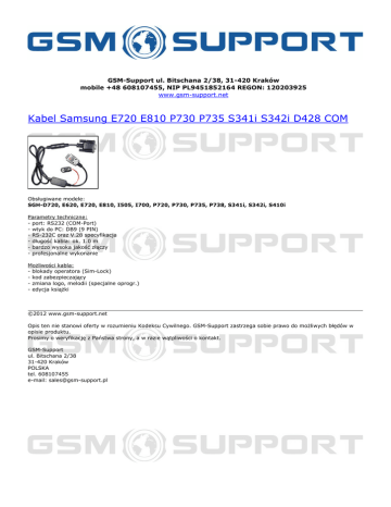 GSM-Support ul. Bitschana 2/38, 31-420 Kraków mobile +48 608107455, NIP PL9451852164 REGON: 120203925 www.gsm-support.net Kabel Samsung E720 E810 P730 P735 S341i S342i D428 COM Obsługiwane modele: SGH-D720, E620, E720, E810, I505, I700, P720, P730, P735, P738, S341i, S342i, S410i Parametry techniczne: - port: RS232 (COM-Port) - wtyk do PC: DB9 (9 PIN) - RS-232C oraz V.28 specyfikacja - długość kabla: ok. 1.0 m - bardzo wysoka jakość złączy - profesjonalne wykonanie Możliwości kabla: - blokady operatora (Sim-Lock) - kod zabezpieczający - zmiana logo, melodii (specjalne oprogr.) - edycja książki ©2012 www.gsm-support.net Opis ten nie stanowi oferty w rozumieniu Kodeksu Cywilnego. GSM-Support zastrzega sobie prawo do możliwych błędów w opisie produktu. Prosimy o weryfikację z Państwa strony, a w razie wątpliwości o kontakt. GSM-Support ul. Bitschana 2/38 31-420 Kraków POLSKA tel. 608107455 e-mail: [email protected] Powered by TCPDF (www.tcpdf.org)