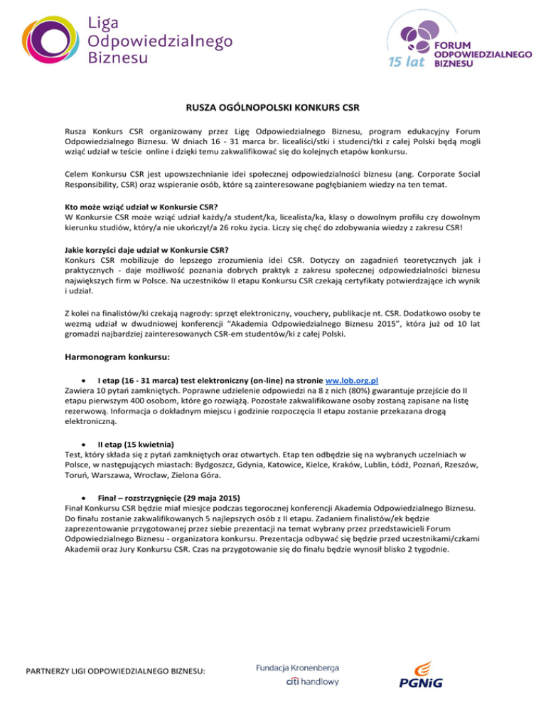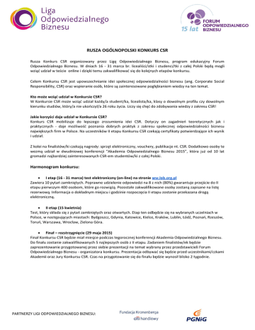 RUSZA OGÓLNOPOLSKI KONKURS CSR Rusza Konkurs CSR organizowany przez Ligę Odpowiedzialnego Biznesu, program edukacyjny Forum Odpowiedzialnego Biznesu. W dniach 16 - 31 marca br. licealiści/stki i studenci/tki z całej Polski będą mogli wziąć udział w teście online i dzięki temu zakwalifikować się do kolejnych etapów konkursu. Celem Konkursu CSR jest upowszechnianie idei społecznej odpowiedzialności biznesu (ang. Corporate Social Responsibility, CSR) oraz wspieranie osób, które są zainteresowane pogłębianiem wiedzy na ten temat. Kto może wziąć udział w Konkursie CSR? W Konkursie CSR może wziąć udział każdy/a student/ka, licealista/ka, klasy o dowolnym profilu czy dowolnym kierunku studiów, który/a nie ukończył/a 26 roku życia. Liczy się chęć do zdobywania wiedzy z zakresu CSR! Jakie korzyści daje udział w Konkursie CSR? Konkurs CSR mobilizuje do lepszego zrozumienia idei CSR. Dotyczy on zagadnień teoretycznych jak i praktycznych - daje możliwość poznania dobrych praktyk z zakresu społecznej odpowiedzialności biznesu największych firm w Polsce. Na uczestników II etapu Konkursu CSR czekają certyfikaty potwierdzające ich wynik i udział. Z kolei na finalistów/ki czekają nagrody: sprzęt elektroniczny, vouchery, publikacje nt. CSR. Dodatkowo osoby te wezmą udział w dwudniowej konferencji “Akademia Odpowiedzialnego Biznesu 2015”, która już od 10 lat gromadzi najbardziej zainteresowanych CSR-em studentów/ki z całej Polski. Harmonogram konkursu: I etap (16 - 31 marca) test elektroniczny (on-line) na stronie ww.lob.org.pl Zawiera 10 pytań zamkniętych. Poprawne udzielenie odpowiedzi na 8 z nich (80%) gwarantuje przejście do II etapu pierwszym 400 osobom, które go rozwiążą. Pozostałe zakwalifikowane osoby zostaną zapisane na listę rezerwową. Informacja o dokładnym miejscu i godzinie rozpoczęcia II etapu zostanie przekazana drogą elektroniczną. II etap (15 kwietnia) Test, który składa się z pytań zamkniętych oraz otwartych. Etap ten odbędzie się na wybranych uczelniach w Polsce, w następujących miastach: Bydgoszcz, Gdynia, Katowice, Kielce, Kraków, Lublin, Łódź, Poznań, Rzeszów, Toruń, Warszawa, Wrocław, Zielona Góra. Finał – rozstrzygnięcie (29 maja 2015) Finał Konkursu CSR będzie miał miesjce podczas tegorocznej konferencji Akademia Odpowiedzialnego Biznesu. Do finału zostanie zakwalifikowanych 5 najlepszych osób z II etapu. Zadaniem finalistów/ek będzie zaprezentowanie przygotowanej przez siebie prezentacji na temat wybrany przez przedstawicieli Forum Odpowiedzialnego Biznesu - organizatora konkursu. Prezentacja odbywać się będzie przed uczestnikami/czkami Akademii oraz Jury Konkursu CSR. Czas na przygotowanie się do finału będzie wynosił blisko 2 tygodnie. PARTNERZY LIGI ODPOWIEDZIALNEGO BIZNESU: Liga Odpowiedzialnego Biznesu to program edukacyjny Forum Odpowiedzialnego Biznesu budujący nowe kadry menedżerów i przedsiębiorców, animatorów społecznych, liderów zmian i przede wszystkim odpowiedzialnych ludzi. LOB tworzy grupa studentów i studentek – Ambasadorów i Ambasadorek CSR w lokalnych środowiskach. Poprzez różnorodne projekty realizowane przez organizacje w całej Polsce LOB dociera do osób i instytucji zainteresowanych poszerzaniem wiedzy z zakresu dobrych praktyk biznesowych. Więcej informacji o konkursie udziela koordynatorka Ligi Odpowiedzialnego Biznesu Aleksandra Nowak [email protected] Ligę Odpowiedzialnego Biznesu wspierają: Partnerzy LOB: Fundacja Kronenberga przy Citi Handlowy, PGNiG Partnerzy Konkursu: Henkel, Polpharma Patron honorowy: Ministerstwo Nauki i Szkolnictwa Wyższego, Ministerstwo Gospodarki Patroni medialni: CR Navigator, Manko.pl, Kariera.com.pl, odpowiedzialnybiznes.pl, biznes.pl, dlaStudenta.pl, eurostudent.pl, kampaniespoleczne.pl, studentnews.pl, Semestr.pl, gazetapraca.pl, ekorynek.com, WeAre.pl PARTNERZY LIGI ODPOWIEDZIALNEGO BIZNESU: