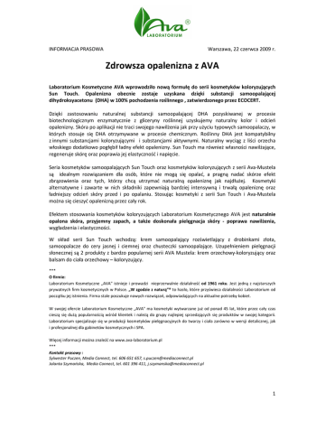 INFORMACJA PRASOWA Warszawa, 22 czerwca 2009 r. Zdrowsza opalenizna z AVA Laboratorium Kosmetyczne AVA wprowadziło nową formułę do serii kosmetyków koloryzujących Sun Touch. Opalenizna obecnie zostaje uzyskana dzięki substancji samoopalającej dihydroksyacetonu (DHA) w 100% pochodzenia roślinnego , zatwierdzonego przez ECOCERT. Dzięki zastosowaniu naturalnej substancji samoopalającej DHA pozyskiwanej w procesie biotechnologicznym enzymatycznie z gliceryny roślinnej uzyskujemy naturalny kolor i odcień opalenizny. Skóra po aplikacji nie traci swojego nawilżenia jak przy użyciu typowych samoopalaczy, w których stosuje się DHA otrzymywane w procesie chemicznym. Roślinny DHA jest kompatybilny z innymi substancjami koloryzującymi i substancjami aktywnymi. Naturalny wyciąg z liści orzecha włoskiego dodatkowo pogłębił ładny efekt opalenizny. Sun Touch ma również własności nawilżające, regeneruje skórę oraz poprawia jej elastyczność i napięcie. Seria kosmetyków samoopalających Sun Touch oraz kosmetyków koloryzujących z serii Ava-Mustela są idealnym rozwiązaniem dla osób, które nie mogą się opalać, a pragną nadać skórze efekt zbrązowienia oraz tych, którzy chcą utrzymać naturalną opaleniznę jak najdłużej. Kosmetyki alternatywne i zawarte w nich składniki zapewniają bardziej intensywną i trwałą opaleniznę oraz ładniejszy odcień skóry przed i po opalaniu. Stosując kosmetyki z serii Sun Touch i Ava-Mustela można się cieszyć opalenizną przez cały rok. Efektem stosowania kosmetyków koloryzujących Laboratorium Kosmetycznego AVA jest naturalnie opalona skóra, przyjemny zapach, a także doskonała pielęgnacja skóry - poprawa nawilżenia, wygładzenia i elastyczności. W skład serii Sun Touch wchodzą: krem samoopalający rozświetlający z drobinkami złota, samoopalacze do cery jasnej i ciemnej oraz chusteczki samoopalające. Uzupełnieniem pielęgnacji słonecznej są 2 produkty z bardzo popularnej serii AVA Mustela: krem orzechowy-koloryzujący oraz balsam do ciała orzechowy – koloryzujący. *** O firmie: Laboratorium Kosmetyczne „AVA" istnieje i prowadzi nieprzerwalnie działalność od 1961 roku. Jest jedną z najstarszych prywatnych firm kosmetycznych w Polsce. „W zgodzie z naturą”® to hasło, które przyświeca działalności Laboratorium od początku jej istnienia. Firma stale poszukuje nowych rozwiązań, odpowiadających na aktualne potrzeby kobiet. W swojej ofercie Laboratorium Kosmetyczne „AVA" ma kosmetyki wytwarzane już od ponad 45 lat, które przez cały czas cieszą się dużą popularnością wśród klientek i należą do grupy najlepiej sprzedających się produktów w swojej kategorii. Laboratorium specjalizuje się w produkcji kosmetyków pielęgnacyjnych do twarzy i ciała zarówno w wersji detalicznej, jak i profesjonalnej dla gabinetów kosmetycznych i SPA. Więcej informacji można znaleźć na www.ava-laboratorium.pl *** Kontakt prasowy : Sylwester Puczen, Media Connect, tel. 606 651 657, [email protected] Jolanta Szymańska, Media Connect, tel. 601 396 411, [email protected] 1 Kosmetyki z serii Sun Touch Krem samoopalający rozświetlający z drobinkami złota poj.: 75 ml, sugerowana cena: 16,50 zł Kosmetyk łączy w sobie właściwości pielęgnujące, odżywiające oraz barwiące i rozświetlające skórę. Efekt opalenizny uzyskany został m.in. dzięki naturalnym surowcom, w tym wyciągowi z liści orzecha włoskiego. W recepturze kosmetyku znajdują się także drobinki złota, które rozświetlają skórę, eksponują jej barwę i podnoszą atrakcyjność wyglądu. Krem wzbogacony został również w wit. E i alantoinę. Nawilża, regeneruje skórę oraz poprawia jej elastyczność i napięcie. Krem rozświetlający SUN TOUCH jest adresowany do tych Pań, które chcą utrwalić i podkreślić letnią opaleniznę, a także tych, które nie powinny się opalać, a pragną nadać skórze efektowny koloryt. Samoopalacz do cery jasnej i ciemnej poj.: 75 ml, sugerowana cena: 14,50 zł Lekka emulsja powodująca równomierne zabarwienie skóry twarzy i całego ciała w odcieniu złotym dobrze imitującym naturalną opaleniznę. Zawiera witaminę E i alantoinę. Doskonale pielęgnuje, nawilża i regeneruje skórę. Zapewnia efekt pięknej, trwałej opalenizny przez cały rok, bez potrzeby przebywania na słońcu. Wchłania się bardzo dobrze nie pozostawiając błyszczącej skóry. Zabarwienie utrzymuje się od 3 do 8 dni. Ustępuje równomiernie nie pozostawiając "zacieków". Samoopalacz przeznaczony jest dla każdej cery. Chusteczka samoopalająca sugerowana cena: 1,90 zł Efekt opalenizny bez udziału słońca. Wygodne, jednorazowe chusteczki samoopalające SUN TOUCH. Polecane do stosowania na twarz i całe ciało. Chusteczka nasączona czynnikiem brązującym łatwo i równomiernie rozprowadza się na skórze, szybko wchłania i nie pozostawia smug. Zapewnia efekt jednolitej opalenizny nawet na jasnej i wrażliwej skórze. Zawiera d-pantenol i alantoinę. Nawilża, łagodzi podrażnienia i chroni skórę przed wysuszeniem. Posiada delikatną kompozycję hypoalergiczną. Nie zawiera alkoholu. 2 Kosmetyki koloryzujące z serii AVA-Mustela Krem orzechowy-koloryzujący poj.: 30 ml, sugerowana cena: 16,50 zł Wygodny w użyciu kosmetyk, którego nie może zabraknąć w damskiej kosmetyczce. Łagodny krem na dzień, który spełnia jednocześnie 5 funkcji nawilża, lekko natłuszcza, wygładza, odżywia skórę twarzy, szyi i dekoltu nadając jej jednocześnie kolor ładnej, zdrowej i naturalnej opalenizny. Wyprodukowany na bazie naturalnych surowców, nie zawiera sztucznych barwników ani konserwantów. Efekt zbrązowienia skóry wywołują koloryzujące ekstrakty roślinne - z orzecha włoskiego i marchewki, bardzo bogate w prowitaminę A, witaminy C, B1, B2. Po jego zastosowaniu skóra odzyskuje elastyczność, miękkość, gładkość oraz zdrowy, młody wygląd. Przeznaczony jest dla 