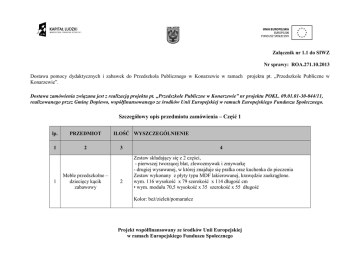 Załącznik nr 1.1 do SIWZ Nr sprawy: ROA.271.10.2013 Dostawa pomocy dydaktycznych i zabawek do Przedszkola Publicznego w Konarzewie w ramach projektu pt. „Przedszkole Publiczne w Konarzewie”. Dostawa zamówienia związana jest z realizacją projektu pt. „Przedszkole Publiczne w Konarzewie” nr projektu POKL. 09.01.01-30-044/11, realizowanego przez Gminę Dopiewo, współfinansowanego ze środków Unii Europejskiej w ramach Europejskiego Funduszu Społecznego. Szczegółowy opis przedmiotu zamówienia – Część 1 lp. PRZEDMIOT 1 2 1 Meble przedszkolne – dziecięcy kącik zabawowy ILOŚĆ WYSZCZEGÓLNIENIE 3 2 4 Zestaw składający się z 2 części, - pierwszej tworzącej blat, zlewozmywak i zmywarkę - drugiej wysuwanej, w której znajduje się pralka oraz kuchenka do pieczenia Zestaw wykonany z płyty typu MDF lakierowanej, krawędzie zaokrąglone. wym. 116 wysokość x 79 szerokość x 114 długość cm • wym. modułu 70,5 wysokość x 35 szerokość x 55 długość Kolor: beż/zieleń/pomarańcz Projekt współfinansowany ze środków Unii Europejskiej w ramach Europejskiego Funduszu Społecznego Zestaw mebli przedszkolnych o dł. od 3,72 m do 4 m W skład zestawu wchodzą: 1. szafka mała leżąca na szuflady, dostosowana do dwóch szerokich szuflad. Kolor- biały • wym. 90,6(WYS.) x 40(SZER.) x 50(GŁĘB.) cm- 2 szt. 2. szafka kwadrat z półkami, wyposażona w 2 małe półeczki w górnej części mebla i jedną dużą półkę w dolnej części, możliwość zamontowania drzwiczek małych w dolnej i/lub górnej części – 4 szt. • wym. 90,6 x 40 x 90,4 cm, kolor biały 3. mała szafka stojąca, szafka posiada 2 półki, możliwość zamontowania średnich drzwiczek , kolor biały • wym. 50,3 x 40 x 90,4 cm, 2 szt. 2 Zestaw mebli przedszkolnych 2 4. regał wysoki, Wyposażony w 4 półki, 3 z możliwością regulacji wysokości. Kolor biały • wym. 50 x 35 x 170 cm, 2 szt. 5. małe drzwi pojedyncze, drzwi wymiarem dopasowane do szafki kwadrat + uchwyty w kształcie kwadratu- 8 szt. kolor- 4 szt.- pomarańczowejasne, 4 szt.- kolor-pomarańczowy- ciemny • 8 szt. • wym. 44,8 x 40 cm 6. szuflada szeroka, szuflady dopasowane wymiarem do szafki małej leżącej+ uchwyty w kształcie kwadratu- 4 szt. kolor- 2 szt. żółte, 2 szt.jasna zieleń • 4 szt. • wym. 89,9 x 36,5 x 19,8 cm Projekt współfinansowany ze środków Unii Europejskiej w ramach Europejskiego Funduszu Społecznego 7. Drzwi średnie, Drzwi dopasowane wymiarem do szafki małej stojącej. • 2 szt. + uchwyty w kształcie kwadratu- 2 szt. kolor- żółty • wym. 49,9 x 80 cm POJEMNIK NA KSIĄŻKI NA KÓŁKACH 3 4 5 Meble przedszkolne – szafka na książki Domek plastikowy Piaskownica 2 1 2 Szafka na książki- wym. wym. 74( wys.) x 40( szer.) x 70 ( głęb.)cm, wykonany z płyt MDF- kolor- sosna, brzoza z elementami- zieleni, czerwieni i żółci. Różnokolorowy domek ogrodowy wykonany z kolorowego tworzywa, posiadający 4 pary ruchomych okiennic, drzwi. Domek ogrodowy- wym. Wysokość 127 cm. x szerokość 114 cm. x głębokość 131 cm. Piaskownica drewniana Piaskownica o wym. 200 cm x 200 cm x 20 cm - wykonana z wysokiej jakości drewna, odpowiednio zabezpieczonego przed działaniem szkodliwych czynników zewnętrznych, siedziska z desek lub sklejki wodoodpornej. Kolor drewna: brak preferencji co do odcienia i rodzaju drewna. Projekt współfinansowany ze środków Unii Europejskiej w ramach Europejskiego Funduszu Społecznego
