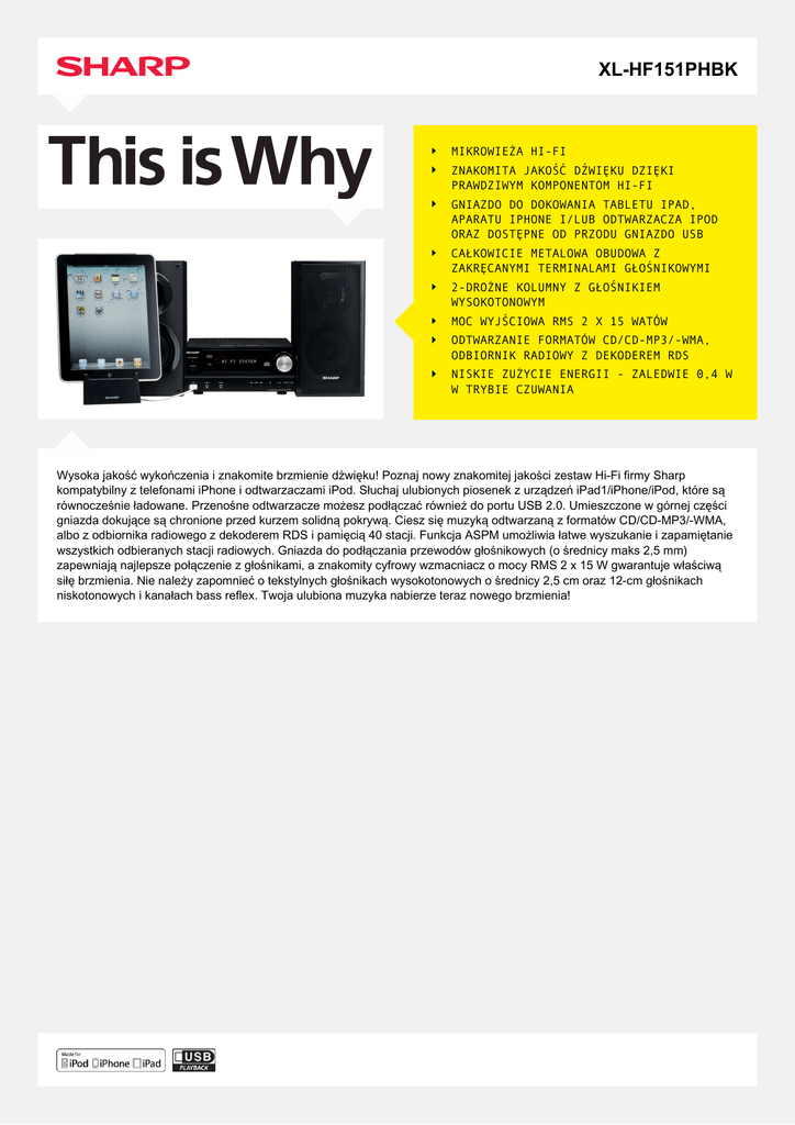 XL-HF151PHBK MIKROWIEŻA HI-FI ZNAKOMITA JAKOŚĆ DŹWIĘKU DZIĘKI PRAWDZIWYM KOMPONENTOM HI-FI GNIAZDO DO DOKOWANIA TABLETU IPAD, APARATU IPHONE I/LUB ODTWARZACZA IPOD ORAZ DOSTĘPNE OD PRZODU GNIAZDO USB CAŁKOWICIE METALOWA OBUDOWA Z ZAKRĘCANYMI TERMINALAMI GŁOŚNIKOWYMI 2-DROŻNE KOLUMNY Z GŁOŚNIKIEM WYSOKOTONOWYM MOC WYJŚCIOWA RMS 2 X 15 WATÓW ODTWARZANIE FORMATÓW CD/CD-MP3/-WMA, ODBIORNIK RADIOWY Z DEKODEREM RDS NISKIE ZUŻYCIE ENERGII - ZALEDWIE 0,4 W W TRYBIE CZUWANIA Wysoka jakość wykończenia i znakomite brzmienie dźwięku! Poznaj nowy znakomitej jakości zestaw Hi-Fi firmy Sharp kompatybilny z telefonami iPhone i odtwarzaczami iPod. Słuchaj ulubionych piosenek z urządzeń iPad1/iPhone/iPod, które są równocześnie ładowane. Przenośne odtwarzacze możesz podłączać również do portu USB 2.0. Umieszczone w górnej części gniazda dokujące są chronione przed kurzem solidną pokrywą. Ciesz się muzyką odtwarzaną z formatów CD/CD-MP3/-WMA, albo z odbiornika radiowego z dekoderem RDS i pamięcią 40 stacji. Funkcja ASPM umożliwia łatwe wyszukanie i zapamiętanie wszystkich odbieranych stacji radiowych. Gniazda do podłączania przewodów głośnikowych (o średnicy maks 2,5 mm) zapewniają najlepsze połączenie z głośnikami, a znakomity cyfrowy wzmacniacz o mocy RMS 2 x 15 W gwarantuje właściwą siłę brzmienia. Nie należy zapomnieć o tekstylnych głośnikach wysokotonowych o średnicy 2,5 cm oraz 12-cm głośnikach niskotonowych i kanałach bass reflex. Twoja ulubiona muzyka nabierze teraz nowego brzmienia! SEKCJA ODBIORNIKA FM/AM SEKCJA WZMACNIACZA Maksymalna muzyczna moc wyjściowa (całkowita): 120 W Wyjściowa moc muzyczna (DIN 45 324): 60 W (30+30)W Moc RMS wg normy DIN 45 324: 30 W (15+15)W Moc RMS wg normy DIN 45 500: 24 W (12+12)W Zaprogramowany korektor (Equalizer): Regulacja tonów niskich / wysokich: X-Bass: SEKCJA ODTWARZACZA CD Zmieniarka CD: 1-płytowy, otwierany od przodu Możliwość odtwarzania płyt CD-R/CD-RW*/MP3: / / Przeglądanie listy plików MP3/WMA: Odtwarzanie w przypadkowej kolejności/odtwarzanie cykliczne/pamięć tytułów: / / ZEGAR/TIMER Zegar i wyłącznik czasowy: / Sterowanie zegarem (nagrywanie/odtwarzanie): System RDS / pamięć stacji radiowych: /40 Gniazdo antenowe (koncentryczne 75 Ω): / GNIAZDA WYJŚCIOWE GNIAZDA WEJŚCIOWE Analogowe wejście AUX / USB: Głośniki / słuchawki (3,5 mm): Cyfrowe optyczne/wideo: / / / AKCESORIA KOLUMNY GŁOŚNIKOWE Typ: 2-drożne kolumny z głośnikiem wysokotonowym Głośnik niskotonowy / głośnik wysokotonowy / głośnik pełnozakresowy: / / Wymiary (szer. x gł x wys.) w mm: 132x262x175 Waga kolumny głośnikowej (każdej): 1,8 Kg Pilot zdalnego sterowania z bateriami: Wewnętrzna antena FM / pętlowa antena AM: / SEKCJA OGÓLNA Funkcje specjalne: Odtwarzanie nagrań i ładowanie urządzeń iPad1/iPhone/iPod/iTouch. Podstawa do podłączania tabletu iPad oraz trzy przejściówki do odtwarzaczy iPod w zestawie. Obsługa: Przy pomocy pilota i przycisków na panelu przednim Wymagania dotyczące źródła zasilania (AC): 230V/50Hz Wymiary urządzenia głównego (szer. x wys. x gł.), mm: 215x96x335 Waga (urządzenie główne): 3,47 Kg Kolor: urządzenie główne / kolumny / pilot: Czarny/czarny/czarny Pobór mocy w trybie czuwania: 0,4 W Kod EAN: 4974019703237 www.sharp.pl Powered by TCPDF (www.tcpdf.org) SHARP ELECTRONICS (EUROPE) GMBH SPółKA Z O. O. ODDZIAł W POLSCE UL. POLECZKI 33 BUDYNEK A2 02-822 WARSZAWA TEL.: +48 22 545 81 00 FAKS: +48 22 545 81 00 FAKS: +48 22 545 81 05 WWW.SHARP.PL