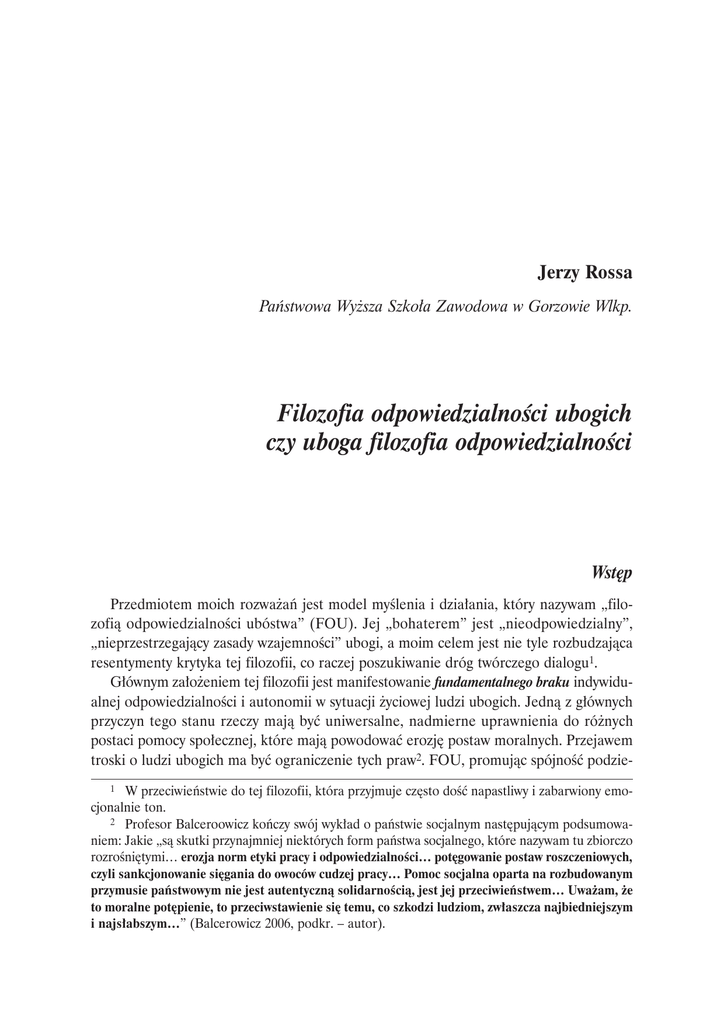 Jerzy Rossa Państwowa Wyższa Szkoła Zawodowa w Gorzowie Wlkp. Filozofia odpowiedzialności ubogich czy uboga filozofia odpowiedzialności Wstęp Przedmiotem moich rozważań jest model myślenia i działania, który nazywam „filozofią odpowiedzialności ubóstwa” (FOU). Jej „bohaterem” jest „nieodpowiedzialny”, „nieprzestrzegający zasady wzajemności” ubogi, a moim celem jest nie tyle rozbudzająca resentymenty krytyka tej filozofii, co raczej poszukiwanie dróg twórczego dialogu1. Głównym założeniem tej filozofii jest manifestowanie fundamentalnego braku indywidualnej odpowiedzialności i autonomii w sytuacji życiowej ludzi ubogich. Jedną z głównych przyczyn tego stanu rzeczy mają być uniwersalne, nadmierne uprawnienia do różnych postaci pomocy społecznej, które mają powodować erozję postaw moralnych. Przejawem troski o ludzi ubogich ma być ograniczenie tych praw2. FOU, promując spójność podzie1 W przeciwieństwie do tej filozofii, która przyjmuje często dość napastliwy i zabarwiony emocjonalnie ton. 2 Profesor Balceroowicz kończy swój wykład o państwie socjalnym następującym podsumowaniem: Jakie „są skutki przynajmniej niektórych form państwa socjalnego, które nazywam tu zbiorczo rozrośniętymi… erozja norm etyki pracy i odpowiedzialności… potęgowanie postaw roszczeniowych, czyli sankcjonowanie sięgania do owoców cudzej pracy… Pomoc socjalna oparta na rozbudowanym przymusie państwowym nie jest autentyczną solidarnością, jest jej przeciwieństwem… Uważam, że to moralne potępienie, to przeciwstawienie się temu, co szkodzi ludziom, zwłaszcza najbiedniejszym i najsłabszym…” (Balcerowicz 2006, podkr. – autor). 70 Jerzy Rossa lanych wartości i obywatelskich obowiązków, proponuje zastąpienie ich uprawnieniami warunkowymi i selektywnymi w towarzystwie bodźców i sankcji. Mają one służyć ponownemu „utowarowieniu” tych, którzy ulegli „dekomodyfikacji” dzięki nadmiernej aktywności „starego welfare state” (Gilbert 2004, s. 44)3. To indywidualne jednostki, wyposażone w negatywne prawa wolności obywatelskiej i politycznej, a nie państwo czy wspólnota, są odpowiedzialne za zapewnienie sobie bezpieczeństwa i pomyślności w przyszłości. FOU zmierza do porzucenia solidarności i równości jako osiowych zasad, kładąc nacisk na indywidualne i międzygeneracyjne zabezpieczenie przy pomocy prywatnych i w wolny sposób wybranych produktów i urządzeń służących takiemu bezpieczeństwu, w przeciwieństwie do jego osiągania w kolektywny sposób. Spójność społeczna przestaje być w ten sposób podstawowym celem polityki społecznej. Jest wypierana przez zarządzanie wykluczonymi, problemowymi populacjami. FOU, jak sądzę, utrwala zjawisko rosnącej akceptacji nędzy, bezrobocia i społecznej polaryzacji jako faktów życia spowodowanych przez globalne siły ekonomiczne znajdujące się poza ludzką kontrolą czy wpływem państw narodowych, choć te fakty, jak wskazują Martin i Schumann, dają się odnieść do konkretnego sprawstwa (2000, s. 9). Ogólnie, FOU porzuca „stare” welfare state, chroniące przed stygmatyzacją i pauperyzacją, na rzecz państwa, które nie obiecuje nagradzania za niepożądane zachowania. Poniżej pragnę rozstrzygnąć tytułowy dylemat. Jego zoperacjonalizowane rozwinięcie mogłoby brzmieć następująco: czy filozofia odpowiedzialności ubóstwa jest związana ze społecznym postępem w materialnym i moralnym wymiarze, czy też jest odwrotnie; „ubóstwo” tej filozofii winno się kojarzyć z regresem, ponieważ jej konsekwencją jest degradacja ludzkiego podmiotu z „celu” w jedynie „środek” do realizacji celu, z wolnego i dysponującego pozytywnym wyborem podmiotu w zdegradowany, zależny przedmiot manipulacji innych. Konstruując taki dylemat odwołuję się do myśli Profesora Jana Daneckiego dotyczącej potrzeby humanizacji materialnego postępu za pośrednictwem działań polityki społecznej. Presja globalizacyjna absolutyzuje znowu zagadnienia gospodarcze, czyniąc z nich cel sam w sobie, zaś moralna panika towarzysząca globalizacyjnym zagrożeniom podporządkowuje ludzki podmiot i jego ciało, rozważane teraz jako towar, logice „ducha absolutnego” globalizacji. W niniejszych rozważaniach nie zamierzam odpowiadać 3 T. Kaźmierczak i M. Rymsza formułują paradygmat „aktywnej polityki społecznej”, której koncepcyjna wielowymiarowość redukuje się do jednowymiarowego instrumentarium działania – zasady obowiązkowego udziału klientów pomocy społecznej w programach aktywizacji zawodowej i programach reintegracji społecznej pod ryzykiem utraty prawa do świadczeń. Historia zatacza w ten sposób koło wracając do zasady less eligibility. Zasada traktuje człowieka ubogiego jako szczególnego homo economicus, którego podejrzewa o maksymalizowanie korzyści i minimalizowanie nakładów w procesie zaspokajania własnych potrzeb. A zatem jest wyrazem atomistycznego rozumienia ludzkiej natury. Zasada jest instytucjonalizacją moralnego wykluczenia ubogich, których „podejrzewa” o lenistwo i chęć wykorzystania innych, a stąd posługuje się „testem pracy” i „testem środków utrzymania”. Jak pokazuję niżej, wyklucza prawo do „brania czegoś za nic”, ponieważ prawo do zawłaszczania należy do tych, którzy posiadają władzę ekonomiczną. Na mocy tej zasady ubogim można jedynie udzielić takiej pomocy, która będzie znacząco niższa od najniższego wynagrodzenia w gospodarce (2003, s. 29–32). Filozofia odpowiedzialności ubogich czy uboga filozofia odpowiedzialności 71 wyczerpująco na wszystkie podstawowe pytania normatywnej teorii politycznej4, lecz chcę zwrócić uwagę na sprzeczne normatywne i praktyczne konsekwencje FOU. Tezy 1. Domagając się osobistej odpowiedzialności, FOU czyni to na drodze pozbawiania jej przesłanek w postaci wolności i autonomii (problem odpowiedz