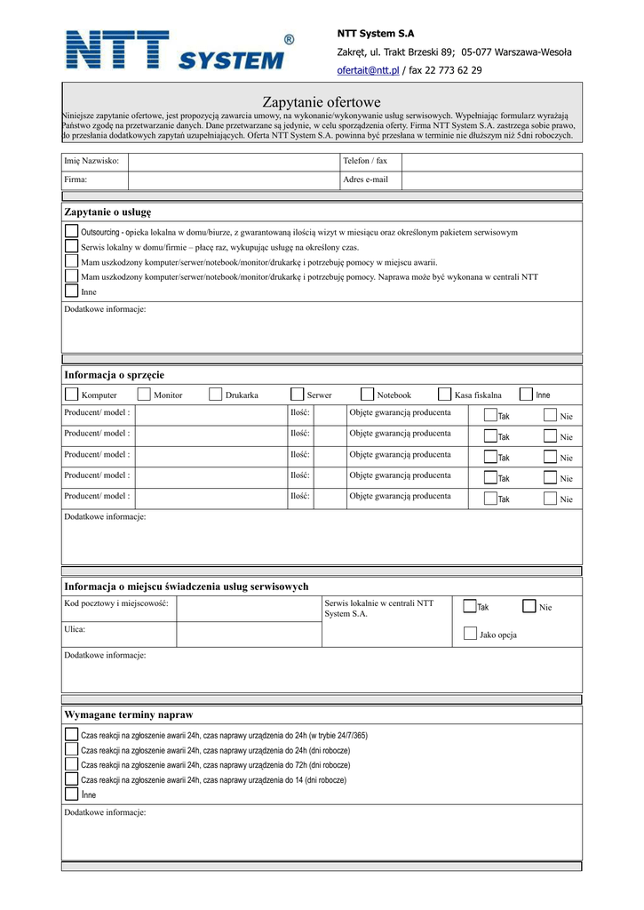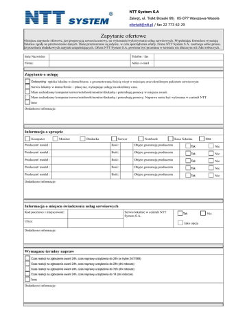 NTT System S.A Zakręt, ul. Trakt Brzeski 89; 05-077 Warszawa-Wesoła [email protected] / fax 22 773 62 29 Zapytanie ofertowe Niniejsze zapytanie ofertowe, jest propozycją zawarcia umowy, na wykonanie/wykonywanie usług serwisowych. Wypełniając formularz wyrażają Państwo zgodę na przetwarzanie danych. Dane przetwarzane są jedynie, w celu sporządzenia oferty. Firma NTT System S.A. zastrzega sobie prawo, do przesłania dodatkowych zapytań uzupełniających. Oferta NTT System S.A. powinna być przesłana w terminie nie dłuższym niż 5dni roboczych. Imię Nazwisko: Telefon / fax Firma: Adres e-mail Zapytanie o usługę Outsourcing - opieka lokalna w domu/biurze, z gwarantowaną ilością wizyt w miesiącu oraz określonym pakietem serwisowym Serwis lokalny w domu/firmie – płacę raz, wykupując usługę na określony czas. Mam uszkodzony komputer/serwer/notebook/monitor/drukarkę i potrzebuję pomocy w miejscu awarii. Mam uszkodzony komputer/serwer/notebook/monitor/drukarkę i potrzebuję pomocy. Naprawa może być wykonana w centrali NTT Inne Dodatkowe informacje: Informacja o sprzęcie Komputer Monitor Drukarka Serwer Notebook Kasa fiskalna Inne Producent/ model : Ilość: Objęte gwarancją producenta Tak Nie Producent/ model : Ilość: Objęte gwarancją producenta Tak Nie Producent/ model : Ilość: Objęte gwarancją producenta Tak Nie Producent/ model : Ilość: Objęte gwarancją producenta Tak Nie Producent/ model : Ilość: Objęte gwarancją producenta Tak Nie Dodatkowe informacje: Informacja o miejscu świadczenia usług serwisowych Kod pocztowy i miejscowość: Serwis lokalnie w centrali NTT System S.A. Ulica: Dodatkowe informacje: Wymagane terminy napraw Czas reakcji na zgłoszenie awarii 24h, czas naprawy urządzenia do 24h (w trybie 24/7/365) Czas reakcji na zgłoszenie awarii 24h, czas naprawy urządzenia do 24h (dni robocze) Czas reakcji na zgłoszenie awarii 24h, czas naprawy urządzenia do 72h (dni robocze) Czas reakcji na zgłoszenie awarii 24h, czas naprawy urządzenia do 14 (dni robocze) Inne Dodatkowe informacje: Tak Jako opcja Nie