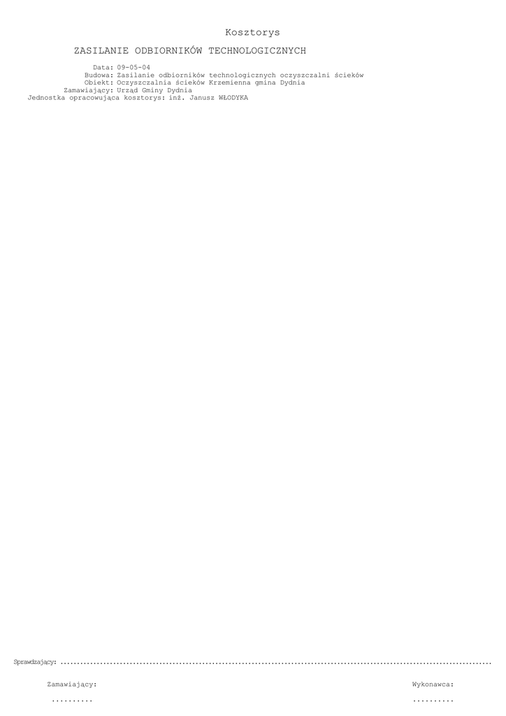 Kosztorys ZASILANIE ODBIORNIKÓW TECHNOLOGICZNYCH Data: 09-05-04 Budowa: Zasilanie odbiorników technologicznych oczyszczalni ścieków Obiekt: Oczyszczalnia ścieków Krzemienna gmina Dydnia Zamawiający: Urząd Gminy Dydnia Jednostka opracowująca kosztorys: inŜ. Janusz WŁODYKA Sprawdzający: ........................................................................................................................................ Zamawiający: Wykonawca: .......... .......... Kosztorys inwestorski - Zasilanie odbiorników technologicznych.E Zuzia (C) DataComp 1994-2005(lic. 1200) strona nr: 2 Przedmiar Opis pozycji Zasilanie odbiorników technologicznych oczyszczalni ścieków Kopanie rowów dla kabli, ręcznie, grunt kategorii III Zasypanie rowów dla kabli, ręcznie, grunt kategorii III Nasypanie warstwy piasku na dnie rowu kablowego, szerokość do 0,6·m UłoŜenie rur osłonowych PVC do Fi·140·mm - Rura DVK fi 75 w rowie Przewody kabelkowe wciągane do rur i w kanały zamknięte, rury, przekrój do 12,5·mm2 - Przewód YDY Ŝo 5x2,5 do rury - wciągnięcie 6 Przewody kabelkowe wciągane do rur i w kanały zamknięte, rury, przekrój do 7,5·mm2 Przewód YDY Ŝo 5x1,5 do rury - wciągnięcie 7 Przewody kabelkowe wciągane do rur i w kanały zamknięte, rury, przekrój do 7,5·mm2 Przewód YDY Ŝo 5x1,5 do rury - wciągnięcie 8 Przewody kabelkowe wciągane do rur i w kanały zamknięte, rury, przekrój do 7,5·mm2 Przewód LYcY 5x1 9 Przewody kabelkowe układane w gotowych korytkach i na drabinkach, bez mocowania, przekrój do 12,5·mm2 - Przewód YDY Ŝo 5x2,5 n/k 10 Przewody kabelkowe układane w gotowych korytkach i na drabinkach, bez mocowania, przekrój do 7,5·mm2 - Przewód YDY Ŝo 3x1,5 n/k 11 Przewody kabelkowe układane w gotowych korytkach i na drabinkach, bez mocowania, przekrój do 7,5·mm2 - Przewód LYcY 5x1 n/k 12 Przewody kabelkowe układane w gotowych korytkach i na drabinkach, bez mocowania, przekrój do 7,5·mm2 - Przewód LYcY 3x1 n/k 13 Przewody kabelkowe układane n.t., na betonie, przekrój do 7,5·mm2 - Przewód YDY Ŝo 5x1,5 n/t 14 Przewody kabelkowe układane n.t., na betonie, przekrój do 7,5·mm2 - Przewód YDY Ŝo 3x2,5 n/t 15 Przewody kabelkowe układane n.t., na betonie, przekrój do 12,5·mm2 - Przewód YDY Ŝo 5x2,5 n/n 16 Wycena własna - Wprowadzenie rur DVK fi 75 do budynku technicznego z uszczelnieniem 17 Wycena własna - Próby, pomiary, dokumentacja powykonawcza, podłączenie odbiorników technologicznych, wprowadzenie z podłączeniem kabli do RT-01, rozruch oczyszczalni 18 Wycena własna - Dostarczenie agregatu prądotwórczego typu ESE 3202 DYS/SDIES-33,7 kVA/37 kW na przyczepie firmy ENDRESS lub toŜsamy Ilość 1 1 2 3 4 5 Krot. Jedn. 13 13 35 108 m3 m3 m m 60 m 30 m 70 m 10 m 80 m 86 m 20 m 20 m 20 m 20 m 30 6 m kpl 1 kpl 1 kpl Kosztorys Opis pozycji podstawy nakładów 1 Zasilanie odbiorników technologicznych oczyszczalni ścieków 1 KNNR 5/701/2 Kopanie rowów dla kabli, ręcznie, grunt kategorii III 2 KNNR 5/702/2 Zasypanie rowów dla kabli, ręcznie, grunt kategorii III 3 KNNR 5/706/2 Nasypanie warstwy piasku na dnie rowu kablowego, szerokość do 0,6·m 4 KNNR 5/705/1 UłoŜenie rur osłonowych PVC do Fi·140·mm - Rura DVK fi 75 w rowie 5 KNNR 5/203/2 Przewody kabelkowe wciągane do rur i w kanały zamknięte, rury, przekrój 12,5·mm2 - Przewód YDY Ŝo 5x2,5 do rury - wciągnięcie 6 KNNR 5/203/1 Przewody kabelkowe wciągane do rur i w kanały zamknięte, rury, przekrój 7,5·mm2 - Przewód YDY Ŝo 5x1,5 do rury - wciągnięcie 7 KNNR 5/203/1 Przewody kabelkowe wciągane do rur i w kanały zamknięte, rury, przekrój 7,5·mm2 - Przewód YDY Ŝo 5x1,5 do rury - wciągnięcie 8 KNNR 5/203/1 Przewody kabelkowe wciągane do rur i w kanały zamknięte, rury, przekrój 7,5·mm2 - Przewód LYcY 5x1 9 KNNR 5/209/2 Przewody kabelkowe układane w gotowych korytkach i na drabinkach, bez mocowania, przekrój do 12,5·mm2 - Przewód YDY Ŝo 5x2,5 n/k 10 KNNR 5/209/1 Przewody kabelkowe układane w gotowych korytkach i na drabinkach, bez mocowania, przekrój do 7,5·mm2 - Przewód YDY Ŝo 3x1,5 n/k 11 KNNR 5/209/1 Przewody kabelkowe układane w gotowych korytkach i na drabinkach, bez mocowania, przekrój do 7,5·mm2 - Przewód LYcY 5x1 n/k 12 KNNR 5/209/1 Przewody kabelkowe układane w gotowych korytkach i na drabinkach, bez mocowania, przekrój do 7,5·mm2 - Przewód LYcY 3x1 n/k 13 KNNR 5/206/1 Przewody kabelkowe układane n.t., na betonie, przekrój do 7,5·mm2 Przewód YDY Ŝo 5x1,5 n/t 14 KNNR 5/206/1 Przewody kabelkowe układane n.t., na betonie, przekrój do 7,5·mm2 Przewód YDY Ŝo 3x2,5 n/t Ilość Krot. Jedn. 13 m3 13 m3 35 m 108 m 60 m 30 m 70 m 10 m 80 m 86 m 20 m 20 m 20 m 20 m Wartość z narzutami do do do do ZASILANIE ODBIORNIKÓW TECHNOLOGICZNYCH Kosztorys inwestorski - Zasilanie odbiorników technologicznych.E Zuzia (C) DataComp 1994-2005(lic. 1200) strona nr: 3 Opis pozycji podstawy nakładów Ilość 15 KNNR 5/206/2 Przewody kabelkowe układane n.t., na betonie, przekrój do 12,5·mm2 Przewód YDY Ŝo 5x2,5 n/n 16 Wycena własna - Wprowadzenie rur DVK fi 75 do budynku technicznego z uszczelnieniem 17 Wycena własna - Próby, pomiary, dokumentacja powykonawcza, podłączenie odbiorników technologicznych, wprowadzenie z podłączeniem kabli do RT-01, rozruch oczyszczalni 18 Wycena własna - Dostarczenie agregatu prądotwórczego typu ESE 3202 DYS/SDIES-33,7 kVA/37 kW na przyczepie firmy ENDRESS lub toŜsamy Krot. 30 Jedn. Wartość z narzutami m 6 kpl 1 kpl 1 kpl Zestawienie robocizny Lp. Nazwa zawodu Jedn. 1. Robocizna . . . . . . . . . . . . . . . . . . . . . . . . . . . . . . r-g 2. Robotnicy . . . . . . . . . . . . . . . . . . . . . . . . . . . . . . r-g Razem (z dokładnością do zaokrągleń): Ilość 112 102,6641 214,6641 Cena Wartość Ilość Cena Wartość Zestawienie materiałów Lp. Nazwa materiału 1. Agregat prądotwórczy typu ESE 3202 DYS/SDIES-33,7 kVA/37 kW na przyczepie firmy ENDRESS lub toŜsamy . . 