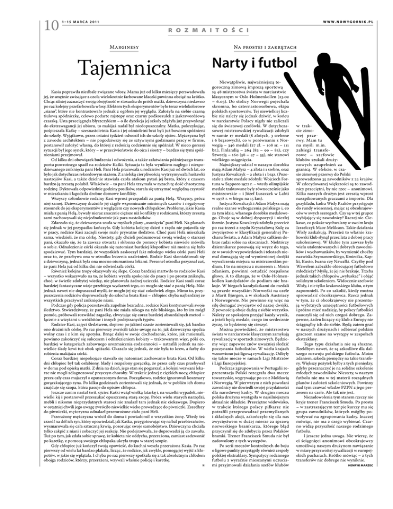 10 w w w. now ygornik . pl 1 –1 5 m a r c a 2 0 11 R O Z M A I T O Ś C I Marginesy Tajemnica Kasia poprawiła niedbale związane włosy. Mama już od kilku miesięcy perswadowała jej, że smętnie zwisające z czoła wielokrotnie farbowane kłaczki powinna obciąć na krótko. Chcąc silniej zaznaczyć swoją obojętność w stosunku do próśb matki, dziewczyna niedawno po raz kolejny przefarbowała włosy. Efektem tych eksperymentów było teraz wielokolorowe „siano”, które nie kontrastowało jednak z ogółem jej wyglądu. Założyła na siebie czarną tiulową spódniczkę, celowo podarte rajstopy oraz czarny podkoszulek z jaskraworóżową czaszką. Usta przeciągnęła błyszczykiem – o ile dyrekcja jej szkoły zdążyła już przywyknąć do ekstrawagancji jej ubioru, to makijaż nadal był niedopuszczalny. Matka, pokrzykując, pośpieszała Kaśkę – szesnastoletnia Kasia i jej ośmioletni brat byli już bowiem spóźnieni do szkoły. Wyjątkowo, przez ostatni tydzień odwoził ich do szkoły ojciec. Mężczyzna był z zawodu architektem – nie pogodziwszy się ze sztywnymi godzinami pracy w firmie, postanowił założyć własną, do której z radością codziennie się spóźniał. W nieco gorszej sytuacji był jego synek, który – w przeciwieństwie do ojca i siostry – bardzo się tymi spóźnieniami przejmował. Od kilku dni obowiązek budzenia i odwożenia, a także załatwiania późniejszego transportu powrotnego spadł na rodziców Kaśki. Sytuacja ta była wynikiem nagłego i niespodziewanego zniknięcia pani Heli. Pani Hela pracowała u rodziców Kasi już od dwóch lat, co było jak dotychczas rekordowym stażem. Z anielską cierpliwością wytrzymywała huśtawki nastrojów Kasi, a także dzielnie stawiała czoła atakom pytań jej brata, który z czasem bardzo ją zresztą polubił. Właściwie – to pani Hela trzymała w ryzach tę dość chaotyczną rodzinę. Dyktowała odpowiednie godziny posiłków, starała się utrzymać względną czystość w mieszkaniu i łagodziła drobne domowe konflikty. Wszyscy członkowie rodziny Kasi wprost przepadali za panią Helą. Wszyscy, prócz niej samej. Dziewczynę drażniło jej ciągłe wspominanie minionych czasów i negatywny stosunek do jej eksperymentów z wyglądem czy nowych chłopaków. Problemy, jakie Kasia miała z panią Helą, bywały nieraz znacznie cięższe niż konflikty z rodzicami, którzy zresztą sami zachowywali się niejednokrotnie jak para nastolatków. Zdarzało się, że dziewczyna snuła w myślach plany „usunięcia” pani Heli. Na planach się jednak w jej przypadku kończyło. Gdy kobieta kolejny dzień z rzędu nie pojawiła się w pracy, rodzice Kasi zaczęli swoje małe prywatne śledztwo. Choć pani Hela mieszkała sama, wiedzieli, że ma córkę. Niestety, gdy chcieli podsumować swoją wiedzę o starszej pani, okazało się, że ta zawsze otwarta i skłonna do pomocy kobieta niewiele mówiła o sobie. Odnalezienie córki okazało się natomiast bardziej kłopotliwe niż można się było spodziewać. Tym bardziej, że wszystkich zaskoczył fakt młodego wieku córki pani Heli oraz to, że przebywa ona w ośrodku leczenia uzależnień. Rodzie Kasi skontaktowali się z dziewczyną, jednak była ona mocno otumaniona lekami. Personel ośrodka przyznał zaś, że pani Hela już od kilku dni nie odwiedzała córki. Również kolejne tropy okazywały się ślepe. Coraz bardziej martwiło to rodziców Kasi – wszystko wskazywało na to, że kobieta wyszła spokojnie do pracy i po prostu zniknęła, choć, w świetle zdobytej wiedzy, nie planowała żadnej ucieczki. Rodzice Kasi snuli coraz bardziej fantastyczne wizje przebiegu wydarzeń tego, co mogło się stać z panią Helą. Nikt jednak nawet nie dopuszczał myśli, że mogło jej się stać cokolwiek złego. Mimo to, przypuszczenia rodziców doprowadzały do szlochu brata Kasi – chłopiec chyba najbardziej ze wszystkich przeżywał zniknięcie niani. Podczas gdy policja pozostawała zupełnie bezradna, rodzice Kasi kontynuowali swoje śledztwo. Stwierdziwszy, że pani Hela nie miała nikogo na tyle bliskiego, kto by im mógł pomóc, próbowali rozwikłać zagadkę, chwytając się coraz bardziej absurdalnych metod – łącznie z wizytami u wróżbitów i innych podejrzanych typów. Rodzice Kasi, zajęci śledztwem, dopiero po jakimś czasie zorientowali się, jak bardzo ono drażni ich córkę. Po raz pierwszy zwrócili także uwagę na to, jak dziewczyna spędza wolny czas i z kim się spotyka. Brnąc dalej w swoje dochodzenie, które, jak mniemali, powinno zakończyć się sukcesem i odnalezieniem kobiety – traktowanym więc, póki co, bardziej w kategoriach zabawnego urozmaicenia codzienności – natrafili jednak na niewielkie ślady krwi tuż obok spiżarki. Okazało się jednak, że nie była to krew, a farby do robienia makijażu córki. Coraz bardziej niepokojące stawało się natomiast zachowanie brata Kasi. Od kilku dni chłopiec był tak osłabiony, blady i rozpalony gorączką, że przez cały czas przebywał w domu pod opieką matki. Z dnia na dzień, jego stan się pogarszał, a kolejni wezwani lekarze nie mogli zdiagnozować przyczyn choroby. W trakcie jednej z ciężkich nocy, chłopiec przez cały czas majaczył o opuszczonym domu. Początkowo, rodzice ignorowali koszmary gorączkującego syna. Po kilku godzinach zorientowali się jednak, że w pobliżu ich domu znajduje się szopa, która pasuje do opisów chłopca. Jeszcze zanim nastał świt, ojciec Kaśki wziął wielką latarkę i, na wszelki wypadek, niewielki kij i postanowił przeszukać opuszczoną starą szopę. Prócz wielu starych narzędzi, mebli i nikomu nieprzydatnych staroci nie znalazł tam jednak nic ciekawego. Dopiero w ostatniej chwili jego uwagę zwróciło niewielkie wieko prowadzące do piwniczki. Zszedłszy do piwniczki, mężczyzna odnalazł przemrożone ciało pani Heli. Przerażony mężczyzna wrócił do domu i powiadomi