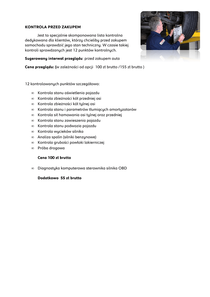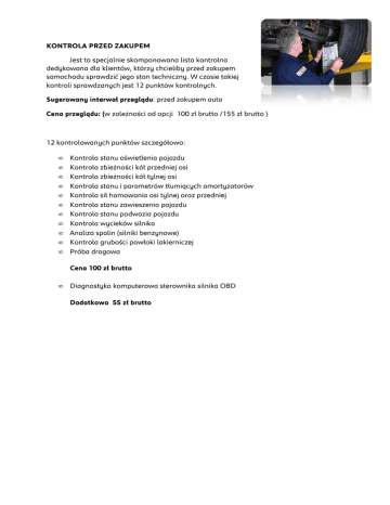 KONTROLA PRZED ZAKUPEM Jest to specjalnie skomponowana lista kontrolna dedykowana dla klientów, którzy chcieliby przed zakupem samochodu sprawdzić jego stan techniczny. W czasie takiej kontroli sprawdzanych jest 12 punktów kontrolnych. Sugerowany interwał przeglądu: przeglądu przed zakupem auta Cena przeglądu: (w w zależności od opcji 100 zł brutto /155 zł brutto ) 12 kontrolowanych punktów szczegółowo: • • • • • • • • • • • Kontrola stanu oświetlenia pojazdu Kontrola zbieżności kół przedniej osi Kontrola zbieżności kół tylnej osi Kontrola stanu i parametrów tłumiących amortyzatorów Kontrola sił hamowania osi tylnej oraz przedniej Kontrola stanu zawieszenia pojazdu Kontrola stanu podwozia pojazdu Kontrola wycieków silnika Analiza spalin (silniki benzynowe) be Kontrola grubości powłoki lakierniczej Próba drogowa Cena 100 zł brutto • Diagnostyka komputerowa sterownika silnika OBD Dodatkowo 55 zł brutto