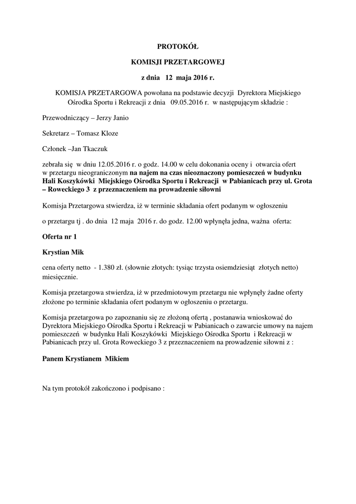 PROTOKÓŁ KOMISJI PRZETARGOWEJ z dnia 12 maja 2016 r. KOMISJA PRZETARGOWA powołana na podstawie decyzji Dyrektora Miejskiego Ośrodka Sportu i Rekreacji z dnia 09.05.2016 r. w następującym składzie : Przewodniczący – Jerzy Janio Sekretarz – Tomasz Kloze Członek –Jan Tkaczuk zebrała się w dniu 12.05.2016 r. o godz. 14.00 w celu dokonania oceny i otwarcia ofert w przetargu nieograniczonym na najem na czas nieoznaczony pomieszczeń w budynku Hali Koszykówki Miejskiego Ośrodka Sportu i Rekreacji w Pabianicach przy ul. Grota – Roweckiego 3 z przeznaczeniem na prowadzenie siłowni Komisja Przetargowa stwierdza, iż w terminie składania ofert podanym w ogłoszeniu o przetargu tj . do dnia 12 maja 2016 r. do godz. 12.00 wpłynęła jedna, ważna oferta: Oferta nr 1 Krystian Mik cena oferty netto - 1.380 zł. (słownie złotych: tysiąc trzysta osiemdziesiąt złotych netto) miesięcznie. Komisja przetargowa stwierdza, iż w przedmiotowym przetargu nie wpłynęły żadne oferty złożone po terminie składania ofert podanym w ogłoszeniu o przetargu. Komisja przetargowa po zapoznaniu się ze złożoną ofertą , postanawia wnioskować do Dyrektora Miejskiego Ośrodka Sportu i Rekreacji w Pabianicach o zawarcie umowy na najem pomieszczeń w budynku Hali Koszykówki Miejskiego Ośrodka Sportu i Rekreacji w Pabianicach przy ul. Grota Roweckiego 3 z przeznaczeniem na prowadzenie siłowni z : Panem Krystianem Mikiem Na tym protokół zakończono i podpisano :