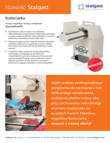 Nowość Stalgast Kotleciarka Chcesz wydobyć walory smakowe użyj kotleciarki! Daj Klientom radość smaku i nie zaniedbuj odpowiedniego przygotowania mięsa przed sprzedażą, czy jego wstępnej „obróbki”, jako preludium w symfonii kulinarnej serwowanych przez Ciebie dań! Należyte przygotowanie mięsa do duszenia, pieczenia, smażenia, grillowania czy gotowania czyni w efekcie końcowym odczuwalną dla Twoich Klientów i Ciebie różnicę! Urządzenie ułatwi uzyskanie doskonałego efektu kulinarnego, zmniejszając pracochłonność i czasochłonność procesu wydawania Konsumentom ważnych pozycji Twojego menu a Klientom Twoich sklepów pozwoli w prosty sposób w warunkach domowych osiągnąć tradycyjną, mistrzowską jakość! Jeżeli szukasz profesjonalnego urządzenia do nacinania i/ lub delikatnego zmiękczenia, rozbijania płatów mięsa, aby przy zachowaniu naturalnego aromatu rozpływało się w ustach Twoich Klientów, wypróbuj kotleciarkę – nowość z naszej oferty! Stalgast Sp. z o.o. ul. Staniewicka 5, 03-310 Warszawa infolinia: 801 40 50 63 www.stalgast.com Do czego służy kotleciarka/steker? Jest to profesjonalne urządzenie elektryczne do nacinania, zmiękczania i rozbijania płatów mięsa przeznaczonych na steki, bitki, filety oraz kotlety. Gdzie je stosować: w firmach cateringowych w domach weselnych i bankietowych w obiektach zbiorowego żywienia w stołówkach, kantynach i barach szybkiej obsługi w restauracjach w sklepach mięsnych i w każdym innym miejscu związanym z gastronomią... Korzyści z używania kotleciarki: szybkość i komfort – skraca proces przygotowania wszystkich rodzajów i gatunków mięsa (bez kości) wydajność – umożliwia łatwe przygotowanie dużej liczby porcji mięsa przeznaczonego na kotlety, bitki, filety czy steki, w praktyce eliminując ubytki masy (w porównaniu z klasyczną metodą rozbijania mięsa) powtarzalność – zawsze równomiernie, bezbłędnie nacina i delikatnie rozgniata płaty mięsa jakość – mięso po zastosowaniu stekera zachowa swoje aromaty, będzie bardziej soczyste i łatwiejsze w przygotowaniu podczas procesu formowania oraz obróbki cieplnej higiena – dzięki przemyślanej konstrukcji osłony mechanizmu tnącego oraz łatwości demontażu elementów sprzętu nie ma problemów z utrzymaniem stekera oraz jego otoczenia w czystości Dane techniczne: Numer katalogowy: 721570 Wymiary (WxDxH): 500 mm x 310 mm x 500 mm Moc: 0,37 kW Zasilanie: 230V Waga: 20 kg Wydajność: do 420 steków na godzinę Wielkość otworu wsadowego: 158x23 mm Urządzenie wolnostojące z antypoślizgowymi nóżkami Zaopatrz się w kotleciarkę/steker w atrakcyjnej ofercie Stalgast! Produkt polski najwyższej jakości, wykonany z najlepszych materiałów w przystępnej cenie. 2999 zł (netto) Stalgast Sp. z o.o. ul. Staniewicka 5, 03-310 Warszawa infolinia: 801 40 50 63 www.stalgast.com