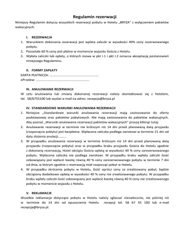 Regulamin rezerwacji Niniejszy Regulamin dotyczy wszystkich rezerwacji pobytu w Hotelu „BRYZA” z wyłączeniem pakietów wakacyjnych. I. REZERWACJA 1. Warunkiem dokonania rezerwacji jest wpłata zaliczki w wysokości 40% ceny rezerwowanego pobytu. 2. Pozostałe 60 % ceny jest płatne w momencie wyjazdu Gościa z Hotelu. 3. Wpłata zaliczki lub opłaty, o których mowa w pkt I.1 i pkt I.2 oznacza akceptację postanowień niniejszego Regulaminu. II. FORMY ZAPŁATY KARTA PŁATNICZA: ….................................................. ePrzelew: …....................................................... III. ANULOWANIE REZERWACJI W celu anulowania lub zmiany dokonanej rezerwacji należy skontaktować się z Hotelem, tel. 58/6755100 lub wysłać e-mail na adres: [email protected] 1. 2. 3. 4. IV. STANDARDOWE WARUNKI ANULOWANIA REZERWACJI Niniejsze „Standardowe warunki anulowania rezerwacji mają zastosowanie do oferty podstawowej oraz pakietów pobytowych. Nie mają zastosowania do pakietów wakacyjnych. Aby poznać „Warunki anulowania rezerwacji pakietów wakacyjnych” proszę kliknąć tutaj. Anulowanie rezerwacji w terminie nie krótszym niż 14 dni przed planowaną datą przyjazdu (rozpoczęcia pobytu) jest bezpłatne. Wpłacona zaliczka podlega zwrotowi w terminie 21 dni od daty złożenia anulacji.…..... W przypadku anulowania rezerwacji w terminie krótszym niż 14 dni przed planowaną datą przyjazdu (rozpoczęcia pobytu) oraz w przypadku braku przyjazdu Gościa do Hotelu zgodnie z dokonaną rezerwacją, Hotel obciąży Gościa opłatą w wysokości 40 % ceny zarezerwowanego pobytu. Wpłacona zaliczka nie podlega zwrotowi. W przypadku braku wpłaty zaliczki Gość zobowiązany jest wpłacić kwotę równą 40 % ceny zarezerwowanego pobytu w terminie 7 dni od dnia, w którym zgodnie z rezerwacją miał rozpocząć pobyt w Hotelu. W przypadku skrócenia pobytu w Hotelu, Gość oprócz ceny za zrealizowany pobyt, będzie obciążony dodatkowo opłatą w wysokości 40 % ceny nie zrealizowanego pobytu. W przypadku braku wpłaty zaliczki Gość zobowiązany jest wpłacić kwotę równą 40 % ceny nie zrealizowanego pobytu w momencie wyjazdu z Hotelu. V. REKLAMACJE Wszelkie reklamacje dotyczące pobytu w Hotelu należy zgłaszać niezwłocznie, nie później niż w terminie do 14 dni od opuszczenia Hotelu recepcji tel. 58 67 55 100 lub e-mail [email protected]. VI. DANE OSOBOWE Zgodnie z przepisami ustawy z dnia 29.08.1997 r. o Ochronie Danych Osobowych wprowadzone dane będą przetwarzane wyłącznie w celu realizacji rezerwacji. Hotel powierza przetwarzanie danych operatorowi systemu - PROFITROOM Sp. z o.o. z siedzibą w Warszawie. Oczywiście przysługuje Państwu prawo wglądu do swoich danych osobowych i ich aktualizacji bądź żądania ich usunięcia. VII. UMOWA Informacje zamieszczone na stronie internetowej Hotelu Bryza nie stanowią oferty zawarcia umowy w myśl przepisów Kodeksu Cywilnego. Hotel Bryza nie odpowiada za zniekształcenia przedstawionych informacji, spowodowane błędami lub awariami systemu informatycznego.