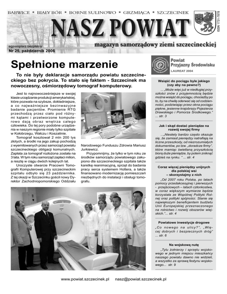 Nr 25, październik 2006 Spełnione marzenie To nie były deklaracje samorządu powiatu szczecineckiego bez pokrycia. To stało się faktem - Szczecinek ma nowoczesny, ośmiorzędowy tomograf komputerowy. Jest to najnowocześniejsze w swojej klasie urządzanie produkcji amerykańskiej, które pozwala na szybsze, dokładniejsze, a co najważniejsze bezinwazyjne badanie pacjentów. Promienie RTG przechodzą przez ciało pod różnymi kątami i przetworzone komputerowo dają obraz wnętrza całego człowieka. Do tej pory podobne urządzenia w naszym regionie miały tylko szpitale w Kołobrzegu, Wałczu i Koszalinie. Tomograf kosztował 2 mln 200 tys złotych, a środki na jego zakup pochodzą z wyemitowanych przez samorząd powiatu szczecineckiego obligacji komunalnych. Zapłata za tomograf rozłożona została na 3 lata. W tym roku samorząd zapłaci milion, a resztę w ciągu dwóch kolejnych lat. Uroczyste otwarcie Pracowni Tomografii Komputerowej przy szczecineckim szpitalu odbyło się 23 października. Z tej okazji w Szczecinku gościł nowy Dyrektor Zachodniopomorskiego Oddziału Wsiąść do pociągu byle jakiego (czy aby na pewno?) ... „Może więc już w niedługiej przyszłości znów z przyjemnością będzie można wsiąść do pociągu, chociażby po to, by na chwilę oderwać się od codzienności, podziwiając przez okna pociągu piękne, jesienne krajobrazy Pojezierza Drawskiego i Pomorza Środkowego.” ... str. 3 Jak i skąd dostać pieniądze na rozwój swojej firmy Narodowego Funduszu Zdrowia Mariusz Jurkiewicz. Przypomnijmy, że tylko w tym roku ze środków samorządu powiatowego zakupiono dla szczecineckiego szpitala także karetkę reanimacyjną, sprzęt do badania pracy serca systemem Holtera, a także finansowano modernizację pomieszczeń niezbędnych do instalacji i obsługi tomografu. ...„Niestety bardzo często okazuje się, że zamiast pieniędzy natrafiają na liczne przeszkody, od niezrozumiałych dokumentów, po tzw. „doradcze firmy”, które mamiąc świetlaną przyszłością biorą duże pieniądze, by potem zniknąć gdzieś na rynku. ” ... str. 4 Coraz więcej pieniędzy unijnych dla polskiej wsi – skorzystajmy z nich „Od 2007 roku Polska, po latach pomocy przedakcesyjnej i pierwszych - przejściowych – latach członkostwa, w coraz większym wymiarze będzie korzystała ze Wspólnej Polityki Rolnej oraz polityki spójności. Stanie się największym beneficjentem budżetu Unii Europejskiej przeznaczonego na rolnictwo i rozwój obszarów wiejskich.”... str. 4 Powiatowe inwestycje drogowe „ C o n o w e g o n a u l i c y ? ” , „ Więcej dobrych i bezpiecznych dróg” ... str. 6 Na wojskową nutę „Tylu żołnierzy i sprzętu wojskowego w jednym miejscu mieszkańcy naszego powiatu dawno nie widzieli, a wszystko za sprawą festynu wojskowego... str. 9 www.powiat.szczecinek.pl [email protected] W SKRÓCIE Gigantyczna inwestycja W niespełna rok szczecinecki Kronospan wzniósł najnowocześniejszą na świecie linię do produkcji płyt wiórowych. Powstała ona w miejsce poprzedniej, która spłonęła w pożarze. Dla mieszkańców oznacza to nowe miejsca pracy, a dla firmy podbój krajowych i europejskich rynków zbytu. Skala tej inwestycji jest porażająca. Nowa linia to kompleks ogromnych maszyn zlokalizowanych na kilku hektarach powierzchni. Jest to kompletna linia pozwalająca realizować wszystkie etapy cyklu produkcyjnego: od przygotowania surowca w tzw. rębaku, poprzez rozdrabnianie, suszenie po szlifowanie gotowej płyty. Dzięki tej inwestycji firma planuje przyjąć około 100 dodatkowych ludzi, a o kolejnych tysiąc osób powinno się zwiększyć zatrudnienie w firmach kooperujących z Kronospanem. dla zainteresowanych powiatem szczecineckim turystów, inwestorów, czy też jego mieszkańców. Do zapoznania się z jego treścią zachęca ciekawa szata graficzna, liczne zdjęcia, bardzo dobra jakość druku i poręczny format. Folder został wydany w trzech wersjach językowych: polskiej, angielskiej i niemieckiej. Upragniona przeprowadzka Po wielu latach oczekiwań i starań Muzeum Regionalne w Szczecinku ma w końcu nową siedzibę. Obecnie mieści się ono w dawnym budynku Szkoły Podstawowej nr 2, przy ul. Szkolnej. Wieża kościoła św. Mikołaja, nie nadawała się na jego siedzibę już od dawna. Ciasny budynek nie był wygodny dla zwiedzających i nie pozwalał na eksponowanie wszystkich zbiorów. Linia kosztowała 400 mln zł, do jej budowy zużyto 6 tys. ton stali, 50 tys. metrów sześciennych betonu. Wydajność nowej linii to 500 tys. m3 płyty wiórowej rocznie, z czego blisko 25% przeznaczone jest na eksport, głównie na rynki skandynawskie. Szacunkowa wartość tej produkcji to ok. 300 mln zł. Nowy folder Starostwo Powiatowe w Szczecinku wydało nowy, bardzo ładny i ciekawy folder o powiecie szczecineckim. 48 stronicowe wydawnictwo zawiera szereg istotnych i przydatnych informacji Wydawca: Starostwo Powiatowe w Szczecinku 78-400 Szczecinek, ul. 28 Lutego 16 www.powiat.szczecinek.pl Potrójny jubileusz Rok 2006 jest dla Szkoły Muzycznej I i II stopnia w Szczecinku rokiem wyjątkowym, bowiem 14 października obchodziła potrójny jubileusz: 60-lecia edukacji muzycznej, 45-lecia istnienia szkoły i 35-lecia nadania szkole imienia Oskara Kolberga. Jubileusz uczczono okolicznościowym spotkaniem i uroczystym koncertem w wykonaniu uczniów, nauczycieli i absolwentów. Z tej też okazji auli szkolnej nadano imię Aleksandry Umiastowskiej - nestorki edukacji muzycznej w Szczecinku. Wreszcie się doczekali.... Po ośmiu latach znów popłynęły wielkie łzy, jednak tym razem były to łzy radości i szczęścia… Po likwidacji podstawówki, po wieloletnich bezskutecznych staraniach o nową siedzibę, pojawiła się szansa na zmianę tego stanu rzeczy. W końcu stało się - podjęto decyzje o przeznaczeniu tego obiektu na siedzibę muzeum. Budynek ten jednak wymagał gruntownego remontu. Ze względu na wys