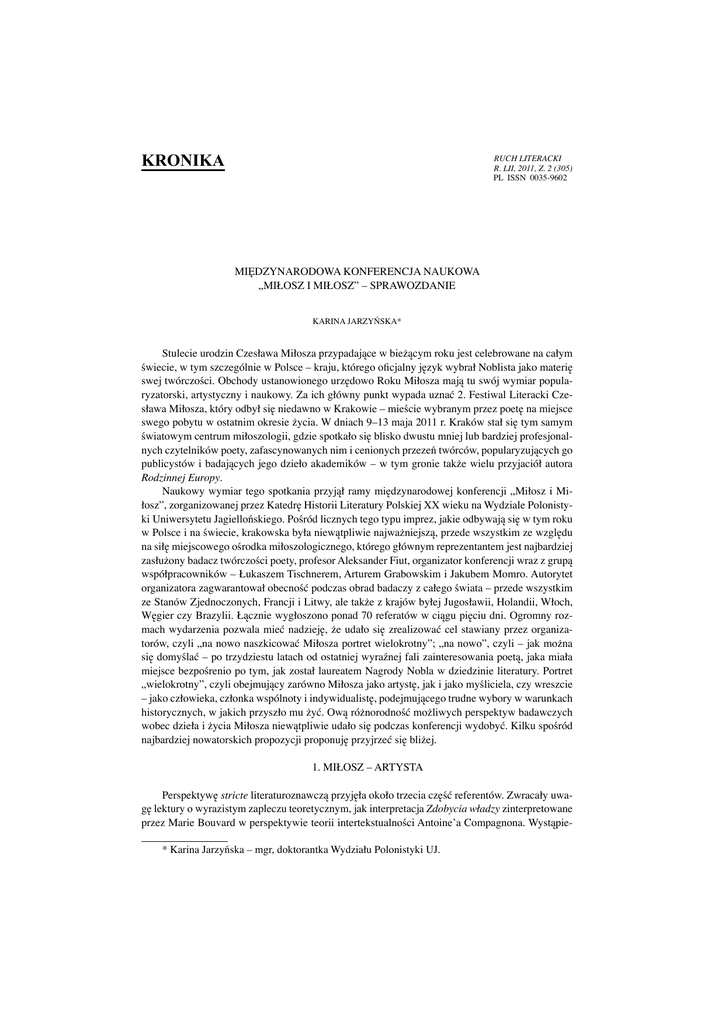 219 RUCH LITERACKI R. LII, 2011, Z. 2 (305) PL ISSN 0035-9602 Kronika KRONIKA MIĘDZYNARODOWA KONFERENCJA NAUKOWA „MIŁOSZ I MIŁOSZ” – SPRAWOZDANIE KARINA JARZYŃSKA* Stulecie urodzin Czesława Miłosza przypadające w bieżącym roku jest celebrowane na całym świecie, w tym szczególnie w Polsce – kraju, którego oficjalny język wybrał Noblista jako materię swej twórczości. Obchody ustanowionego urzędowo Roku Miłosza mają tu swój wymiar popularyzatorski, artystyczny i naukowy. Za ich główny punkt wypada uznać 2. Festiwal Literacki Czesława Miłosza, który odbył się niedawno w Krakowie – mieście wybranym przez poetę na miejsce swego pobytu w ostatnim okresie życia. W dniach 9–13 maja 2011 r. Kraków stał się tym samym światowym centrum miłoszologii, gdzie spotkało się blisko dwustu mniej lub bardziej profesjonalnych czytelników poety, zafascynowanych nim i cenionych przezeń twórców, popularyzujących go publicystów i badających jego dzieło akademików – w tym gronie także wielu przyjaciół autora Rodzinnej Europy. Naukowy wymiar tego spotkania przyjął ramy międzynarodowej konferencji „Miłosz i Miłosz”, zorganizowanej przez Katedrę Historii Literatury Polskiej XX wieku na Wydziale Polonistyki Uniwersytetu Jagiellońskiego. Pośród licznych tego typu imprez, jakie odbywają się w tym roku w Polsce i na świecie, krakowska była niewątpliwie najważniejszą, przede wszystkim ze względu na siłę miejscowego ośrodka miłoszologicznego, którego głównym reprezentantem jest najbardziej zasłużony badacz twórczości poety, profesor Aleksander Fiut, organizator konferencji wraz z grupą współpracowników – Łukaszem Tischnerem, Arturem Grabowskim i Jakubem Momro. Autorytet organizatora zagwarantował obecność podczas obrad badaczy z całego świata – przede wszystkim ze Stanów Zjednoczonych, Francji i Litwy, ale także z krajów byłej Jugosławii, Holandii, Włoch, Węgier czy Brazylii. Łącznie wygłoszono ponad 70 referatów w ciągu pięciu dni. Ogromny rozmach wydarzenia pozwala mieć nadzieję, że udało się zrealizować cel stawiany przez organizatorów, czyli „na nowo naszkicować Miłosza portret wielokrotny”; „na nowo”, czyli – jak można się domyślać – po trzydziestu latach od ostatniej wyraźnej fali zainteresowania poetą, jaka miała miejsce bezpośrenio po tym, jak został laureatem Nagrody Nobla w dziedzinie literatury. Portret „wielokrotny”, czyli obejmujący zarówno Miłosza jako artystę, jak i jako myśliciela, czy wreszcie – jako człowieka, członka wspólnoty i indywidualistę, podejmującego trudne wybory w warunkach historycznych, w jakich przyszło mu żyć. Ową różnorodność możliwych perspektyw badawczych wobec dzieła i życia Miłosza niewątpliwie udało się podczas konferencji wydobyć. Kilku spośród najbardziej nowatorskich propozycji proponuję przyjrzeć się bliżej. 1. MIŁOSZ – ARTYSTA Perspektywę stricte literaturoznawczą przyjęła około trzecia część referentów. Zwracały uwagę lektury o wyrazistym zapleczu teoretycznym, jak interpretacja Zdobycia władzy zinterpretowane przez Marie Bouvard w perspektywie teorii intertekstualności Antoine’a Compagnona. Wystąpie* Karina Jarzyńska – mgr, doktorantka Wydziału Polonistyki UJ. 220 Kronika nie to pozwoliło dostrzec, że cytaty z Wojny Peloponeskiej Tukidydesa umieszczone przez Miłosza w jego pierwszej powieści wpisały interesujące go procesy w uniwersalny dyskurs historyczny, podczas gdy przejmujący władzę w Polsce po II wojnie światowej komuniści uważali je za ponadhistoryczne, należące do całkiem nowego porządku. Zwracały też uwagę dwa przykłady podejścia psychoanalitycznego: Marka Zaleskiego refleksja nad stosunkiem poezji Miłosza do rzeczywistości w świetle teorii Jacques’a Lacana i wystąpienie Michała Kłosińskiego. Ostatni z wymienionych referentów zaproponował rewizję dotychczasowych interpretacji cyklu Świat, poema naiwne jako ironicznie sielankowego, rozwijając intuicję Aleksandra Fiuta o przenikającej go ambiwalencji. Jak wykazał młody badacz, ciemna strona domniemanej sielanki staje się widoczna, jeśli podczas lektury będziemy pamiętać o mechanizmach tekstualnego przepracowywania traumy, jakiej poeta doświadczał w chwili tworzenia cyklu (rok 1943, Warszawa). Ciekawa metodologicznie była również propozycja Mateusza Antoniuka, wyprowadzona z pozycji poststrukturalistycznych. Zwrócił on uwagę na momenty, w których ujawnia się metajęzykowa świadomość Miłosza – szczególnie wyraziste wówczas, gdy poeta deklaruje chęć opisania pewnego elementu rzeczywistości, a następnie próbuje zrealizować „teoretyczne w praktycznym” (np. fragment Traktatu poetyckiego rozpoczynający się od słów „Nie, czytelniku, nie zamieszkasz w róży…”). Mniej oczywistymi znakami przekonania Miłosza o „niewystarczalności mowy” są, według badacza, zabiegi problematyzacji koherencji utworów poetyckich (takich jak Biel) i ich referencjalności (np. osłabianie wykorzystywanych metafor). Te obserwacje pozwoliły Antoniukowi przeciwstawić się usytuowaniu Miłosza w gronie „malkontentów” nowoczesności (pogląd Michała Pawła Markowskiego), poprzez stwierdzenie że Noblista „opowiada się za wizją języka, podlegającego ciągłym regulacjom, rearanżacjom, reaktywacjom; języka będącego stale testowaną i kwestionowaną gotowością”1. Znaczna część referatów literaturoznawczych dotyczyła relacji języka poetyckiego Miłosza do jego doświadczenia historycznego, w tym dwa wystąpienia otwierające obrady: George’a Gömöriego Czesław Miłosz: Grappling with History (rekonstrukcja Miłoszowego oscylowania między tworzeniem poezji prywatnej i zaangażowanej) i Thomasa Pavela The Past Was Real (o świadomości poety co do nieadekwatności języka wobec przeszłości i jego nadziei na apokatastasis, restyt