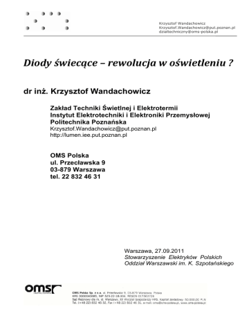 Krzysztof Wandachowicz [email protected] [email protected] Diody świecące – rewolucja w oświetleniu ? dr inż. Krzysztof Wandachowicz Zakład Techniki Świetlnej i Elektrotermii Instytut Elektrotechniki i Elektroniki Przemysłowej Politechnika Poznańska [email protected] http://lumen.iee.put.poznan.pl OMS Polska ul. Przecławska 9 03-879 Warszawa tel. 22 832 46 31 Warszawa, 27.09.2011 Stowarzyszenie Elektryków Polskich Oddział Warszawski im. K. Szpotańskiego Krzysztof Wandachowicz [email protected] [email protected] LED light emitting diode Wg PN-90/E-01005. Technika świetlna. Terminologia. (845-04-40) Dioda elektroluminescencyjna; dioda świecąca; LED – element półprzewodnikowy zawierający złącze P-N, emitujący promieniowanie optyczne po wzbudzeniu złącza prądem elektrycznym. Wraz z pojawieniem się diod świecących wykorzystywanych w technice świetlnej pojawiła się propozycja podziału na 4 generacje lamp: § I generacja - źródła wykorzystujące proces spalania (świeca, lampa naftowa), § II generacja – żarówki (inkadescencja), § III generacja - lampy wyładowcze (elektroluminescencja, fotoluminescencja), § IV generacja – LED (elektroluminescencja plus fotoluminescencja),. Światło w diodach świecących wytwarzane jest dzięki zjawisku elektroluminescencji: § diody LED posiadają złącze dwóch warstw materiałów półprzewodnikowych typu p (posiada nadmiar dziur w paśmie walencyjnym) i typu n (posiada nadmiar elektronów w paśmie walencyjnym), § po przyłożeniu do złącza p-n napięcia w kierunku przewodzenia (+ p, -n) do materiału n będą wstrzykiwane elektrony wzbudzone polem elektrycznym, a do materiału p wstrzykiwane będą dziury, Rys. 1. Dziury i elektrony w półprzewodniku typu p i n. Złącze p-n spolaryzowane w kierunku przewodzenia. § § § § w obszarze złącza p-n wzbudzone elektrony rekombinują z dziurami i pozbywają się nadwyżki energii emitując foton, wartość energii fotonu emitowanego przez elektron w czasie rekombinacji (długość fali emitowanego promieniowania) jest w przybliżeniu równa różnicy energii między poziomem wzbudzenia, a poziomem podstawowym, wartość emitowanej energii fotonu jest wielkością charakterystyczną dla danego materiału półprzewodnikowego, podczas rekombinacji elektronu z dziurą mogą wystąpić dwa zjawiska: rekombinacja promienista z emisją fotonu o energii E≈hv, rekombinacja nie-promienista, energia powstała podczas rekombinacji zamieniana jest na fonon, (fonon to kwant energii drgań cieplnych sieci krystalicznej atomów), wniosek: emisja światła w złączu p-n wiąże się ze wzrostem temperatury tego złącza. Rys. 2. Ilustracja zjawiska rekombinacji promienistej oraz rekombinacji nie promienistej (źródło: E. Fred Schubert Light Emitting Diodes and Solid-State Lighting). Krzysztof Wandachowicz [email protected] [email protected] Historia LED § 1907 - Henry Joseph Round (1881-1966) po raz pierwszy zaobserwował emisję światła z kryształu węglika krzemu (SiC) o przewodnictwie typu n na złączu metal – półprzewodnik (brak złącza p-n). § 1936 - Georges Destriau publikuje wyniki badań luminescencji ze sproszkowanego siarczku cynku ZnS. § eksperymenty z różnymi materiałami: GaAs (arsenek galu), AlGaAs (związek potrójny arsenu, galu i glinu), GaP (fosforek galu), GaAsP (związek potrójny galu, arsenu i fosforu), GaN (azotek galu), GaInN (związek potrójny galu indu i azotu) oraz AlGaInP (związek poczwórny glinu, galu, indu i fosforu), § 1962 – pierwsza dioda świecąca dostępna w sprzedaży, światło czerwone 710nm, materiał GaAsP (związek galu, arsenu i fosforu), § 1971 – dostępne diody w kolorach zielonym, pomarańczowym i żółtym, § 1980 - 1990 - diody o większej skuteczności świetlnej w kolorach czerwonym, pomarańczowym, żółtym i zielonym, zastosowano nowy materiał AlInGaP (glin, ind, gal i fosfor) § prace nad diodami światła niebieskiego: - 1969 – Pankove, GaN (azotek galu) jako materiał typu n na podłożu z metalu długość fali 475nm, - SiC (węglik krzemu) diody ze światłem niebieskim o światłości 10-20 mcd, - 1993 Shuji Nakamura (firma Nichia), InGaN / GaN (ind, gal, azot) ze złączem p-n, światłość 1cd, - 1994 Shuji Nakamura, dioda zielono-niebieska o światłości 2 cd, § 1995 – pierwsza dioda światła białego, które uzyskano z konwersji światła niebieskiej diody z luminoforem, § 1997 – białe diody powszechnie dostępne na rynku. Podstawowe wiadomości na temat budowy i właściwości LED Rys. 3. Budowa diody małej mocy wykonanej w tzw. technologii 5mm z soczewką (montaż przewlekany). Dioda światła chromatycznego (z lewej) oraz dioda światła białego (z prawej). Rys. 4. Budowa diody dużej mocy (1 – 3 W) w technologii montażu powierzchniowego (SMD Surface Mounted Devices). Złącze p-n zamontowane na podstawie metalowej odprowadzającej ciepło (heatsink). Krzysztof Wandachowicz [email protected] [email protected] Tabela 1. Barwa promieniowania diod zbudowanych z różnych materiałów. Materiał Barwa promieniowania AlInGaP glin, ind, gal, fosfor czerwona, pomarańczowa, żółta InGaN ind, gal, azot zielona, niebieska Rys. 5. Skuteczność świetlna promieniowania diod zbudowanych z różnych materiałów. Uwaga: brak diody o wysokiej skuteczności świetlnej w paśmie 550nm (2000 rok). (źródło: E. Fred Schubert: Light Emitting Diodes and .....). Rys. 6. Położenie współrzędnych barwy na wykresie CIE XYZ. Barwy czerwone, pomarańczowe, barwa niebieska – duże nasycenie (barwy widmowe). Barwy niebiesko-zielone i zielone – mniejsze nasycenie. (źródło: E. F. Schubert). Rys. 7. Typowe rozkłady widmowe diod LED (Toyoda Gosei Corp. 2000). Zielone diody posiadają większą szerokość widma pasmowego, brak diody dla długości fali 550nm (źródło: E. Fred Schubert). Krzysztof Wandachowicz [email protected] [email protected] Diody światła białego: Prom