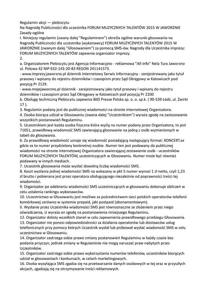 Regulamin akcji — plebiscytu Na Nagrodę Publiczności dla uczestnika FORUM MUZYCZNYCH TALENTÓW 2015 W JAWORZNIE Zasady ogólne I. Niniejszy regulamin (zwany dalej "Regulaminem") określa ogólne warunki głosowania na Nagrodę Publiczności dla uczestnika (wykonawcy) FORUM MUZYCZNYCH TALENTÓW 2015 W JAWORZNIE (zwanym dalej "Głosowaniem") za pomocą SMS-ów. Nagrody dla Uczestnika imprezy: FORUM MUZYCZNYCH TALENTÓW zapewnia organizator imprezy. 2. a. Organizatorem Plebiscytu jest Agencja Informacyjno - reklamowa "All-Info" Nela Tura Jaworzno ul. Polowa 42 NIP 632-143-20-83 REGON 241141573. - www.imprezy.jaworzno.pl dziennik Internetowy Serwis Informacyjny - zarejestrowany jako tytuł prasowy i wpisany do rejestru dzienników i czasopism przez Sąd Okręgowy w Katowicach pod pozycją Pr 2129. - www.mojejaworzno.pl dziennik - zarejestrowany jako tytuł prasowy i wpisany do rejestru dzienników i czasopism przez Sąd Okręgowy w Katowicach pod pozycją Pr 2200 b. Obsługę techniczną Plebiscytu zapewnia BilD Presse Polska sp. o. o. sp.k. ( 90-539 Łódź, ul. Żwirki 17 ). 3. Regulamin podany jest do publicznej wiadomości na stronie internetowej Organizatora. 4. Osoba biorąca udział w Głosowaniu (zwana dalej "Uczestnikiem") wyraża zgodę na zastosowanie wszystkich postanowień Regulaminu. 5. Uczestnikiem jest każda osoba fizyczna która wyślą na numer podany przez Organizatora, to jest 71051, prawidłową wiadomość SMS zawierającą głosowanie na jedną z osób wymienionych w tabeli do głosowania. 6. Za prawidłową wiadomość uznaje się wiadomość posiadającą następujący format: KONCERT.xx gdzie xx to numer przydzielony konkretnej osobie. Numer ten jest podawany do publicznej wiadomości na stronie internetowej Organizatora zawierającej zestawienie osób - uczestników FORUM MUZYCZNYCH TALENTÓW, uczestniczących w Głosowaniu. Numer może być również podawany w innych mediach. 7. Uczestnik głosowania może wysłać dowolną liczbę wiadomości SMS. 8. Koszt wysłania jednej wiadomości SMS na wskazany w pkt 5 numer wynosi 1 zł netto, czyli 1,23 zł brutto i pobierana jest przez operatora obsługującego niezależnie od poprawności treści tej wiadomości. 9. Organizator po odebraniu wiadomości SMS uczestniczących w głosowaniu dokonuje obliczeń w celu ustalenia rankingu wykonawców. 10. Uczestnictwo w Głosowaniu jest możliwe za pośrednictwem sieci polskich operatorów telefonii komórkowej zarówno w systemie prepaid, jaki postpaid (abonamentowym). II. Wysłanie przez Uczestnika wiadomości SMS jest równoznaczne ze złożeniem przez niego oświadczenia, iż wyraża on zgodę na postanowienia niniejszego Regulaminu. 12. Organizator dołoży wszelkich starań w celu zapewnienia prawidłowego przebiegu Głosowania. 13. Organizator nie ponosi odpowiedzialności za działania operatorów lub dostawców usług telefonicznych przy pomocy których Uczestnik wysłał lub próbował wysłać wiadomość SMS w celu uczestnictwa w Głosowaniu. 14. Organizator zastrzega sobie prawo zmiany postanowień Regulaminu w każdy czasie bez podania przyczyn, jednak zmiany w Regulaminie nie mogą naruszać praw nabytych przez Uczestników. 15. Organizator zastrzega sobie prawo wykorzystania numerów telefonów, uczestników biorących udział w głosowaniach i konkursach, w celach marketingowych. 16. Osoba wysyłająca SMS zgadza się na przetwarzanie danych osobowych w tej oraz w przyszłych akcjach, zgadzają się na otrzymywanie treści reklamowych. Postanowienia końcowe 17. Uczestnicy niniejszego głosowania zobowiązani są do przestrzegania poniższych zasad: a) stosowania się do ogólnie pojmowanych zasad fair play w grach i konkursach, w szczególności wiadomości SMS nie będą wysyłane z komputera lub z aplikacji komputerowych podłączonych do telefonu komórkowego. b) niewykorzystywania usług dodanych do celów sprzecznych z prawem lub do celów nieprzewidzianych przez operatora, Organizatora lub twórców usług dodanych, w tym do celów komercyjnych i politycznych. 18. Organizator zastrzega sobie prawo zmian Regulaminu w każdym czasie bez podania przyczyny. Zmiany w Regulaminie nie mogą naruszać praw nabytych przez Uczestników. 19. Regulamin niniejszy jest jedynym dokumentem określającym zasady Konkursu. Wszystkie treści zawarte w materiałach reklamowo-promocyjnych mają charakter jedynie informacyjny. Moc prawną mająjedynie postanowienia niniejszego Regulaminu i są wyłączną podstawą prowadzenia Plebiscytu, a ich wykładnia i interpretacja należy wyłącznie do Organizatora. 20. Organizator nie ma obowiązku weryfikacji danych wskazanych przez osobę biorącą udział w Konkursie z danymi abonenta telefonu komórkowego, z którego zostało wykonane połączenie. 21. Organizator nie ponosi odpowiedzialności za ewentualne nieprawidłowości w połączeniach telefonicznych (w tym SMS -owych) określonych w niniejszym Regulaminie, jak również za przypadki wykonania połączeń przez osoby nieuprawnione. 22. Głosy są przyjmowane i rejestrowane przez automatyczny system zgłoszeń, który określa czas odbioru Wiadomości SMS. 23. Dane zarejestrowane przez automatyczny system zgłoszeń są rozstrzygające dla ustalenia wyników w Konkursie. 24. Laureat nie może przenieść praw do przyznanej nagrody na osoby trzecie. Laureat ma możliwość zrzeczenia się prawa do przyznanej mu nagrody, składając Organizatorowi stosowne oświadczenie na piśmie. Nie ma możliwości wymiany nagrody na równowartość pieniężną. 25. Wyniki Konkursu, w tym imię i nazwisko Laureatów Konkursu wraz z ewentualnymi odredakcyjnymi komentarzami mogą być publikowane na stronie internetowej organizatora. 26. Organizator nie posiada dostępu do danych osobowych użytkowników i nie ma możliwości identyfikacji użytkownika za pośrednictwem numeru telefonu. Jeśli użytkownik w związku z korzystaniem z Usługi poda Organizatorowi dane osobowe, dane te b