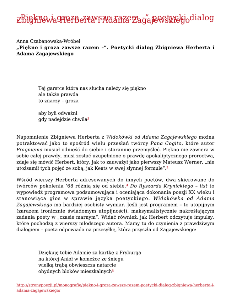 „Piękno i groza zawsze razem -” poetycki dialog Zbigniewa Herberta i Adama Zagajewskiego Anna Czabanowska-Wróbel „Piękno i groza zawsze razem –”. Poetycki dialog Zbigniewa Herberta i Adama Zagajewskiego Tej garstce która nas słucha należy się piękno ale także prawda to znaczy – groza aby byli odważni gdy nadejdzie chwila1 Napomnienie Zbigniewa Herberta z Widokówki od Adama Zagajewskiego można potraktować jako to spośród wielu przesłań twórcy Pana Cogito, które autor Pragnienia musiał odnieść do siebie i starannie przemyśleć. Piękno nie zawiera w sobie całej prawdy, musi zostać uzupełnione o prawdę apokaliptycznego proroctwa, zdaje się mówić Herbert, który, jak to zauważył jako pierwszy Mateusz Werner, „nie utożsamił tych pojęć ze sobą, jak Keats w swej słynnej formule”.2 Wśród wierszy Herberta adresowanych do innych poetów, dwa skierowane do twórców pokolenia ‘68 różnią się od siebie. 3 Do Ryszarda Krynickiego – list to wypowiedź programowa podsumowująca i oceniająca dokonania poezji XX wieku i stanowiąca głos w sprawie języka poetyckiego. Widokówka od Adama Zagajewskiego ma bardziej osobisty wymiar. Jeśli jest programem – to utopijnym (zarazem ironicznie świadomym utopijności), maksymalistycznie nakreślającym zadania poety w „czasie marnym”. Widać również, jak Herbert odczytuje impulsy, które pochodzą z wierszy młodszego autora. Mamy tu do czynienia z prawdziwym dialogiem – poeta odpowiada na przesyłkę, która przyszła od Zagajewskiego: Dziękuję tobie Adamie za kartkę z Fryburga na której Anioł w komeżce ze śniegu wielką trąbą obwieszcza natarcie ohydnych bloków mieszkalnych4 http://stronypoezji.pl/monografie/piekno-i-groza-zawsze-razem-poetycki-dialog-zbigniewa-herberta-iadama-zagajewskiego/ Nadawca ostrzega przed nieuchronnym atakiem brzydoty na „twoją i moją katedrę”; ochrona symbolicznej świątyni to motyw, który Herbert niejako wpisał w interpretacje utworów autora Gotyku i zrosła się ona na trwałe z wyobrażeniem o jego twórczości. 5 W monologu poetyckim Herberta pojawia się też surowe pouczenie. W świątecznym zapewne aniołku z pocztówki dopatruje się podmiot wiersza apokaliptycznej figury losu6: Anioł w komeżce pierwszego śniegu jest zaprawdę Aniołem Zagłady podnosi trąbę do ust przywołuje pożar […] i wstąpimy osobno w roztopione niebo7 Jak często u Herberta, wiersz ma też swoje drugie, ironiczne oblicze – ukazuje degradację intelektualisty, przedstawia poetę we współczesnej roli niechcianego proroka, wędrownego kaznodziei i komiwojażera piękna: „Das war sehr schőn, Herr Zagajewski.” „Wirklich sehr schőn.” […] A więc jesteś we Fryburgu ja też niegdyś tam byłem aby zarobić łatwo na papier i chleb Pod cynicznym sercem nosiłem naiwne złudzenie że jestem Apostołem w podróży służbowej8 Doceniając rolę poezji Herberta w twórczości Zagajewskiego, Jarosław Klejnocki wskazuje na tytułowy wiersz tomu Ziemia ognista jako nieoczywistą „dopowiedź” Zagajewskiego do Widokówki… i zauważa: Poezjowanie staje się grą, której reguły polegają na znalezieniu modus vivendi między poniżającą w pewnym sensie doczesnością (jej znaki to ohydne blokowiska Warszawy, Drezna, Paryża, Düsseldorfu) […], a możliwością wejrzenia (poprzez fenomen lirycznego tremendum) w obszar wyższy […]. Zarysowaną przez Herberta sprzeczność między pięknem a grozą (więc od razu http://stronypoezji.pl/monografie/piekno-i-groza-zawsze-razem-poetycki-dialog-zbigniewa-herberta-iadama-zagajewskiego/ dodajmy: cierpieniem) spotykamy właśnie w […] tomikach Płótno i Ziemia ognista. Rozdarcie to stanowi jakby oś symetrii, wokół której oscylują, obracają się wiersze.9 Między Herbertem a Zagajewskim toczył się przez wiele lat, z czasem coraz bardziej intensywny, wielowątkowy dialog dotyczący sytuacji sztuki i artysty, zagadnień estetycznych i etycznych, malarstwa i muzyki.10 Równolegle rozwijały się dzieje znajomości, a następnie przyjaźni obu twórców. Młodszemu z poetów przypadła w udziale rola ucznia, adepta, Zbigniewowi Herbertowi – rola mistrza; mimo upływu lat sytuacja ta nie uległa zmianie, a nawet, po śmierci autora Barbarzyńcy w ogrodzie, gdy głos zabiera jedynie Zagajewski, wrażenie to się nasila, gdyż pośmiertne eseje i elegie akcentują znaczenie Herberta jako autorytetu poetyckiego. Herbert był dla autora tomu Jechać do Lwowa „pierwszym poetą”, zarówno w porządku biograficznym, jak i literackim. „Był pierwszym prawdziwym poetą jakiego usłyszałem”11 – to wyznanie z autobiograficznego eseju powracało wielokrotnie: Któregoś dnia do naszego liceum w Gliwicach przyszedł Zbigniew Herbert […]. Odtąd miałem już uważnie śledzić jego twórczość.12 W skróconej, ale uzupełnionej o datę dzienną, wersji trafiło nawet do lapidarnej noty o poecie na stronie internetowej wydawnictwa a5: Dzieciństwo spędził w Gliwicach, tam też uczęszczał do liceum ogólnokształcącego (15 kwietnia 1963 r. odwiedził je Zbigniew Herbert).13 W tomie esejów Obrona żarliwości Adam Zagajewski stwierdził, mając przede wszystkim na myśli Miłosza i Herberta, że polscy poeci współcześni stoją na barkach Gigantów. Przy tej okazji sprzeciwiał się wywiedzionemu z ducha freudyzmu wyobrażeniu o konieczności odegrania przez następców komedii „ojcobójstwa”.14 Wizji przemian w kulturze jako agonu przeciwstawia poeta swoją – następstwa i ciągłości. To przekonanie pozwala zrozumieć, dlaczego jego dialog z http://stronypoezji.pl/monografie/piekno-i-groza-zawsze-razem-poetycki-dialog-zbigniewa-herberta-iadama-zagajewskiego/ Herbertem nie jest walką, choć nie jest też wyłącznie kontynuacją. Już we wczesnej wypowiedzi Zagajewskiego z napisanego wraz z poetąrówieśnikiem tomu Świat nie przedstawiony dominuje przychylność wobec pochodzą