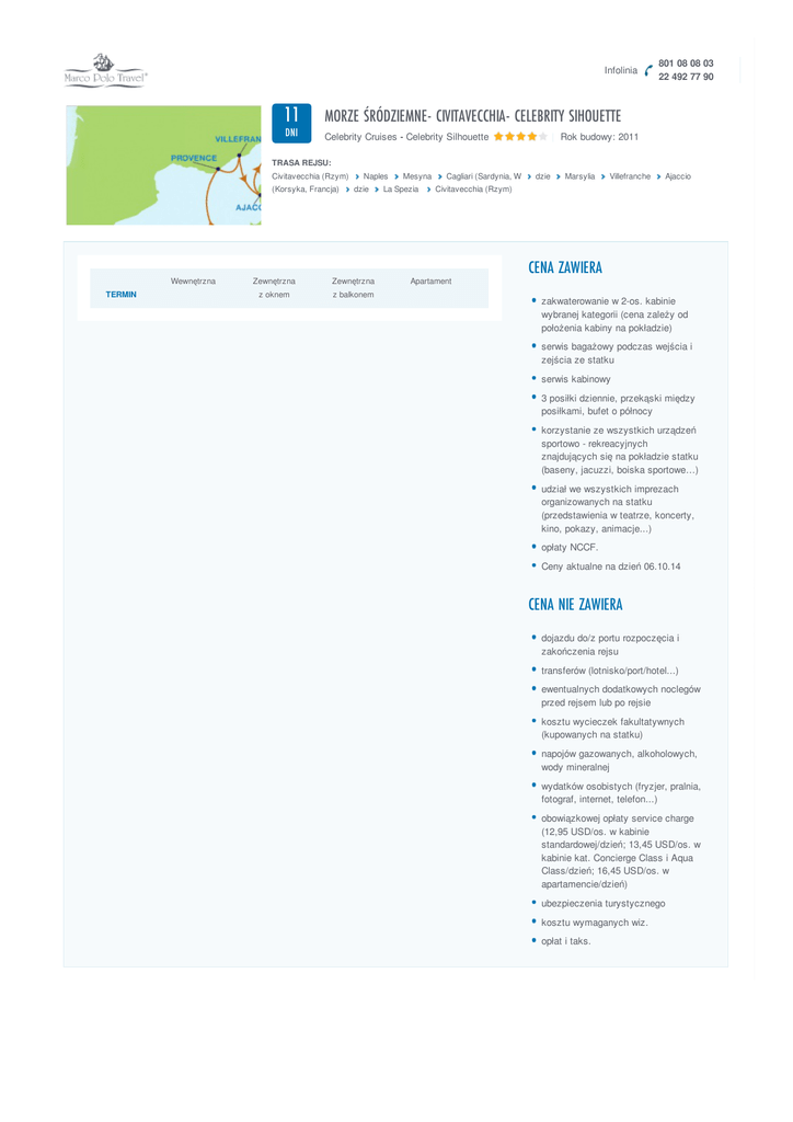 Infolinia 11 MORZE ŚRÓDZIEMNE- CIVITAVECCHIA- CELEBRITY SIHOUETTE DNI Celebrity Cruises - Celebrity Silhouette 801 08 08 03 22 492 77 90 | Rok budowy: 2011 TRASA REJSU: Civitavecchia (Rzym) (Korsyka, Francja) Wewnętrzna TERMIN Naples dzie Zewnętrzna Zewnętrzna z oknem z balkonem Mesyna La Spezia Cagliari (Sardynia, W dzie Marsylia Villefranche Ajaccio Civitavecchia (Rzym) Apartament CENA ZAWIERA zakwaterowanie w 2-os. kabinie wybranej kategorii (cena zależy od położenia kabiny na pokładzie) serwis bagażowy podczas wejścia i zejścia ze statku serwis kabinowy 3 posiłki dziennie, przekąski między posiłkami, bufet o północy korzystanie ze wszystkich urządzeń sportowo - rekreacyjnych znajdujących się na pokładzie statku (baseny, jacuzzi, boiska sportowe…) udział we wszystkich imprezach organizowanych na statku (przedstawienia w teatrze, koncerty, kino, pokazy, animacje...) opłaty NCCF. Ceny aktualne na dzień 06.10.14 CENA NIE ZAWIERA dojazdu do/z portu rozpoczęcia i zakończenia rejsu transferów (lotnisko/port/hotel...) ewentualnych dodatkowych noclegów przed rejsem lub po rejsie kosztu wycieczek fakultatywnych (kupowanych na statku) napojów gazowanych, alkoholowych, wody mineralnej wydatków osobistych (fryzjer, pralnia, fotograf, internet, telefon...) obowiązkowej opłaty service charge (12,95 USD/os. w kabinie standardowej/dzień; 13,45 USD/os. w kabinie kat. Concierge Class i Aqua Class/dzień; 16,45 USD/os. w apartamencie/dzień) ubezpieczenia turystycznego kosztu wymaganych wiz. opłat i taks.