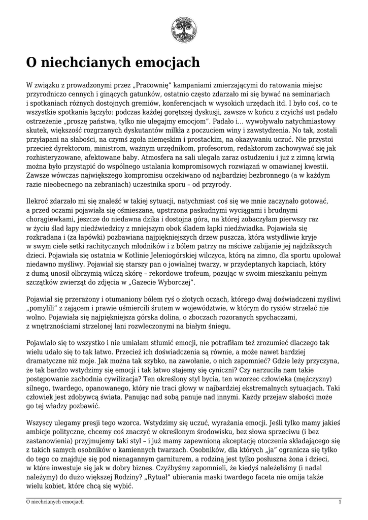 O niechcianych emocjach W związku z prowadzonymi przez „Pracownię” kampaniami zmierzającymi do ratowania miejsc przyrodniczo cennych i ginących gatunków, ostatnio często zdarzało mi się bywać na seminariach i spotkaniach różnych dostojnych gremiów, konferencjach w wysokich urzędach itd. I było coś, co te wszystkie spotkania łączyło: podczas każdej gorętszej dyskusji, zawsze w końcu z czyichś ust padało ostrzeżenie „proszę państwa, tylko nie ulegajmy emocjom”. Padało i… wywoływało natychmiastowy skutek, większość rozgrzanych dyskutantów milkła z poczuciem winy i zawstydzenia. No tak, zostali przyłapani na słabości, na czymś zgoła niemęskim i prostackim, na okazywaniu uczuć. Nie przystoi przecież dyrektorom, ministrom, ważnym urzędnikom, profesorom, redaktorom zachowywać się jak rozhisteryzowane, afektowane baby. Atmosfera na sali ulegała zaraz ostudzeniu i już z zimną krwią można było przystąpić do wspólnego ustalania kompromisowych rozwiązań w omawianej kwestii. Zawsze wówczas największego kompromisu oczekiwano od najbardziej bezbronnego (a w każdym razie nieobecnego na zebraniach) uczestnika sporu – od przyrody. Ilekroć zdarzało mi się znaleźć w takiej sytuacji, natychmiast coś się we mnie zaczynało gotować, a przed oczami pojawiała się ośmieszana, upstrzona paskudnymi wyciągami i brudnymi chorągiewkami, jeszcze do niedawna dzika i dostojna góra, na której zobaczyłam pierwszy raz w życiu ślad łapy niedźwiedzicy z mniejszym obok śladem łapki niedźwiadka. Pojawiała się rozkradana i (za łapówki) pozbawiana najpiękniejszych drzew puszcza, która wstydliwie kryje w swym ciele setki rachitycznych młodników i z bólem patrzy na mściwe zabijanie jej najdzikszych dzieci. Pojawiała się ostatnia w Kotlinie Jeleniogórskiej wilczyca, którą na zimno, dla sportu upolował niedawno myśliwy. Pojawiał się starszy pan o jowialnej twarzy, w przydeptanych kapciach, który z dumą unosił olbrzymią wilczą skórę – rekordowe trofeum, pozując w swoim mieszkaniu pełnym szczątków zwierząt do zdjęcia w „Gazecie Wyborczej”. Pojawiał się przerażony i otumaniony bólem ryś o złotych oczach, którego dwaj doświadczeni myśliwi „pomylili” z zającem i prawie uśmiercili śrutem w województwie, w którym do rysiów strzelać nie wolno. Pojawiała się najpiękniejsza górska dolina, o zboczach rozoranych spychaczami, z wnętrznościami strzelonej łani rozwleczonymi na białym śniegu. Pojawiało się to wszystko i nie umiałam stłumić emocji, nie potrafiłam też zrozumieć dlaczego tak wielu udało się to tak łatwo. Przecież ich doświadczenia są równie, a może nawet bardziej dramatyczne niż moje. Jak można tak szybko, na zawołanie, o nich zapomnieć? Gdzie leży przyczyna, że tak bardzo wstydzimy się emocji i tak łatwo stajemy się cyniczni? Czy narzuciła nam takie postępowanie zachodnia cywilizacja? Ten określony styl bycia, ten wzorzec człowieka (mężczyzny) silnego, twardego, opanowanego, który nie traci głowy w najbardziej ekstremalnych sytuacjach. Taki człowiek jest zdobywcą świata. Panując nad sobą panuje nad innymi. Każdy przejaw słabości może go tej władzy pozbawić. Wszyscy ulegamy presji tego wzorca. Wstydzimy się uczuć, wyrażania emocji. Jeśli tylko mamy jakieś ambicje polityczne, chcemy coś znaczyć w określonym środowisku, bez słowa sprzeciwu (i bez zastanowienia) przyjmujemy taki styl – i już mamy zapewnioną akceptację otoczenia składającego się z takich samych osobników o kamiennych twarzach. Osobników, dla których „ja” ogranicza się tylko do tego co znajduje się pod nienagannym garniturem, a rodziną jest tylko posłuszna żona i dzieci, w które inwestuje się jak w dobry biznes. Czyżbyśmy zapomnieli, że kiedyś należeliśmy (i nadal należymy) do dużo większej Rodziny? „Rytuał” ubierania maski twardego faceta nie omija także wielu kobiet, które chcą się wybić. O niechcianych emocjach 1 I jak tu w sali, wypełnionej w większości przez „twardych facetów”, gdzie tak mało jest współodczuwających osób (tych kobiecych kobiet i wrażliwych mężczyzn) mówić o przerażonych, umierających wilkach i rysiach, o zdeptanej godności góry, o przerobionych na kiczowate mebelki sędziwych puszczańskich dębach, jesionach, lipach, o odcisku niedźwiedziej łapy na mokrym śniegu – jak trafić do opancerzonych serc i umysłów? A jednak trzeba to robić, trzeba krzyczeć z wypiekami na twarzy, najgłośniej właśnie w takich miejscach. I pilnować, by nie traktowano nas protekcjonalnie, z przymrużeniem oka, by nie sprowadzono naszej roli do milutkiej maskotki uładniającej szarawe gremium i by nie zbijały nas z tropu głupawe dowcipy o dwuznacznych podtekstach. To niezwykle wyczerpująca psychicznie i fizycznie rola. Ale warto to robić, chociażby po to, by móc jeszcze choć raz dotknąć topniejącego śniegu w miejscu, gdzie godzinę wcześniej odcisnęła swój ślad niedźwiedzica z małym. Sabina Nowak O niechcianych emocjach 2
