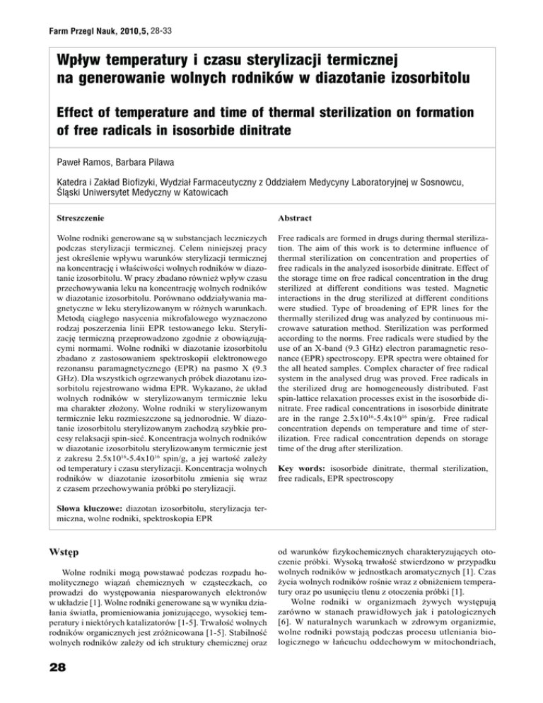 &ARM0RZEGL.AUK 7PYWTEMPERATURYICZASUSTERYLIZACJITERMICZNEJ NAGENEROWANIEWOLNYCHRODNIKÌWWDIAZOTANIEIZOSORBITOLU %FFECTOFTEMPERATUREANDTIMEOFTHERMALSTERILIZATIONONFORMATION OFFREERADICALSINISOSORBIDEDINITRATE 0AWE2AMOS"ARBARA0ILAWA +ATEDRAI:AKAD"IOFIZYKI7YDZIA&ARMACEUTYCZNYZ/DDZIAEM-EDYCYNY,ABORATORYJNEJW3OSNOWCU gLSKI5NIWERSYTET-EDYCZNYW+ATOWICACH Streszczenie Abstract Wolne rodniki generowane są w substancjach leczniczych podczas sterylizacji termicznej. Celem niniejszej pracy jest określenie wpływu warunków sterylizacji termicznej na koncentrację i właściwości wolnych rodników w diazotanie izosorbitolu. W pracy zbadano również wpływ czasu przechowywania leku na koncentrację wolnych rodników w diazotanie izosorbitolu. Porównano oddziaływania magnetyczne w leku sterylizowanym w różnych warunkach. Metodą ciągłego nasycenia mikrofalowego wyznaczono rodzaj poszerzenia linii EPR testowanego leku. Sterylizację termiczną przeprowadzono zgodnie z obowiązującymi normami. Wolne rodniki w diazotanie izosorbitolu zbadano z zastosowaniem spektroskopii elektronowego rezonansu paramagnetycznego (EPR) na pasmo X (9.3 GHz). Dla wszystkich ogrzewanych próbek diazotanu izosorbitolu rejestrowano widma EPR. Wykazano, że układ wolnych rodników w sterylizowanym termicznie leku ma charakter złożony. Wolne rodniki w sterylizowanym termicznie leku rozmieszczone są jednorodnie. W diazotanie izosorbitolu sterylizowanym zachodzą szybkie procesy relaksacji spin-sieć. Koncentracja wolnych rodników w diazotanie izosorbitolu sterylizowanym termicznie jest z zakresu 2.5x1016-5.4x1016 spin/g, a jej wartość zależy od temperatury i czasu sterylizacji. Koncentracja wolnych rodników w diazotanie izosorbitolu zmienia się wraz z czasem przechowywania próbki po sterylizacji. Free radicals are formed in drugs during thermal sterilization. The aim of this work is to determine influence of thermal sterilization on concentration and properties of free radicals in the analyzed isosorbide dinitrate. Effect of the storage time on free radical concentration in the drug sterilized at different conditions was tested. Magnetic interactions in the drug sterilized at different conditions were studied. Type of broadening of EPR lines for the thermally sterilized drug was analyzed by continuous microwave saturation method. Sterilization was performed according to the norms. Free radicals were studied by the use of an X-band (9.3 GHz) electron paramagnetic resonance (EPR) spectroscopy. EPR spectra were obtained for the all heated samples. Complex character of free radical system in the analysed drug was proved. Free radicals in the sterilized drug are homogeneously distributed. Fast spin-lattice relaxation processes exist in the isosorbide dinitrate. Free radical concentrations in isosorbide dinitrate are in the range 2.5x1016-5.4x1016 spin/g. Free radical concentration depends on temperature and time of sterilization. Free radical concentration depends on storage time of the drug after sterilization. Key words: isosorbide dinitrate, thermal sterilization, free radicals, EPR spectroscopy Słowa kluczowe: diazotan izosorbitolu, sterylizacja termiczna, wolne rodniki, spektroskopia EPR Wstęp Wolne rodniki mogą powstawać podczas rozpadu homolitycznego wiązań chemicznych w cząsteczkach, co prowadzi do występowania niesparowanych elektronów w układzie [1]. Wolne rodniki generowane są w wyniku działania światła, promieniowania jonizującego, wysokiej temperatury i niektórych katalizatorów [1-5]. Trwałość wolnych rodników organicznych jest zróżnicowana [1-5]. Stabilność wolnych rodników zależy od ich struktury chemicznej oraz od warunków fizykochemicznych charakteryzujących otoczenie próbki. Wysoką trwałość stwierdzono w przypadku wolnych rodników w jednostkach aromatycznych [1]. Czas życia wolnych rodników rośnie wraz z obniżeniem temperatury oraz po usunięciu tlenu z otoczenia próbki [1]. Wolne rodniki w organizmach żywych występują zarówno w stanach prawidłowych jak i patologicznych [6]. W naturalnych warunkach w zdrowym organizmie, wolne rodniki powstają podczas procesu utleniania biologicznego w łańcuchu oddechowym w mitochondriach, COPYRIGHT'RUPADR!2+WIECIÊSKIEGO)33. w przebiegu niektórych reakcji enzymatycznych katalizowanych przez enzymy, podczas autooksydacji związków biologicznie czynnych oraz w procesach fagocytozy [6]. Reakcje wolnorodnikowe towarzyszą przemianom ksenobiotyków w organizmie [7]. Wolne rodniki powstają w procesach enzymatycznej hydroksylacji niektórych leków [7]. Warunkiem prawidłowego funkcjonowania organizmu jest regulacja poziomu wolnych rodników w tkankach [7]. Brak równowagi pomiędzy powstawaniem i usuwaniem wolnych rodników z organizmu może stanowić przyczynę destrukcji struktur biologicznych. Wolne rodniki oddziałują negatywnie na białka, kwasy nukleinowe, inaktywują enzymy oraz niszczą błony komórkowe [7]. Reakcje wolnorodnikowe mają duże znaczenie w wielu stanach chorobowych i procesach zachodzących w organizmach [7]. Wolne rodniki odgrywają rolę w stanach zapalnych, chorobie niedokrwiennej serca, chorobach genetycznych i nowotworowych, niewydolności oddechowej, chorobach neurologicznych, chorobach przewodu pokarmowego oraz w procesach starzenia się organizmów [7]. Metodą stosowaną do badania wolnych rodników jest spektroskopia elektronowego rezonansu paramagnetycznego (EPR) [6]. W niniejszej pracy metodę EPR wykorzystano w poszukiwaniu optymalnych warunków sterylizacji termicznej diazotanu izosorbitolu. Celem wykonanych badań jest określenie wpływu temperatury i czasu sterylizacji termicznej na koncentrację i właściwości wolnych rodników w diazotanie izosorbitolu. Wyznaczono warunki sterylizacji termicznej diazotanu izosorbitolu, którym towarzyszy generowanie minimalnej ilości wolnych rodników w próbce. Materiały i metody O2N O O O O NO2 Ryc. 1. Wzór strukturalny diazotanu izoso