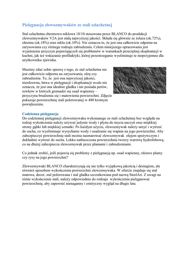 Pielęgnacja zlewozmywaków ze stali szlachetnej Stal szlachetna chromowo-niklowa 18/10 stosowana przez BLANCO do produkcji zlewozmywaków V2A jest stalą najwyższej jakości. Składa się głównie ze żelaza (ok.72%), chromu (ok.18%) oraz niklu (ok.10%). Nie oznacza to, że jest ona całkowicie odporna na zarysowania czy różnego rodzaju zabrudzenia. Celem niniejszego opracowania jest wyjaśnienie przyczyn pojawiających się problemów w warunkach przeciętnej eksploatacji w kuchni, jak też wskazanie profilaktyki, której przestrzeganie wyeliminuje te nieprzyjemne dla użytkownika zjawiska. Musimy zdać sobie sprawę z tego, że stal szlachetna nie jest całkowicie odporna na zarysowania, rdzę czy zabrudzenia. To, że jest ona najwyższej jakości, nierdzewna, łatwa w pielęgnacji i eksploatacji wcale nie oznacza, że jest ona idealnie gładka i nie posiada porów, rowków w których gromadzi się osad wapienny – przyczyna brudzenia się i matowienia powierzchni. Zdjęcie pokazuje powierzchnię stali polerowanej w 480 krotnym powiększeniu. Codzienna pielęgnacja Do codziennej pielęgnacji zlewozmywaka wykonanego ze stali szlachetnej bez względu na rodzaj wykończenia należy używać jedynie wody i płynu do mycia naczyń oraz miękkiej strony gąbki lub miękkiej szmatki. Po każdym użyciu, zlewozmywak należy umyć i wytrzeć do sucha, co wyeliminuje wysychanie wody i osadzanie się wapnia na jego powierzchni. Aby zabezpieczyć powierzchnię stali można nasmarować zlewozmywak olejem spożywczym i dokładnie wytrzeć do sucha. Lekko natłuszczona powierzchnia tworzy warstwę hydrofobową, co na dłużej zabezpiecza zlewozmywak przez plamami i zabrudzeniami. Co jednak zrobić, jeśli pojawią się problemy z pielęgnacją np. osad wapienny, rdzawe plamy czy rysy na jego powierzchni? Zlewozmywaki BLANCO charakteryzują się nie tylko wyjątkową jakością i desingiem, ale również sposobem wykończenia powierzchni zlewozmywaka. W ofercie znajduje się stal matowa, decor, stal polerowana i stal gładka szczotkowana pod nazwą SteelArt. Z uwagi na różne wykończenie stali, należy odpowiednio do rodzaju wykończenia pielęgnować powierzchnię, aby zapewnić nienaganny i estetyczny wygląd na długie lata. Zlewozmywaki ze stali szlachetnej polerowanej Zlewozmywaki ze stali szlachetnej polerowanej np. MEDIAN, LIVIT, LANTOS, LANIS, DANA, AXIS, STRATO, VEKTRIS, DELTA, CLASSIC, STATURALINE, grupa RONDO, RONIS i komory podwieszane UNDERLINE to produkty, które w procesie obróbki są polerowane specjalnymi szczotkami z włókien kaktusa. Ich powierzchnia jest gładka, lśniąca i błyszcząca. Do powierzchni polerowanej producent poleca pastę BLANCOPOLISH, która usuwa wszelkie rysy, zabrudzenia i plamy, a powierzchni przywraca lśniący połysk. Czyszczenie pastą BLANCOPOLISH winno odbywać się na sucho. Należy wytrzeć zlewozmywak do sucha, na suchą specjalną gąbkę do stali SPONTEX nanieść pastę i polerować zlewozmywak. Należy pamiętać, że ociekacz należy polerować wzdłuż, natomiast komorę ruchem kolistym. Po wyczyszczeniu powierzchni należy ją dokładnie spłukać wodą i wytrzeć do sucha. Pasta BLANCOPOLISH z jednej strony czyści i poleruje powierzchnię zlewozmywaka, z drugiej zabezpiecza ją powodując, że woda spływa z powierzchni zlewozmywaka zapobiegając tworzeniu się białych plam od wysychającej wody. Pasta BLANCOPOLISH usuwa również rysy, które mogą pojawić się w trakcie użytkowania zlewozmywaka. Głębokie rysy mogą wymagać długotrwałego lub kilkakrotnego polerowania powierzchni zarysowanej. Zlewozmywaki ze stali szlachetnej matowej i decor Zlewozmywaki matowe, gładkie i w strukturze decor np. TIPO, FLEX, grupa TOP czyli ED, EE, EZ, to produkty, które nie przechodzą żadnej dodatkowej obróbki w procesie produkcyjnym. Stal szlachetna pocięta na formatki jest powlekana specjalną folią i w takiej postaci przechodzi przez kolejne etapy tłoczenia, zaginania krawędzi i wycinania otworów. Folia chroni powierzchnię stali przed zarysowaniem i uszkodzeniem technologicznym podczas całego procesu. Powierzchnia stali jest matowa, bez dodatkowego wykończenia. Są to produkty z najniższego segmentu produktów BLANCO. Tych produktów nie należy polerować. Jak sama nazwa wskazuje jest to powierzchnia matowa. Aby usunąć zabrudzenia z powierzchni decor oraz nie wybłyszczyć gładkiej powierzchni matowej zlewozmywaka, musimy rozpuścić osad wapienny. Producent poleca środek BLANCO ANTIKALK, środek w postaci płynu, odwapniający, bezpieczny dla każdej powierzchni. Środek należy nanieść na powierzchnię produktu, odczekać 15-30min i spłukać wodą. Jeżeli zanieczyszczenia nie rozpuszczą się całkowicie, czynność należy powtórzyć. Po oczyszczeniu powierzchni należy ją wytrzeć do sucha miękką ściereczką z mikrowłókien Blanco. Producent nie zaleca czyszczenia i polerowania stali matowej pastą, gdyż jest to stal surowa bez żadnej obróbki. Polerując powierzchnię możemy spowodować wybłyszczenia w miejscach polerowanych, a stal może przez pewien czas delikatnie brudzić szmatkę podczas wycierania na sucho. Stosując się do wskazówek producenta i wycierając do sucha powierzchnię zlewozmywaka po każdym użyciu, na dłuższy czas zapewnimy mu lśniący wygląd. Jeśli jednak powstaną jakiekolwiek ślady na powierzchni, stosując środki polecane przez producenta i opracowane metody pielęgnacji zapewnimy estetyczny wygląd powierzchni zlewozmywaka, który na długie lata będzie ozdobą w naszej kuchni. Stosując się do wskazówek producenta i pielęgnując zlewozmywak Blanco środkami polecanymi przez producenta, zlewozmywak na długie lata będzie ozdobą w każdej kuchni, a jego pielęgnacja stanie się bardzo prosta i niekłopotliwa. Źródło - http://serwis.comitor.pl/ekspert-radzi/pielegnacja-zlewozmywakow-ze-staliszlachetnej/3/