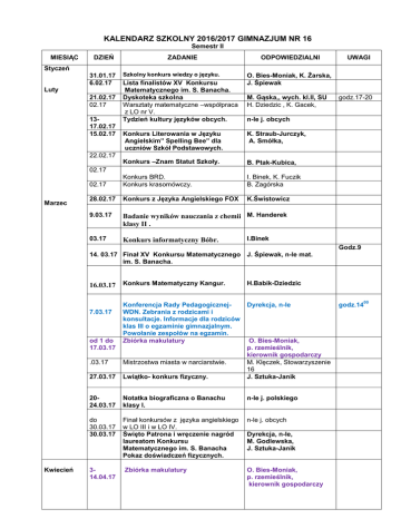 KALENDARZ SZKOLNY 2016/2017 GIMNAZJUM NR 16 Semestr II MIESIĄC DZIEŃ Styczeń 31.01.17 6.02.17 Luty 21.02.17 02.17 1317.02.17 15.02.17 ZADANIE Szkolny konkurs wiedzy o języku. Lista finalistów XV Konkursu Matematycznego im. S. Banacha. Dyskoteka szkolna Warsztaty matematyczne –współpraca z LO nr V. Tydzień kultury języków obcych. ODPOWIEDZIALNI O. Bies-Moniak, K. Żarska, J. Śpiewak M. Gąska,, wych. kl.II, SU H. Dziedzic , K. Gacek, godz.17-20 n-le j. obcych Konkurs Literowania w Języku Angielskim” Spelling Bee” dla uczniów Szkół Podstawowych. K. Straub-Jurczyk, A. Smółka, Konkurs –Znam Statut Szkoły. B. Ptak-Kubica, 02.17 Konkurs BRD. Konkurs krasomówczy. I. Binek, K. Fuczik B. Zagórska 28.02.17 Konkurs z Języka Angielskiego FOX K.Świstowicz 9.03.17 Badanie wyników nauczania z chemii M. Handerek klasy II . 03.17 Konkurs informatyczny Bóbr. 22.02.17 UWAGI 02.17 Marzec I.Binek Godz.9 14. 03.17 Finał XV Konkursu Matematycznego J. Śpiewak, n-le mat. im. S. Banacha. 16.03.17 Konkurs Matematyczny Kangur. 7.03.17 od 1 do 17.03.17 Kwiecień Konferencja Rady PedagogicznejWDN. Zebrania z rodzicami i konsultacje. Informacje dla rodziców klas III o egzaminie gimnazjalnym. Powołanie zespołów na egzamin. Zbiórka makulatury H.Babik-Dziedzic Dyrekcja, n-le O. Bies-Moniak, p. rzemieślnik, kierownik gospodarczy M. Klęczek, Stowarzyszenie 16 J. Sztuka-Janik .03.17 Mistrzostwa miasta w narciarstwie. 27.03.17 Lwiątko- konkurs fizyczny. 2024.03.17 Notatka biograficzna o Banachu klasy I. n-le j. polskiego do 30.03.17 30.03.17 Finał konkursów z języka angielskiego w LO III i w LO IV. Święto Patrona i wręczenie nagród laureatom Konkursu Matematycznego im. S. Banacha Pokaz doświadczeń fizycznych. n-le j. obcych 314.04.17 Zbiórka makulatury O. Bies-Moniak, p. rzemieślnik, kierownik gospodarczy Dyrekcja, n-le, M. Godlewska, J. Sztuka-Janik godz.14 00 6.04.17 Badanie wyników nauczania z plastyki w klasie I. 6.04.17 Spotkanie klas III z dyrektorem szkoły na temat zasad i procedur obowiązujących na egzaminie gimnazjalnym. Konferencja RP. WDN. Zadania zespołów egzaminacyjnych. Zespół wychowawczy dla wszystkich klas. Ferie wiosenne 4.04.17 1318..04.17 A.Boińska Dyrektor szkoły Dyrekcja, n-le Dyrekcja, n-le 04.17 Między klasowe rozgrywki koszykówki dziewcząt i chłopców. 04.17 Między klasowe rozgrywki w piłce siatkowej dziewcząt i chłopców. K. Fuczik 28.04.17 B.Ptak-Kubica, R.Orawczak B.Gac-Salmeri, 1.05.17 Akademia z okazji Konstytucji 3 maja. Organizacja wyjazdu międzyoddziałowego- warsztaty językowe w Rzymie. Dzień wolny od nauki-1 maja 2.05.17 Dzień wolny od zajęć dydaktycznych, Dyrekcja, n-le zajęcia opiekuńcze dla chętnych. 3.05.17 Dzień wolny od nauki-3 maja. Dyrekcja 9.05.17 Badanie wyników nauczania z języka angielskiego w klasach II. K. Świstowicz 11.05.17 Finał konkursu o UE. Dyrekcja, B. Jarecka od 24 do 29.04.17 05.17 16.05.17 Konkurs recytatorski Proteus. Konferencja RP. Ostatni termin sprawozdań zespołów ewaluacyjnych. Wnioski z IPET-ów. Spotkanie z Radą Rodziców. Zebrania z rodzicami, zawiadomienie o ocenach niedostatecznych i ocenie nagannej. Konsultacje dla rodziców. 23.05.17 Dyskoteka szkolna Konkurs ekologiczny dla klas I. 05.17 05.17 Próby do poloneza. 18-19.05. Rajd szkolny, zajęcia terenowe z 17 przedmiotów matematycznoprzyrodniczych iż historii. .05.17 Konkurs fotograficzny- Portrety przyrody. od 15 do Ostatnia zbiórka makulatury. 31.05.17 05.17 Konkurs Mistrz pięknego czytania. 45 Dyrektor 19,20,21. Egzaminy gimnazjalne dla klas III. 04.17 Maj godz.14. Wolne od zajęć dla klas I i II. A. Bryniarska-Briss Dyrekcja poloniści Dyrekcja wychowawcy godz.14 n-le SU, M. Gąska I.Neumann-Piętka n-le wf Dyrektor, wychowawcy, n-le A.Szostek O. Bies-Moniak, p. rzemieślnik, kierownik gospodarczy D.Cieśla, B.Zagórska godz.17-20 Pola Nadziei-podsumowanie. do 31.05.17 Czerwiec katecheci 1.06.17 Dzień Dziecka- dzień sportu lub wyjście do kina. Dyrekcja, n-le 1,2. 5. 06. 2017r. Terminy dodatkowe egzaminu gimnazjalnego, Dyrekcja 06.17 Turnieje Piłki Ręcznej dla Szkół Podstawowych i Gimnazjów. L. Justyniak, n-le wf 7,8.06.17 Wycieczki klasowe. Trzydniowe od 6.06.17. od Informacja o przewidywanych 29.05. ocenach dla uczniów. Podania do uczniów o podwyższenie oceny 6.06.17 rocznej najpóźniej w następnym dniu po uzyskaniu informacji o przewidywanej ocenie. Dyrekcja, wychowawcy, n-le Dyrektor, wychowawcy Podania uczniów o egzamin klasyfikacyjny . Dyrektor Zebrania z rodzicami –informacja o przewidywanych ocenach końcoworocznych i ocenie zachowania. Konsultacje nauczycieli. Dyrekcja .06.16 Podsumowanie konkursu czytelniczego. bibliotekarze 15.06.17 Dzień wolny od nauki-Boże Ciało. Dyrekcja, 16.06.17 Dzień wolny od zajęć dydaktycznych, Dyrekcja, n-le zajęcia opiekuńcze dla chętnych. 14,19. 06.17 Egzaminy klasyfikacyjne. Dyrekcja,n-le 9.06.17 Komers klas III. RR, wychowawcy kl.III 13.06.17 Konferencja klasyfikacyjna RP. Dyrektor 19.06.17 Podsumowanie roku szkolnego. H. Dziedzic, M. Gąska, SU 20.06.17 Konferencja Plenarna Rady Pedagogicznej. Dyrekcja,n-le 22.06.17 Zakończenie roku szkolnego kl. III. do 13.06.17 6.06.17 23.06.17 23.06.17 31.08.17 23.06.17 do 31.08.17 K.Żarska, D.Gałuszka S. Słota , A. Boińska, M. Łożyński, Msza na zakończenie roku szkolnego K.Żarska, D.Gałuszka w Kościele Trójcy Przenajświętszej w S. Słota, A. Boińska, M. Bielsku-Białej. Łożyński Zakończenie roku szkolnego kl. I i II. Ferie letnie. Dyrekcja Przekazanie dokumentacji nauczania. Próba na rozpoczęcie roku szkolnego 2017/2018. Dyrektor, nauczyciele. Dyrektor, nauczyciele godz.14 godz.14 godz. 16 godz.8 godz.9 kl.II i kl. I