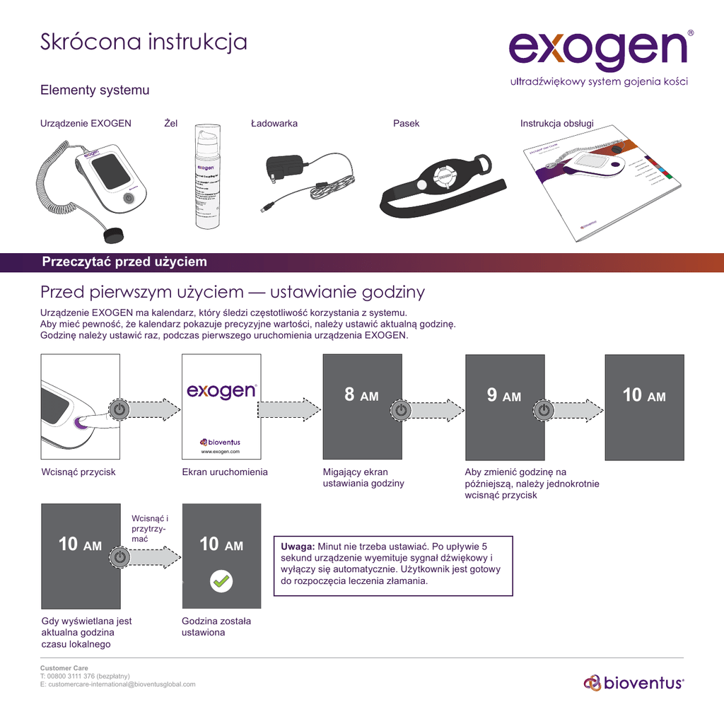Skrócona instrukcja Elementy systemu Urządzenie EXOGEN Żel Ładowarka Pasek Instrukcja obsługi Przeczytać przed użyciem Przed pierwszym użyciem — ustawianie godziny rządzenie EXOGEN ma kalendarz, który śledzi częstotliwość korzystania z systemu. U Aby mieć pewność, że kalendarz pokazuje precyzyjne wartości, należy ustawić aktualną godzinę. Godzinę należy ustawić raz, podczas pierwszego uruchomienia urządzenia EXOGEN. ® 8 AM 9 AM www.exogen.com Wcisnąć przycisk 10 AM Gdy wyświetlana jest aktualna godzina czasu lokalnego Ekran uruchomienia Wcisnąć i przytrzymać 10 AM Godzina została ustawiona Customer Care T: 00800 3111 376 (bezpłatny) E: [email protected] Migający ekran ustawiania godziny Aby zmienić godzinę na późniejszą, należy jednokrotnie wcisnąć przycisk Uwaga: Minut nie trzeba ustawiać. Po upływie 5 sekund urządzenie wyemituje sygnał dźwiękowy i wyłączy się automatycznie. Użytkownik jest gotowy do rozpoczęcia leczenia złamania. 10 AM Instrukcje dotyczące codziennego użytkowania urządzenia Trzymając pasek zaślepką ku górze, należy przełożyć jego długą końcówkę przez klamrę Aby zdjąć zaślepkę, należy ścisnąć jej ucha Założyć pasek tak, aby gniazdo znajdowało się w punkcie „X” i zacisnąć go, pociągając długą końcówkę, a następnie zapiąć Przytrzymać przetwornik w miejscu, w którym łączy się on z przewodem i nałożyć na jego głowicę żel w ilości odpowiadającej jednokrotnemu przyciśnięciu dozownika Umieścić przetwornik w gnieździe w taki sposób, aby żel dotykał skóry 1-42 1 ® 2 3 4 5 6 7 8 9 10 11 12 13 14 15 16 17 18 19 20 21 22 23 24 25 26 27 28 29 30 31 32 33 34 35 36 37 38 39 40 41 42 =0 =0 www.exogen.com Ustawić odpowiednio przewód względem otworu w zaślepce i zatrzasnąć zaślepkę =0 = 0/60 Rozpocząć leczenie Ekran uruchomienia Ekran z kalendarzem Wytrzeć żel z przetwornika, używając do tego miękkiej i suchej szmatki Zdjąć pasek i wyczyścić z niego oraz ze skóry żel, używając do tego miękkiej i suchej szmatki ® 0% 20:00 Zegar zabiegu Zabieg ukończony Po zabiegu Ścisnąć ucha, aby odsłonić gniazdo i delikatnie wyciągnąć przetwornik Streszczenie wskazań użycia: Urządzenie EXOGEN przeznaczone jest do nieinwazyjnego leczenia wszystkich defektów (ubytków) kostnych (z wyłączeniem obszaru kręgów oraz czaszki) obejmującego leczenie opóźnionego zrastania kości, braku zrostu†, złamań przeciążeniowych oraz zespolenia stawów. Urządzenie Bioventus Coöperatief U.A. Taurusavenue 31 2132 LS Hoofddorp Niderlandy EXOGEN wskazane jest również do przyspieszania procesu gojenia świeżych złamań, naprawy po zabiegach osteotomii, naprawy po zabiegach transportu fragmentu kostnego i naprawy w zabiegach osteogenezy dystrakcyjnej. † Za brak zrostu uznaje się sytuację, gdy miejsce złamania nie wykazuje widocznych oznak postępu Customer Care T: 00800 3111 376 (bezpłatny) E: [email protected] procesu gojenia. Nie istnieją znane przeciwwskazania dotyczące stosowania urządzenia EXOGEN. Nie ustalono bezpieczeństwa i skuteczności stosowania tego urządzenia u osób o niedojrzałym układzie kostnym, kobiet w ciąży i karmiących piersią, pacjentów ze stymulatorami serca, w przypadku złamań spowodowanych nowotworem kości ani u pacjentów z niewydolnością krążenia lub zaburzeniami krzepliwości krwi. Niektórzy pacjenci mogą być uczuleni na żel do ultrasonografii. Pełną informację dotyczącą produktu można znaleźć w ulotce dołączonej do opakowania, na stronie www.exogen.com. www.BioventusGlobal.com www.exogen.com EXOGEN i logo Bioventus są zastrzeżonymi znakami towarowymi firmy Bioventus LLC. © 2015 Bioventus LLC SMK-001368