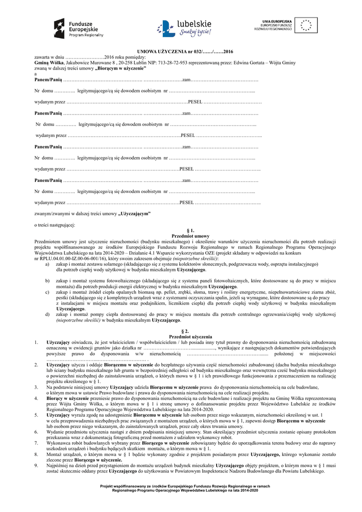 UMOWA UŻYCZENIA nr 032/……/……2016 zawarta w dniu ……………………2016 roku pomiędzy: Gminą Wólka, Jakubowice Murowane 8 , 20-258 Lublin NIP: 713-28-72-953 reprezentowaną przez: Edwina Gortata – Wójta Gminy zwaną w dalszej treści umowy „Biorącym w użyczenie” a Panem/Panią …………………………………………. ……………………zam…………………………………… Nr domu …………. legitymującego/cą się dowodem osobistym nr ……………………………………………... wydanym przez …………………………………………………………………PESEL ……………………………… Panem/Panią …………………………………………. ……………………zam…………………………………… Nr domu …………. legitymującego/cą się dowodem osobistym nr ……………………………………………... wydanym przez …………………………………………………………….PESEL ………………………………….. Panem/Panią …………………………………………. ……………………zam…………………………………… Nr domu …………. legitymującego/cą się dowodem osobistym nr ……………………………………………... wydanym przez …………………………………………………………….PESEL ………………………………….. Panem/Panią …………………………………………. ……………………zam…………………………………… Nr domu …………. legitymującego/cą się dowodem osobistym nr ……………………………………………... wydanym przez …………………………………………………………….PESEL ………………………………….. zwanym/zwanymi w dalszej treści umowy „Użyczającym” o treści następującej: § 1. Przedmiot umowy Przedmiotem umowy jest użyczenie nieruchomości (budynku mieszkalnego) i określenie warunków użyczenia nieruchomości dla potrzeb realizacji projektu współfinansowanego ze środków Europejskiego Funduszu Rozwoju Regionalnego w ramach Regionalnego Programu Operacyjnego Województwa Lubelskiego na lata 2014-2020 – Działanie 4.1 Wsparcie wykorzystania OZE (projekt składany w odpowiedzi na konkurs nr RPLU.04.01.00-IZ.00-06-001/16), który swoim zakresem obejmuje (niepotrzebne skreślić): a) zakup i montaż zestawu solarnego (składającego się z systemu kolektorów słonecznych, podgrzewacza wody, osprzętu instalacyjnego) dla potrzeb ciepłej wody użytkowej w budynku mieszkalnym Użyczającego. b) c) d) 1. 2. 3. 4. 5. 6. 7. 8. 9. zakup i montaż systemu fotowoltaicznego (składającego się z systemu paneli fotowoltaicznych, które dostosowane są do pracy w miejscu montażu) dla potrzeb produkcji energii elektrycznej w budynku mieszkalnym Użyczającego. zakup i montaż źródeł ciepła opalanych biomasą np. pellet, zrębki, słoma, trawy i rośliny energetyczne, niepełnowartościowe ziarna zbóż, pestki (składającego się z kompletnych urządzeń wraz z systemami oczyszczania spalin, jeżeli są wymagane, które dostosowane są do pracy z instalacjami w miejscu montażu oraz podajnikiem, licznikiem ciepła) dla potrzeb ciepłej wody użytkowej w budynku mieszkalnym Użyczającego. zakup i montaż pompy ciepła dostosowanej do pracy w miejscu montażu dla potrzeb centralnego ogrzewania/ciepłej wody użytkowej (niepotrzebne skreślić) w budynku mieszkalnym Użyczającego. § 2. Przedmiot użyczenia Użyczający oświadcza, że jest właścicielem / współwłaścicielem / lub posiada inny tytuł prawny do dysponowania nieruchomością zabudowaną oznaczoną w ewidencji gruntów jako działka nr …………………………..................., wynikające z następujących dokumentów potwierdzających powyższe prawo do dysponowania w/w nieruchomością ………………………………………....... położonej w miejscowości …………………………..………………………… . Użyczający użycza i oddaje Biorącemu w użyczenie do bezpłatnego używania część nieruchomości zabudowanej (dachu budynku mieszkalnego lub ściany budynku mieszkalnego lub gruntu w bezpośredniej odległości od budynku mieszkalnego oraz wewnętrzna cześć budynku mieszkalnego) o powierzchni niezbędnej do zainstalowania urządzeń, o których mowa w § 1 i ich prawidłowego funkcjonowania z przeznaczeniem na realizację projektu określonego w § 1. Na podstawie niniejszej umowy Użyczający udziela Biorącemu w użyczenie prawa do dysponowania nieruchomością na cele budowlane, o którym mowa w ustawie Prawo budowlane i prawa do dysponowania nieruchomością na cele realizacji projektu. Biorący w użyczenie przeniesie prawo do dysponowania nieruchomością na cele budowlane i realizacji projektu na Gminę Wólka reprezentowaną przez Wójta Gminy Wólka, o którym mowa w § 1 i stronę umowy o dofinansowanie projektu przez Województwo Lubelskie ze środków Regionalnego Programu Operacyjnego Województwa Lubelskiego na lata 2014-2020. Użyczający wyraża zgodę na udostępnienie Biorącemu w użyczenie lub osobom przez niego wskazanym, nieruchomości określonej w ust. 1 w celu przeprowadzenia niezbędnych prac związanych z montażem urządzeń, o których mowa w § 1, zapewni dostęp Biorącemu w użyczenie lub osobom przez niego wskazanym, do zainstalowanych urządzeń, przez cały okres trwania umowy. Wydanie przedmiotu użyczenia nastąpi z dniem podpisania niniejszej umowy. Stan określający przedmiot użyczenia zostanie opisany protokołem przekazania wraz z dokumentacją fotograficzną przed montażem z udziałem wykonawcy robót. Wykonawca robót budowlanych wybrany przez Biorącego w użyczenie zobowiązany będzie do uporządkowania terenu budowy oraz do naprawy uszkodzeń urządzeń i budynku będących skutkiem montażu, o którym mo