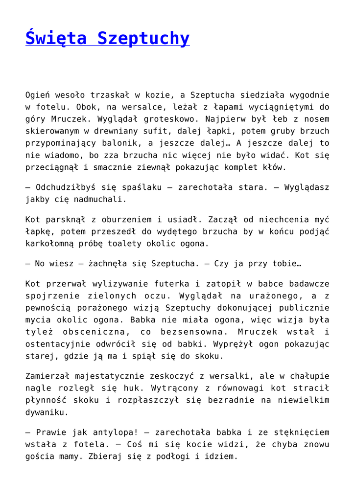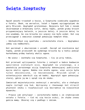 Święta Szeptuchy Ogień wesoło trzaskał w kozie, a Szeptucha siedziała wygodnie w fotelu. Obok, na wersalce, leżał z łapami wyciągniętymi do góry Mruczek. Wyglądał groteskowo. Najpierw był łeb z nosem skierowanym w drewniany sufit, dalej łapki, potem gruby brzuch przypominający balonik, a jeszcze dalej… A jeszcze dalej to nie wiadomo, bo zza brzucha nic więcej nie było widać. Kot się przeciągnął i smacznie ziewnął pokazując komplet kłów. – Odchudziłbyś się spaślaku – zarechotała stara. – Wyglądasz jakby cię nadmuchali. Kot parsknął z oburzeniem i usiadł. Zaczął od niechcenia myć łapkę, potem przeszedł do wydętego brzucha by w końcu podjąć karkołomną próbę toalety okolic ogona. – No wiesz – żachnęła się Szeptucha. – Czy ja przy tobie… Kot przerwał wylizywanie futerka i zatopił w babce badawcze spojrzenie zielonych oczu. Wyglądał na urażonego, a z pewnością porażonego wizją Szeptuchy dokonującej publicznie mycia okolic ogona. Babka nie miała ogona, więc wizja była tyleż obsceniczna, co bezsensowna. Mruczek wstał i ostentacyjnie odwrócił się od babki. Wyprężył ogon pokazując starej, gdzie ją ma i spiął się do skoku. Zamierzał majestatycznie zeskoczyć z wersalki, ale w chałupie nagle rozległ się huk. Wytrącony z równowagi kot stracił płynność skoku i rozpłaszczył się bezradnie na niewielkim dywaniku. – Prawie jak antylopa! – zarechotała babka i ze stęknięciem wstała z fotela. – Coś mi się kocie widzi, że chyba znowu gościa mamy. Zbieraj się z podłogi i idziem. Mruczek podniósł się niechętnie i podreptał za babką. Stan niechęci pogłębił się, gdy zobaczył aurę za drzwiami. Lało jak z cebra. Deszcz, kompletnie nieprzejęty faktem, że za tydzień zaczynały się święta, lał równo dzień i noc, z zapamiętaniem tworząc zwałowiska błota na podwórku. Dodatkowo zawodził wiatr. Pędził z zawrotną prędkością i ze złowieszczym świstem poganiał za sobą krople deszczu. Mruczek nigdy wcześniej nie widział deszczu, który pada poziomo. – Miau! – zaprotestował gorąco, widząc, że babka dziarsko zakłada gumofilce i płaszcz przeciwdeszczowy. – Chodź leniu! Mruczek wystawił ostrożnie łapki za próg i z obrzydzeniem się wycofał. Stara zrobiła dwa kroki. Błoto zassało kalosze z głośnym cmoknięciem. Szeptucha przez chwilę bezskutecznie siłowała się z żywiołem. – Diabli nadali! – mruknęła pod nosem i pstryknęła palcami. W jednej chwili błoto stężało a wielkie krople deszczu opadały na nie ciężko i zamiast wsiąkać w kolejne bajora, tworzyły wielkie bańki jak na asfalcie, a potem spływały w stronę lasu. – No! – sapnęła triumfalnie stara i żywo pomaszerowała w stronę stodoły. Kierunek wybrała nieprzypadkowo. Nawet przy tak ograniczonej widoczności, łuna nad drewnianym budynkiem była doskonale widoczna. – Pali się? – zapytała retorycznie, pamiętając doskonale czasy, gdy podczas każdej burzy parę chałup szło z dymem. – Niemożliwe – dodała po chwili. – Zima jest. Zimą piorunów nie ma. Musi być, łuna, z innego powodu nad stodołą się objawiła. – Miau! – potwierdził Mruczek stąpając niepewnie po stężałym przez zaklęcie błocie. – Jak nie sprawdzimy, to się nie dowiemy. Idziemy Mruczek! Drzwi stodoły były zamknięte. Nie dziwota. Babka osobiście zaryglowała wrota, żeby Lucynie było ciepło. Słoń dzielnie znosił polską niepogodę, ale minimum komfortu zdecydowanie mu się należało. Babka odryglowała drzwi tknięta nagłym impulsem troski o indyjską słonicę. Lelka z Rajatem wyjechali do Indii i opieka nad zwierzęciem spadła na Szeptuchę. – Lucyna! – szepnęła babka. – Lucyna, wszystko w porządku? Tajemnicza łuna najwyraźniej miała swoje źródło za belami siana pod przeciwległą ścianą stodoły. Nieźle oświetlała boks Lucyny, która widząc babkę zatrąbiła na powitanie. – Ciszej, gadzino! – syknęła babka, nerwowo spoglądając w stronę czerwonej poświaty. Mruczek oszacował sytuację i w kilku susach dopadł do Lucyny. Wdrapał się na słoniowy grzbiet i schował za ogromnym uchem. – Dekownik! – parsknęła babka. Szeptucha ostrożnie wspięła się na bele siana i powoli wychyliła głowę. Widok był zgoła tragiczny. W rogu stodoły leżała kupka potrzaskanego drewna a obok kilka szarych zwierzaków. Wyglądały jak łosie. – Diabli nadali! Kłusownik jakiś magazyn sobie u mnie założył? – zapytała retorycznie i po cichu. Odpowiedzi nie uzyskała i wcale się jej nie spodziewała. Tym większe było zdziwienie, gdy jedno ze zwierząt poruszyło się niemrawo, a czerwona łuna oświetliła Szeptuchę i na moment ją oślepiła. – Co tu się do cholery wyprawia? – Pomóż – odezwał się głos z czeluści siana. – A ktoś ty? – Joulupukki. – Jo… co? – zacukała się Szeptucha. – Mów mi po polsku, po prostu Mikołaj – dobiegł stłumiony głos. – Pomożesz mi w końcu? Utknąłem pod saniami. Trzeba renifery wyprzęgnąć najpierw. Stara zamrugała oczami i dokładniej przyjrzała się pobojowisku. Szare renifery zlewały się w masę poprzetykaną gdzieniegdzie rogami i kopytami. W czerwonym świetle wyglądało to nieco upiornie. Idąc tropem czerwonej łuny, Szeptucha napotkała wielki i świecący nos jednego z reniferów. – Rudolf – mruknęła do siebie i przykucnęła. Wyglądało na to, że wszystkie zwierzaki przeżyły, ale niektóre kopyta zwisały pod dziwnym kątem. Połamane, w najlepszym przypadku zwichnięte. – Poświeć no tym nosem tutaj, kochaneczku – poleciła stara. – Zobaczymy, jak was rozplątać. Rudolf posłuchał i nie bez trudu, bo przecież był unieruchomiony, wykręcił łeb w stronę połamanego dyszla. – Niedobrze – zacmokała Szeptucha. – Jakby tak zastosować… – Co tam tak szepczesz? zniecierpliwiony Mikołaj. – odezwał s