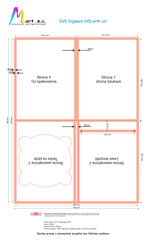 DVD Digipack (A5) with cut 137,5 mm 137,5 mm 5mm 3mm 3mm 374 mm 8mm 24 mm 124 mm Strona wewnêtrzna 3 Tacka na p³ytê 280 mm 286 mm spad margines Obszar spadu i marginesu wewnêtrznego. Elementy znajduj¹ce siê w obszarze spadu mog¹ zostaæ uciête lub przemieszczone w procesie wykrawania kszta³tu digipacka. W oznaczonych pogl¹dowo obszarach spadu i marginesu wydruk nie zmieni kolorystyki. Format pliku: tiff z kompresj¹ LZW Kolory: CMYK Rozdzielczoœæ: 450 dpi format projektu: 286 x 380 mm ze spadem (280 x 374 mm bez spadu) Bardzo proszê o przesy³anie projektu bez Pañstwa szablonu. 187 mm Strona wewnêtrzna 2 Lewe skrzyd³o 380 mm Strona 1 strona tytu³owa 187 mm Strona 4 Ty³ opakowania
