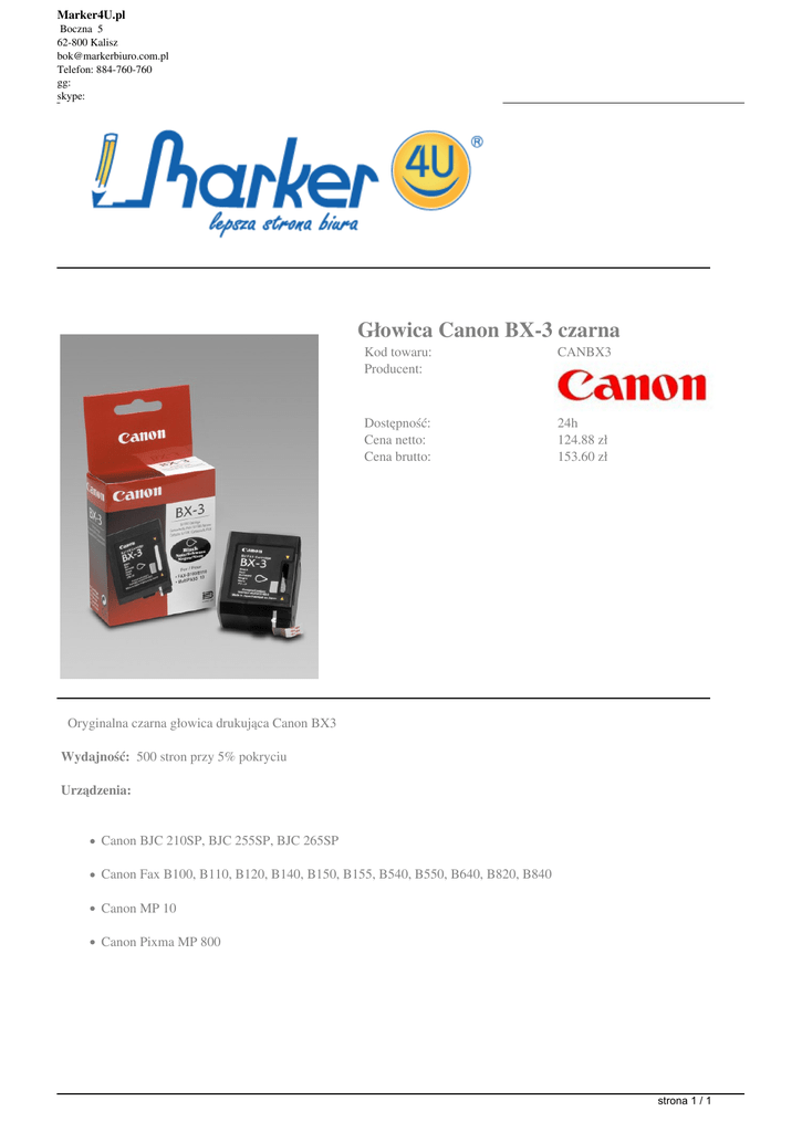 Marker4U.pl Boczna 5 62-800 Kalisz [email protected] Telefon: 884-760-760 gg: skype: Głowica Canon BX-3 czarna Kod towaru: Producent: CANBX3 Dostępność: Cena netto: Cena brutto: 24h 124.88 zł 153.60 zł Oryginalna czarna głowica drukująca Canon BX3 Wydajność: 500 stron przy 5% pokryciu Urządzenia: Canon BJC 210SP, BJC 255SP, BJC 265SP Canon Fax B100, B110, B120, B140, B150, B155, B540, B550, B640, B820, B840 Canon MP 10 Canon Pixma MP 800 strona 1 / 1 Powered by TCPDF (www.tcpdf.org)