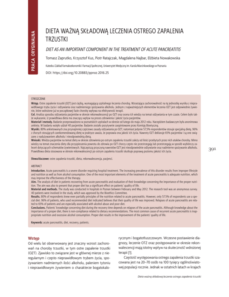 PRACA oryginalna Dieta ważną składową leczenia ostrego zapalenia trzustki Diet as an important component in the treatment of acute pancreatitis Tomasz Zaprutko, Krzysztof Kus, Piotr Ratajczak, Magdalena Najbar, Elżbieta Nowakowska Katedra i Zakład Farmakoekonomiki i Farmacji Społecznej, Uniwersytet Medyczny im. Karola Marcinkowskiego w Poznaniu DOI: https://doi.org/10.20883/ppnoz.2016.25 Streszczenie Wstęp. Ostre zapalenie trzustki (OZT) jest ciężką, wymagającą szpitalnego leczenia chorobą. Wzrastająca zachorowalność na tę jednostkę wynika z nieprawidłowego trybu życia i odżywiania oraz nadmiernego spożywania alkoholu. Jednym z najważniejszych elementów leczenia OZT jest odpowiednie żywienie, które wdrożone już w początkowej fazie choroby wpływa na efektywność terapii. Cel. Analiza sposobu odżywiania pacjentów w okresie rekonwalescencji po OZT oraz ocena ich wiedzy na temat odżywiania w tym czasie. Celem było także wykazanie, iż prawidłowa dieta ma znaczący wpływ na proces zdrowienia i jakość życia pacjentów. Materiał i metody. Badanie przeprowadzono w poznańskich szpitalach w okresie od lutego do maja 2012 roku. Narzędziem badawczym była anonimowa ankieta. W badaniu wzięło udział 40 pacjentów. Badanie zostało pozytywnie zaopiniowane przez Komisję Bioetyczną. Wyniki. 80% ankietowanych zna przynajmniej częściowo zasady odżywiania po OZT, natomiast jedynie 57,5% respondentów stosuje specjalną dietę. 96% z chorych stosujących zarekomendowaną dietę w praktyce uważa, że poprawia ona jakość ich życia. Nawroty OZT deklaruje 65% pacjentów i są one związane z nadużywaniem alkoholu i nieodpowiednią dietą. Wnioski. Wiedza pacjentów na temat diety w okresie zdrowienia po ostrym zapaleniu trzustki zależy od ilości przebytych przez nich ataków choroby. Mimo wiedzy na temat znaczenia diety dla przyspieszenia powrotu do zdrowia po OZT chorzy często nie przestrzegają lub przestrzegają w sposób wybiórczy zaleceń dotyczących schematów żywieniowych. Najczęstszą przyczyną nawrotów OZT jest nieodpowiednie odżywianie oraz nadmierne spożywanie alkoholu. Prawidłowa dieta stosowana w okresie rekonwalescencji po ostrym zapaleniu trzustki skutkuje poprawą poziomu jakości ich życia. Słowa kluczowe: ostre zapalenia trzustki, dieta, rekonwalescencja, pacjenci. Abstract Introduction. Acute pancreatitis is a severe disorder requiring hospital treatment. The increasing prevalence of this disorder results from improper lifestyle and nutrition as well as from alcohol consumption. One of the most important elements of the treatment of acute pancreatitis is adequate nutrition, which may improve the effectiveness of the therapy. Aim. The analysis of diet in patients recovering from acute pancreatitis and evaluation of their knowledge concerning the importance of the proper nutrition. The aim was also to present that proper diet has a significant effect on patients’ quality of life. Material and methods. The study was conducted in hospitals in Poznan between February and May 2012. The research tool was an anonymous survey. 40 patients were involved in the study, which was approved by the Bioethics Committee. Results. 80% of respondents knew even partially principles of the nutrition related to acute pancreatitis. However, only 57.5% of respondents use a special diet. 96% of patients, who used recommended diet indicated believes that their quality of life was improved. Relapses of acute pancreatitis are related to 65% of patients and are especially associated with alcohol abuse and poor diet. Conclusions. Patients’ knowledge concerning diet during the recovery time depends on relapses of the acute pancreatitis. Although knowledge about the importance of a proper diet, there is non-compliance related to dietary recommendations. The most common cause of recurrent acute pancreatitis is inappropriate nutrition and excessive alcohol consumption. Proper diet results in the improvement of the patients’ quality of life. Keywords: acute pancreatitis, diet, recovery, patients. Wstęp Od wielu lat obserwowany jest znaczny wzrost zachorowań na choroby trzustki, w tym ostre zapalenie trzustki (OZT). Zjawisko to związane jest w głównej mierze z nieregularnym i często nieprawidłowym trybem życia, spożywaniem nadmiernych ilości alkoholu, paleniem tytoniu i nieprawidłowym żywieniem o charakterze bogatokalo- rycznym i bogatotłuszczowym. Wczesne postawienie diagnozy, leczenie OTZ oraz postępowanie w okresie rekonwalescencji mają istotny wpływ na skuteczność wdrożonej terapii [1]. Częstość występowania ostrego zapalenia trzustki szacowana jest na 20–70 osób na 100 tysięcy ogólnoświatowej populacji rocznie. Jednak w ostatnich latach w krajach Dieta ważną składową leczenia ostrego zapalenia trzustki 391 392 rozwijających się obserwowany jest znaczący wzrost częstości zachorowań na OZT, wynikający przede wszystkim z nieprawidłowego stylu życia [1, 2]. Mimo że choroba ta wiąże się z koniecznością leczenia szpitalnego, to przyczyny hospitalizacji z powodu OZT są odmienne w poszczególnych regionach świata. Wynika to z demograficznych różnic w występowaniu czynników etiologicznych OZT. Przykładowo w USA ponad 80% zachorowań na ostre zapalenie trzustki wywołane jest nadużywaniem alkoholu etylowego lub kamicą pęcherzyka żółciowego. Ponadto statystyki wskazują, że nadmierne spożycie etanolu jest najczęstszą przyczyną ostrego zapalenia trzustki na obszarach miejskich, natomiast na terenach podmiejskich i wiejskich występowanie OZT związane jest z kamicą żółciową. Z kolei w krajach Azji u 10–20% chorych ostre zapalenie trzustki wywołane jest zakażeniem glistą ludzką [3]. Śmiertelność w ostrym zapaleniu trzustki waha się od 3% w przypadku łagodnego przebiegu choroby do ponad 50% u chorych z ciężkim, martwiczym OZT powikłanym posocznicą. Połowa zgonów pacjentów ch