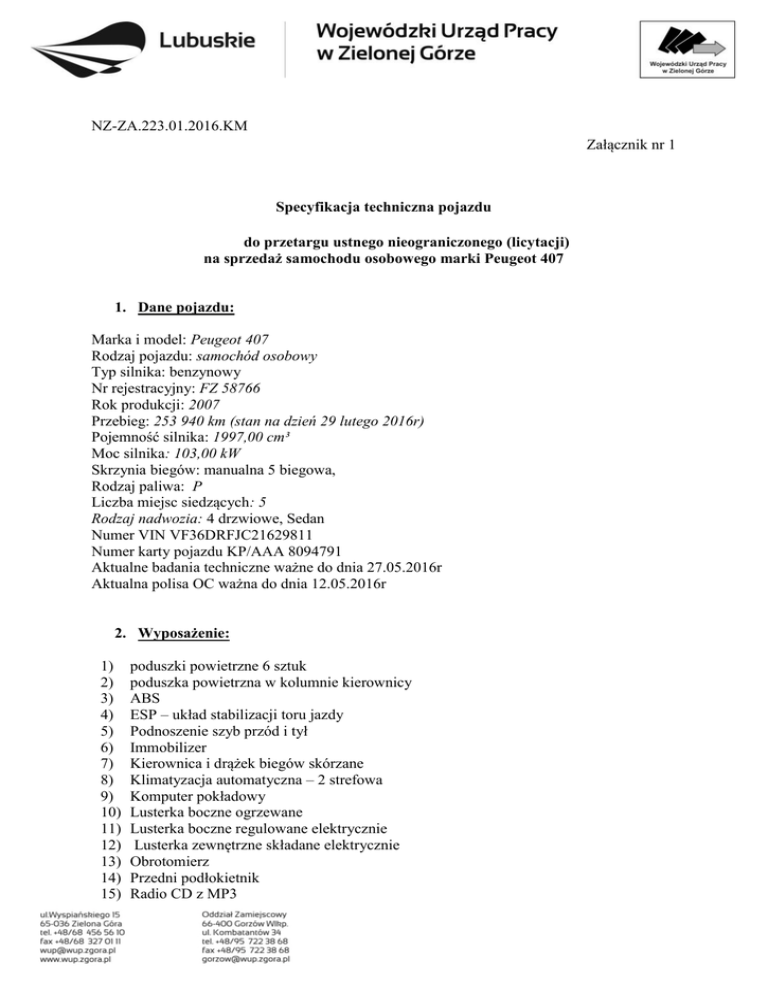 NZ-ZA.223.01.2016.KM Załącznik nr 1 Specyfikacja techniczna pojazdu do przetargu ustnego nieograniczonego (licytacji) na sprzedaż samochodu osobowego marki Peugeot 407 1. Dane pojazdu: Marka i model: Peugeot 407 Rodzaj pojazdu: samochód osobowy Typ silnika: benzynowy Nr rejestracyjny: FZ 58766 Rok produkcji: 2007 Przebieg: 253 940 km (stan na dzień 29 lutego 2016r) Pojemność silnika: 1997,00 cm³ Moc silnika: 103,00 kW Skrzynia biegów: manualna 5 biegowa, Rodzaj paliwa: P Liczba miejsc siedzących: 5 Rodzaj nadwozia: 4 drzwiowe, Sedan Numer VIN VF36DRFJC21629811 Numer karty pojazdu KP/AAA 8094791 Aktualne badania techniczne ważne do dnia 27.05.2016r Aktualna polisa OC ważna do dnia 12.05.2016r 2. Wyposażenie: 1) 2) 3) 4) 5) 6) 7) 8) 9) 10) 11) 12) 13) 14) 15) poduszki powietrzne 6 sztuk poduszka powietrzna w kolumnie kierownicy ABS ESP – układ stabilizacji toru jazdy Podnoszenie szyb przód i tył Immobilizer Kierownica i drążek biegów skórzane Klimatyzacja automatyczna – 2 strefowa Komputer pokładowy Lusterka boczne ogrzewane Lusterka boczne regulowane elektrycznie Lusterka zewnętrzne składane elektrycznie Obrotomierz Przedni podłokietnik Radio CD z MP3 16) 17) 18) 19) 20) 21) 22) 23) 24) 25) 26) 27) Siedzenie kierowcy z mechaniczną regulacją wysokości System wspomagania hamowania awaryjnego Szyba przednia odblaskowa Szyby barwione Tapicerka jasna welurowa Tylny podłokietnik ze schowkiem Wspomaganie układu kierowniczego Zamek centralny Światła przeciwmgielne Alarm Czujnik odległości parkowania – tył Lakier czarny metalik 3. Stan pojazdu Samochód jest sprawny, jednak konieczne jest wykonanie następujących napraw: - przełącznik zespolony - mocowanie dolne zawieszenia - nawiewy - wahacze tył - osłona termiczna - szyba czołowa Samochód jest bezwypadkowy, garażowany, regularnie konserwowany, objęty stałą umową na mycie i kosmetykę pojazdów.