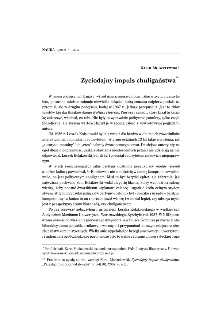 NAUKA 3/2009 • 23-25 KAROL MODZELEWSKI * Życiodajny impuls chuligaństwa** W moim podręcznym bagażu, wśród najważniejszych prac, jakie w życiu przeczytałem, poczesne miejsce zajmuje niewielka książka, którą cenzura najpierw posłała na przemiał, ale w drugim podejściu, bodaj w 1967 r., jednak przepuściła. Jest to zbiór tekstów Leszka Kołakowskiego Kultura i fetysze. Pierwszy cenzor, który kazał tę książkę zniszczyć, wiedział, co robi. Nie były to wprawdzie polityczne pamflety, tylko eseje filozoficzne, ale system wartości łączył je w spójną całość z wywrotowymi poglądami autora. Od 1956 r. Leszek Kołakowski był dla mnie i dla bardzo wielu moich rówieśników intelektualnym i moralnym autorytetem. W ciągu ostatnich 13 lat takie wyrażenia, jak „autorytet moralny” lub „etos” nabrały dwuznacznego sensu. Dzisiejsze autorytety na ogół dbają o poprawność, unikają stawiania niestosownych pytań i nie udzielają na nie odpowiedzi. Leszek Kołakowski jednak był i pozostał autorytetem całkowicie niepoprawnym. W latach sześćdziesiątych jakiś partyjny dostojnik poszukujący modus vivendi z ludźmi kultury powiedział, że Kołakowski nie zmieści się w żadnej kompromisowej formule, bo jest politycznym chuliganem. Miał to być brzydki epitet, ale zabrzmiał jak najwyższa pochwała, Sam Kołakowski wolał alegorię błazna, który wchodzi na salony wiedzy, żeby popsuć dworskiemu kapłanowi celebrę i ugodzić króla celnym szyderstwem. W tym przypadku jednak ów partyjny dostojnik był – niejako z urzędu – bardziej kompetentny; w końcu to on reprezentował władzę i wiedział lepiej, czy odwaga myśli jest z perspektywy tronu błazenadą, czy chuligaństwem, Po raz pierwszy zobaczyłem i usłyszałem Leszka Kołakowskiego w wielkiej sali Audytorium Maximum Uniwersytetu Warszawskiego. Był chyba rok 1957, W NRD posadzono właśnie do więzienia pierwszego dysydenta, a w Polsce Gomułka przywracał stabilność systemu po październikowym wstrząsie i przypominał o naszym miejscu w obozie państw komunistycznych. Wielką aulę wypełniali po brzegi pracownicy uniwersytetu i studenci, na ogół członkowie partii; może było to walne zebranie uniwersyteckiej orga* Prof. dr hab. Karol Modzelewski, członek korespondent PAN, Instytut Historyczny, Uniwersytet Warszawski; e-mail: [email protected] ** Przedruk za zgodą autora, według: Karol Modzelewski, Życiodajny impuls chuligaństwa, „Przegląd Filozoficzno-Literacki” nr 3-4(18), 2007, s. 9-11. 24 Karol Modzelewski nizacji partyjnej. Kołakowski mówił, że nie wolno ulec dwubiegunowej logice szantażu, jakbyśmy musieli wybierać: „albo zachodnioniemieccy rewanżyści, albo haniebny reżym Ulbrichta”. Nikt, absolutnie nikt tak wtedy nie mówił o sojuszniku z Układu Warszawskiego. Na sali było bardzo cicho i słowa o haniebnym reżymie Ulbrichta klasnęły jak uderzenie w twarz. To nie była błazenada. To była nieprzyzwoita odwaga nazwania po imieniu głęboko skrywanych intuicji moralnych, czyli akt chuligaństwa. Oczywistym aktem chuligaństwa był też słynny pamflet Czym jest socjalizm? Każde zdanie tego tekstu oskarżało reżym i każde zaczynało się od stwierdzenia, że nie jest on socjalizmem. Była to kwintesencja radykalnego rewizjonizmu: oskarżenie i potępienie komunistycznego ustroju za to, że depcze w praktyce ideały, które w teorii sam głosi. Polscy rewizjoniści uważali Kołakowskiego za swojego duchowego przewodnika, a esej Czym jest socjalizm? za swój manifest ideowy. Ale ironiczna puenta tego tekstu nie mieściła się już w rewizjonistycznej formule i wskazywała, że autor jest gotów przejść od herezji do całkowitego przestępstwa. Po wyliczeniu nieprawości ustroju Kołakowski spełniał tytułową obietnicę: odpowiadał czym jest socjalizm. Odpowiedź mieściła się w pięciu słowach: „socjalizm to naprawdę dobra rzecz”. Rzecz nadawała się do kabaretu i rzeczywiście recytowano ją z upodobaniem w Piwnicy pod Baranami. Człowiek strzela, Pan Bóg kule nosi. Leszek Kołakowski nie mógł wiedzieć, dokąd zawędrują ludzie, którzy czerpali inspirację z jego tekstów. Poczuwał się jednak do odpowiedzialności za nich i za nieprzewidziane skutki własnych słów. Tak było również z Jackiem Kuroniem i ze mną. Chyba w grudniu 1964 r., parę miesięcy przed ogłoszeniem Listu Otwartego, ale już po zdemaskowaniu nas przez bezpiekę i usunięciu z partii, umówiliśmy się na zasadniczą rozmowę z naszym największym autorytetem. Kołakowski w znacznej mierze podzielał naszą krytykę ustroju, ale nie podzielał naszej utopii i powiedział nam to bardzo jasno. Odniosłem jednak wrażenie, że spodobała mu się nasza bezczelność. Pod tym względem byliśmy zresztą jego naśladowcami. Kiedy naturalną koleją rzeczy znaleźliśmy się na ławie oskarżonych, wystąpił w naszej obronie. Na procesie, który toczył się w lipcu 1965 r. przy drzwiach zamkniętych, Leszek Kołakowski i Marian Brandys byli na sali jako nasi mężowie zaufania. W akcie oskarżenia krytykę ustroju potraktowano jako rozpowszechnianie fałszywych wiadomości. Leszek Kołakowski napisał w związku z tym i skierował do sądu opinię semantyczną dotyczącą różnic pojęciowych między wiadomościami a ocenami oraz interpretacjami. Opinię tę, podpisaną również przez Marię Ossowską i Tadeusza Kotarbińskiego, warto byłoby wydobyć z sądowych archiwów. Jest to piękny tekst, w którym obrona wolności słowa i czystości prawa splata się z epistemologiczną refleksją. Poglądy filozoficzne zawarte w tym sądowy dokumencie można bez trudu znaleźć w innych pismach Kołakowskiego. Myślę jednak, że nigdzie indziej nie znajdziemy tak przekonującego spotkania filozofii z życiem. Życiodajny impuls chuligaństwa 25 Usunięty w 1968 r. z Uniwersytetu Warszawskiego, Leszek Kołakowski wykładał i pisał w Oksfordzie. N