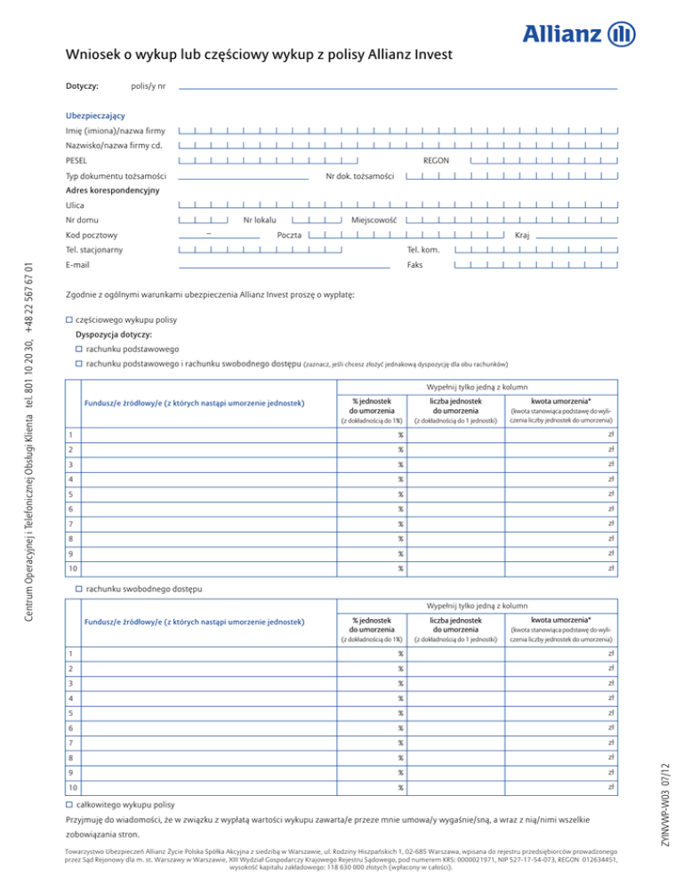 Wniosek o wykup lub częściowy wykup z polisy Allianz Invest