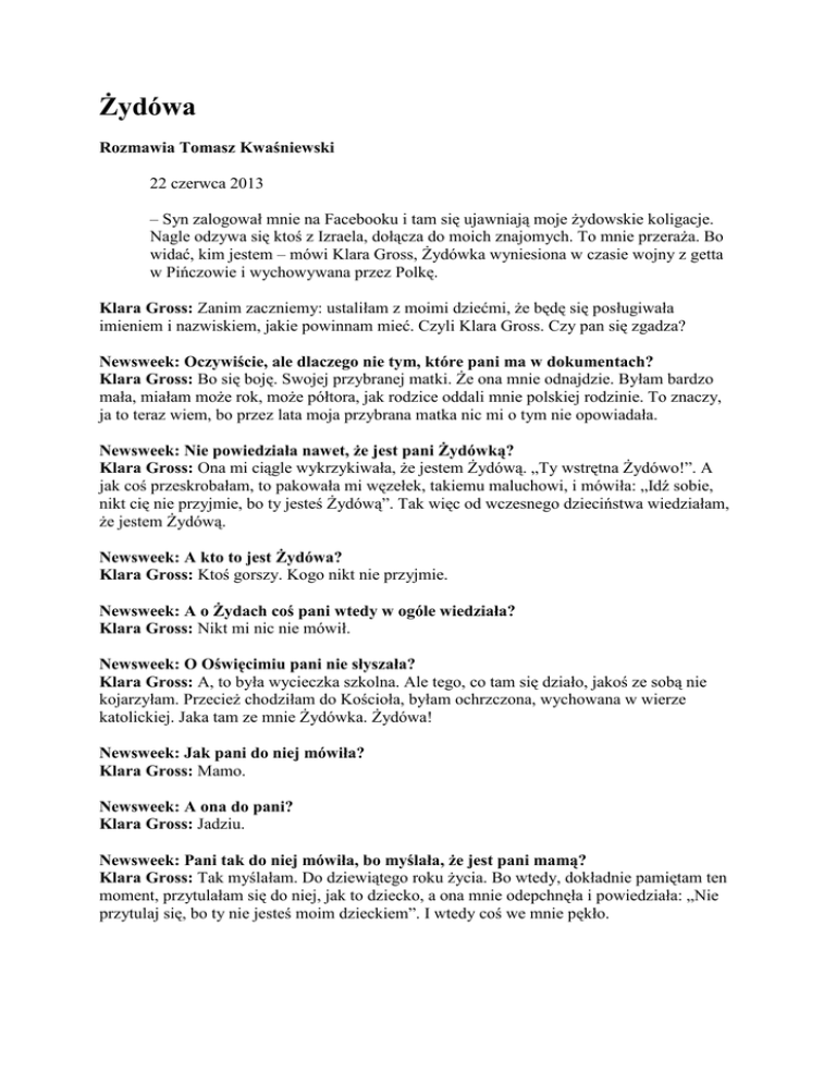 Żydówa Rozmawia Tomasz Kwaśniewski 22 czerwca 2013 – Syn zalogował mnie na Facebooku i tam się ujawniają moje żydowskie koligacje. Nagle odzywa się ktoś z Izraela, dołącza do moich znajomych. To mnie przeraża. Bo widać, kim jestem – mówi Klara Gross, Żydówka wyniesiona w czasie wojny z getta w Pińczowie i wychowywana przez Polkę. Klara Gross: Zanim zaczniemy: ustaliłam z moimi dziećmi, że będę się posługiwała imieniem i nazwiskiem, jakie powinnam mieć. Czyli Klara Gross. Czy pan się zgadza? Newsweek: Oczywiście, ale dlaczego nie tym, które pani ma w dokumentach? Klara Gross: Bo się boję. Swojej przybranej matki. Że ona mnie odnajdzie. Byłam bardzo mała, miałam może rok, może półtora, jak rodzice oddali mnie polskiej rodzinie. To znaczy, ja to teraz wiem, bo przez lata moja przybrana matka nic mi o tym nie opowiadała. Newsweek: Nie powiedziała nawet, że jest pani Żydówką? Klara Gross: Ona mi ciągle wykrzykiwała, że jestem Żydówą. „Ty wstrętna Żydówo!”. A jak coś przeskrobałam, to pakowała mi węzełek, takiemu maluchowi, i mówiła: „Idź sobie, nikt cię nie przyjmie, bo ty jesteś Żydówą”. Tak więc od wczesnego dzieciństwa wiedziałam, że jestem Żydówą. Newsweek: A kto to jest Żydówa? Klara Gross: Ktoś gorszy. Kogo nikt nie przyjmie. Newsweek: A o Żydach coś pani wtedy w ogóle wiedziała? Klara Gross: Nikt mi nic nie mówił. Newsweek: O Oświęcimiu pani nie słyszała? Klara Gross: A, to była wycieczka szkolna. Ale tego, co tam się działo, jakoś ze sobą nie kojarzyłam. Przecież chodziłam do Kościoła, byłam ochrzczona, wychowana w wierze katolickiej. Jaka tam ze mnie Żydówka. Żydówa! Newsweek: Jak pani do niej mówiła? Klara Gross: Mamo. Newsweek: A ona do pani? Klara Gross: Jadziu. Newsweek: Pani tak do niej mówiła, bo myślała, że jest pani mamą? Klara Gross: Tak myślałam. Do dziewiątego roku życia. Bo wtedy, dokładnie pamiętam ten moment, przytulałam się do niej, jak to dziecko, a ona mnie odepchnęła i powiedziała: „Nie przytulaj się, bo ty nie jesteś moim dzieckiem”. I wtedy coś we mnie pękło. Newsweek: Ale rozumiem, że potrafiła przytulić? Być ciepła? Czasem? Klara Gross: Nie wiem... Nie potrafię sobie przypomnieć. Mam tylko strzępy. Takie straszne. Newsweek: Niektórzy mówią, że dobrze jest zamienić żal, złość i strach na wdzięczność. Klara Gross: Często to słyszę: powinnaś być wdzięczna. No, ale ja nie jestem. No bo przecież byłam maleńkim dzieckiem. Ile ja miałam? Rok? Półtora? Naprawdę nie jestem wdzięczna. I może to nie w porządku, ale niestety. Bo to, co ona mi zgotowała... Newsweek: A był tam jakiś mężczyzna? Klara Gross: Podobno to było tak, że znalazł mnie jej mąż. Na drodze z Pińczowa do Bogucic. Bo mnie wyniesiono z getta w Pińczowie. Taka była wersja, którą mi opowiadała. A potem ten mąż uciekł, bo był w partyzantce. Wylądował w Anglii, tam się ożenił i już nie wrócił. A ja zostałam z nią. Póki trwała wojna, mieszkałyśmy w Bogucicach z rodziną jej męża, a kiedy wojna się skończyła, pojechałyśmy na Ziemie Odzyskane. Do Trzebnicy. Wtedy po raz pierwszy zmieniła mi nazwisko. A potem robiła to jeszcze kilka razy. Newsweek: Teraz, gdy pani już zna swoje prawdziwe nazwisko, czy zamierza je pani zmienić? Klara Gross: Nie myślałam o tym. Zaraz po przyjeździe do Trzebnicy otworzyła sklepik. I od razu kogoś poznała. Pamiętam go dobrze, bo on się mną zajmował. Dbał o mój rozwój. A ja się zapowiadałam na bardzo zdolne dziecko. Rozstali się, związała się z alkoholikiem. A potem zlikwidowała sklep i się wyprowadziła. W ogóle ciągle przeprowadzała się z miasta do miasta. Niby uciekając przed tym alkoholikiem, ale ostatnio sobie uświadomiłam, że to było związane ze mną. Żeby rodzina mnie nie znalazła. Bo teraz już wiem, że mnie szukali. Newsweek: A dlaczego ona mogła chcieć tak robić? Klara Gross: Pamiętam, byłam wtedy dość mała, stół wydawał mi się taki wielki, a na tym stole leżało pudełeczko. Czarne. A w nim świecące, nie wiem, może brylanty, diamenty... Nie znam się na tym, ale za co ona otworzyła ten sklep w Trzebnicy? Za co w Szczecińskiem kupiła gospodarstwo? Jak już po latach odnalazłam kuzynkę w Izraelu, ona mi powiedziała, że jej rodzice przesłali mojej babci do Pińczowa jakieś kosztowności. Newsweek: Szkoła? Klara Gross: Siedem klas w Trzebnicy. A potem wyjechaliśmy w Szczecińskie i do szkoły już nie chodziłam. Tylko pracowałam. Bardzo ciężko. A i tak wysłuchiwałam, że jestem darmozjadem. No i ona się tam rozpiła, już tak na dobre. Potrafiła mnie po nocach budzić, robić awantury. To, że od czasu do czasu dostałam lanie, to nie było nawet w połowie tak straszne jak to nieustające wysłuchiwanie obelg. To zaważyło na całym moim życiu. To dlatego mam o sobie tak niskie mniemanie. Ciągle mam w sobie lęk przed tą kobietą. Ona już pewnie nie żyje, ale ja wciąż się boję. Że mnie odnajdzie. I będzie chciała ze mną mieszkać. Newsweek: Odwdzięcz się! Klara Gross: Dokładnie. Ona mi się do tej pory śni. Jestem w tym śnie przerażona. Bo ona mnie znalazła i co ja teraz zrobię? Newsweek: No właśnie, co? Klara Gross: Nie mam pojęcia. Tak więc ciężko pracowałam, ona robiła mi awantury i wtedy znowu przyjechał jej kochaś. No to razem pili. A on jak zaczynał pić, to w taki ciąg wpadał, że dostawał białej gorączki. Newsweek: Bił? Klara Gross: Mnie nie, ale ją owszem. Newsweek: Nieszczęśliwa. Klara Gross: Chyba tak, ale nie potrafię tak o niej myśleć. Miałam piętnaście, może szesnaście lat, kiedy znowu się rozstali, on wrócił do Warszawy, uciekłam do niego. W baraku takim mieszkał, na budowie. A ja z nim. No, ale jak dostał kolejnego ciągu, to przyjechał jego brat, bo jego rodzina mieszkała na Powązkach, i mnie tam zabrał. Newsweek: J