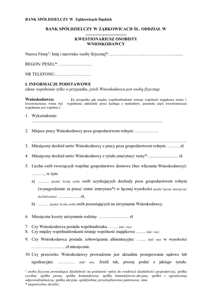 BANK SPÓŁDZIELCZY W Ząbkowicach Śląskich BANK SPÓŁDZIELCZY W ZĄBKOWICACH ŚL. ODDZIAŁ W ..................................... KWESTIONARIUSZ OSOBISTY WNIOSKODAWCY Nazwa Firmy1/ Imię i nazwisko osoby fizycznej*: .…………………...…………………........ REGON/ PESEL*: ………………….. NR TELEFONU:……………………. I. INFORMACJE PODSTAWOWE (dane wypełniane tylko w przypadku, jeżeli Wnioskodawca jest osobą fizyczną) Wnioskodawca: kwestionariusza winna być wypełniana jest wspólnie.) (w przypadku gdy między współmałżonkami istnieje wspólność majątkowa strona 1 wypełniona oddzielnie przez każdego z małżonków, pozostała część kwestionariusza 1. Wykształcenie: ...................................................................................................................... 2. Miejsce pracy Wnioskodawcy poza gospodarstwem rolnym: ….…………. ………………………………………………………………………………………………. 3. Miesięczny dochód netto Wnioskodawcy z pracy poza gospodarstwem rolnym: .….…. zł. 4. Miesięczny dochód netto Wnioskodawcy z tytułu emerytury/ renty*: .......................... zł. 5. Liczba osób tworzących wspólne gospodarstwo domowe (bez wliczania Wnioskodawcy): ………, w tym: a) …….. (podać liczbę osób) osób uzyskujących dochody poza gospodarstwem rolnym (wynagrodzenie za pracę/ renta/ emerytura*) w łącznej wysokości (podać łączny miesięczny dochód netto): …………… zł, b) …….. (podać liczbę osób) osób pozostających na utrzymaniu Wnioskodawcy. 6. Miesięczne koszty utrzymania rodziny: ………………… zł 7. Czy Wnioskodawca posiada współmałżonka ……. (tak / nie) 8. Czy między współmałżonkami istnieje wspólność majątkowa ……. (tak / nie) 9. Czy Wnioskodawca posiada zobowiązania alimentacyjne: …… (tak/ nie) w wysokości ……………………zł miesięcznie. 10. Czy przeciwko Wnioskodawcy prowadzone jest aktualnie postępowanie sądowe lub egzekucyjne: 1 ………… (tak/ nie). Jeżeli tak, proszę podać z jakiego tytułu: osoba fizyczna prowadząca działalność na podstawie wpisu do ewidencji działalności gospodarczej, spółka cywilna, spółka jawna, spółka komandytowa, spółka komandytowo-akcyjna, spółka z ograniczoną odpowiedzialnością, spółka akcyjna, spółdzielnia, przedsiębiorstwo państwowe, inne. * niepotrzebne skreślić; ...…………………………………………………………………………………………….. II. CHARAKTERYSTYKA GOSPODARSTWA ROLNEGO Liczba osób zatrudnionych w gospodarstwie rolnym: ………, w tym sezonowo: ……….. Stan majątkowy: 1. Użytkowane grunty (w ha): Klasa ziemi Grunty orne Własne Użytki zielone Sady i plantacje Grunty orne Dzierżawione Użytki Sady zielone i plantacje I II IIIa IIIb IVa IVb V VI Razem: 2. Nieruchomości stanowiące własność Wnioskodawcy niewchodzące w skład gospodarstwa rolnego): Rodzaj nieruchomości (działka gruntu – powierzchnia, działka zabudowana – opis jakie budynki znajdują się na działce i ich powierzchnia użytkowa; numer księgi wieczystej prowadzonej dla nieruchomości; nazwa sądu prowadzącego KW) Szacunkowa wartość nieruchomości (w zł; informacja, na jakiej podstawie określono wartość nieruchomości – wycena, faktura, polisa, itp.) 2 (również nieruchomości Czy nieruchomość jest obciążona? Czy nieruchomość jest ubezpieczona? (nie / tak; na czyją rzecz jest obciążona? wysokość obciążenia w zł) (tak/ nie; na jaką sumę jest ubezpieczona? do kiedy ważne jest ubezpieczenie?) 3. Maszyny, urządzenia i środki transportu stanowiące własność Wnioskodawcy, również ruchomości nie wchodzące w skład gospodarstwa rolnego (np. prywatny samochód) oraz użytkowane przez Wnioskodawcę (np. na podstawie umowy leasingu, dzierżawy, itp.): Rodzaj ruchomości (nazwa ruchomości; rok produkcji; czy ruchomość stanowi własność Wnioskodawcy y? tak/ nie) Szacunkowa wartość ruchomości Czy ruchomość jest obciążona? (w zł; informacja, na jakiej podstawie określono wartość ruchomości – wycena, faktura, polisa, itp.) (nie/ tak; na czyją rzecz jest obciążona) Czy nieruchomość jest ubezpieczona? (tak/ nie; na jaką sumę jest ubezpieczona? do kiedy ważne jest ubezpieczenie?) 4. Posiadany inwentarz żywy: Nazwa Ilość sztuk ogółem 1 2 Ilość sztuk przeznaczona Szacunkowa do zbycia lub wartość jednej zużycia w ciągu sztuki najbliższego inwentarza w zł roku (stado podstawowe) 3 Bydło ogółem, w tym: a) cielęta (do 1 roku) b) byczki (1-2 lata) 3 4 Szacunkowa wartość stada w zł (2 × 4) 5 c) jałówki (1-2 lata) d) byki (pow. 2 lat) e) jałówki (pow. 2 lat) f) krowy mleczne g) ………………………... Trzoda chlewna ogółem, w tym: a) prosięta (do 20 kg) b) lochy hodowlane c) pozostała trzoda chlewna Drób ogółem, w tym: a) brojlery kurze b) kury nioski c) pozostały drób Inne, w tym: a) owce b) kozy d) konie e) króliki d) pnie pszczele e) ………………………… 5. Pozostały posiadany majątek rzeczowy: Nazwa składnika majątku Ilość w t Szacunkowa wartość 1 tony 1 2 3 I. Zmagazynowane ziarno zboża a) pszenica b) żyto c) jęczmień d) owies 4 Szacunkowa wartość ogółem (2×3) 4 e) kukurydza f) …………………... g) ………………….. II. Środki do produkcji rolnej a) nawozy b) środki ochrony roślin c) pasze III. Produkcja roślinna w toku: Nazwa składnika majątku Areał w hektarach Szacunkowa wydajność w tonach z hektara 1 2 3 Rośliny zbożowe: a) pszenica b) żyto c) jęczmień d) owies e) kukurydza f) ……………... g) …………….. Rośliny okopowe a) ziemniaki b) buraki cukrowe c) warzywa w uprawie polowej d) uprawy pod osłonami e) ……………... f) ……………... Rośliny oleiste a) rzepak i rzepik 5 Szacunkowa wartość 1 tony Szacunkowa wartość