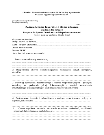 UWAGA! Zaświadczenie waŜne przez 30 dni od daty wystawienia. W całości wypełnia czytelnie lekarz!!! pieczątka zakładu opieki zdrowotnej lub praktyki lekarskiej ..................................data........................... Zaświadczenie lekarskie o stanie zdrowia wydane dla potrzeb Zespołu do Spraw Orzekania o Niepełnosprawności (osoby, która nie ukończyła 16 roku Ŝycia) pierwszorazowe/powtórne* Imię i nazwisko dziecka…….................................................................................. Data i miejsce urodzenia......................................................................................... Adres zamieszkania................................................................................................. Numer PESEL......................................................................................................... Seria i nr dokumentu toŜsamości............................................................................ 1. Rozpoznanie choroby zasadniczej....................................................................... ................................................................................................................................. ................................................................................................................................. ................................................................................................................................. 2. Rozpoznanie chorób współistniejących, uszkodzeń innych narządów, układów:………………………………………………………………………… …………………………………………………………………………………… …………………………………………………………………………………… …………………………………………………………………………………… 3. Przebieg schorzenia podstawowego i chorób współistniejących: początek (ustalony na podstawie jakiej dokumentacji) - stopień uszkodzenia strukturalnego i funkcjonalnego; stadium zaawansowania choroby: ................................................................................................................................. ................................................................................................................................. ................................................................................................................................. 4. Zastosowane leczenie i rehabilitacja - rodzaje, czas trwania, pobyty w szpitalu, sanatorium:……………………………………………………………. …………………………………………………………………………………… ………………………………………………………………………………….... 5. Ocena wyników leczenia, rokowania (trwałość uszkodzeń, moŜliwość poprawy),dalsze leczenie i rehabilitacja:………………………………………. …………………………………………………………………………………… …………………………………………………………………………………… …………………………………………………………………………………… 6. Przewidywany okres trwania naruszonej sprawności fizycznej lub psychicznej powyŜej 12 miesięcy: TAK/ NIE* 7. Wykaz wykonanych badań dodatkowych, potwierdzających rozpoznanie……... ……………………………………………………………………………………… ……………………………………………………………………………. 8. Wykaz istotnych konsultacji specjalistycznych, załączonych do zaświadczenia: ....................................................................................................................................... ....................................................................................................................... 9. Zakres i rodzaj ograniczeń spowodowany naruszoną sprawnością organizmu: ……………………………………………………………………………………… ……………………………………………………………………………………… ………………………………………………………………………………. 10. UŜywane zaopatrzenie ortopedyczne i sprzęt rehabilitacyjny; ewentualne potrzeby w tym zakresie: ………………………………………………………….. ……………………………………………………………………………………… …………………………………………………………………………………... 11. Czy dziecko adekwatnie do wieku wymaga na co dzień opiekuna w zakresie samoobsługi oraz w procesie leczenia, rehabilitacji i edukacji (jeśli wymaga podać rodzaj i zakres):……………………………………………………………………… ……………………………………………………………………………………… ………………………………………………………………………………………... 12. Od kiedy dziecko pozostaje pod opieką lekarza wystawiającego zaświadczenie ………………………….. …..……………………… 13. Od kiedy dziecko posiada dokumentacje medyczną 14. Czy lekarz wystawiający zaświadczenie ma pełny wgląd do dokumentacji medycznej pacjenta TAK/NIE* 15. Czy u dziecka nastąpiło/nie nastąpiło* pogorszenie/polepszenie* stanu zdrowia w okresie od wydania poprzedniego zaświadczenia lekarskiego. 16. Dziecko jest zdolne/niezdolne1* przybyć na badanie w celu udziału w posiedzeniu składu orzekającego. ....................................................................... Pieczątka imienna i podpis lekarza wystawiającego zaświadczenie Uwaga: Brak piecz