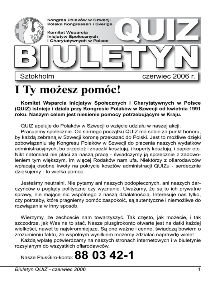 BIULETYN Sztokholm czerwiec 2006 r. I Ty możesz pomóc! Komitet Wsparcia Inicjatyw Społecznych i Charytatywnych w Polsce (QUIZ) istnieje i działa przy Kongresie Polaków w Szwecji od kwietnia 1991 roku. Naszym celem jest niesienie pomocy potrzebującym w Kraju. QUIZ apeluje do Polaków w Szwecji o wzięcie udziału w naszej akcji. Pracujemy społecznie. Od samego początku QUIZ ma sobie za punkt honoru, by każdą zebraną w Szwecji koronę przekazać do Polski. Jest to możliwe dzięki zobowiązaniu się Kongresu Polaków w Szwecji do płacenia naszych wydatków administracyjnych, bo przecież i znaczki kosztują, i koperty kosztują, i papier etc. Nikt natomiast nie płaci za naszą pracę - świadczymy ją społecznie z zadowoleniem tym większym, im więcej Rodaków nam ufa. Niektórzy z ofiarodawców wpłacają osobne kwoty na pokrycie kosztów administracji QUIZu - serdecznie dziękujemy - to wielka pomoc. Jesteśmy neutralni. Nie pytamy ani naszych podopiecznych, ani naszych darczyńców o poglądy polityczne czy wyznanie. Uważamy, że są to ich prywatne sprawy, nie mające nic wspólnego z naszą działalnością. Interesuje nas tylko, czy potrzeby, które pragniemy pomóc zaspokoić, są autentyczne i niemożliwe do rozwiązania w inny sposób. Wierzymy, że zechcecie nam towarzyszyć. Tak często, jak możecie, i tak szczodrze, jak Was na to stać. Nasze plusgirokonto otwarte jest na datki każdej wielkości, nawet te najskromniejsze. Są one ważne i cenne, świadczą bowiem o zrozumieniu faktu, że wspólnym wysiłkiem możemy zdziałac naprawdę wiele! Każdą wpłatę potwierdzamy na naszych stronach internetowych i w biuletynie rozsylanym do wszystkich ofiarodawców. Nasze PlusGiro-konto: 88 03 42-1 Biuletyn QUIZ - czerwiec 2006 Zbiórki prowadzone obecnie: Zbiórka nr 13 Stowarzyszenie Rodzin Katolickich Archidiecezji Przemyskiej oddział w Jarosławiu Zbiórka nr 14 Stowarzyszenie Pomocy Dzieciom „Misja Nadziei” w Dąbrowie Górniczej Zbiórka nr 15 Rodzinny Dom Dziecka pani Haliny Szyffer, wieś Bargły koło Częstochowy (dawniej Rzeniszów) Fundusz interwencyjny - z niego udzielana jest pomoc w nagłych i niespodziewanych przypadkach. SALDO stan na dzień 2006-06-14 Zbiórki Zbiórki zakończone Fundusz Interwencyjny Zbiórka nr 13 Stowarzyszenie Rodzin Katolickich Archidiecezji Przemyskiej oddział w Jarosławiu Zbiórka nr 14 Stowarzyszenie Pomocy Dzieciom „Misja Nadziei” w Dąbrowie Górniczej Zbiórka nr 15 Rodzinny Dom Dziecka Haliny Szyffer - wieś Bargły koło Częstochowy (dawniej Rzeniszów) Fundusz im.Barbary Winiarskiej Fundusz administracyjny Razem (stan konta PlusGiro) SEK Razem (wypłacono dotychczas) SEK SUMA zebranych środków - SEK WPŁAĆ NA stan konta 0:00 14.934:95 wypłacono 716.719:00 608.016:61 3.478:50 152.602:00 1.211:50 132.055:00 1.160:00 3.886:08 3.500:59 28.171:62 110.000:00 0:00 11.665:00 1.731.057:61 1.759.229:23 QUIZ Fundusz Wsparcia Inicjatyw Społecznych i Charytatywnych PlusGiro: 88 03 42-1 Biuletyn QUIZ - czerwiec 2006 Wypłaty z konta QUIZ: Stowarzyszenie Rodzin Katolickich - Jarosław Stowarzyszenie “Misja Nadziei data wypłaty suma SEK data wypłaty suma SEK 2006-01-31 8.500:00 2006-01-31 4.000:00 2005-02-23 6.000:00 2005-02-23 4.000:00 Do roku 2005 wypłacono - 138.102:00 Do roku 2005 wypłacono - 124.055:00 Łącznie wypłacono - 152.602:00 Łącznie wypłacono - 132.055:00 Rodzinny Dom Dziecka Haliny Szyffer Fundusz interwencyjny data wypłaty suma SEK data wypłaty suma SEK 2006-01-31 4.000:00 2006-01-31 2.000:00 2005-02-23 4.000:00 Cel wypłaty: organizacja transportu do Do roku 2005 wypłacono - 102.000:00 Polski przez Stowarzyszenie Łącznie wypłacono - 110.000:00 “Medicinskt bistånd för Polen” Zasady działania Komitetu Wsparcia QUIZ Każda korona wpłacona na QUIZ przekazywana jest do Polski. Koszta administracyjne QUIZu pokrywane są przez Kongres Polaków w Szwecji oraz ze specjalnych, dobrowolnych - z wyraźnie zaznaczonym celem - wpłat naszych ofiarodawców. Wpłaty ogólne na QUIZ (bez podania konkretnego celu) dzielone są aktualnie w sposób następujacy pomiędzy poszczególne zbiórki: Zbiórka nr 13 - Stowarzyszenie Rodzin Katolickich Archidiecezji Przemyskiej oddział w Jarosławiu.............................................................. 30% Zbiórka nr 14 - Stowarzyszenie Pomocy Dzieciom „Misja Nadziei” w Dąbrowie Górniczej ........................................................... 30% Zbiórka nr 15 - Rodzinny Dom Dziecka Haliny Szyffer wieś Bargły koło Częstochowy (dawniej Rzeniszów) . .......... 30% Fundusz interwencyjny - z niego udzielana jest pomoc w nagłych przypadkach ....... 10% Wpłaty z podaniem konkretnego odbiorcy, np. “zbiórka nr 14” lub “Jarosław”, zaliczane są w całości na konto danej zbiórki. Każdy dar potwierdzamy listownie i w internecie. Biuletyn QUIZ - czerwiec 2006 Stowarzyszenie Rodzin Katolickich w Jarosławiu Stowarzyszenie Rodzin Katolickich Archidiecezji Przemyskiej oddział w Jarosławiu, prowadzone przez Konrada Frydę, funduje stypendia szkolne, prowadzi działalność świetlic środowisowych dla dzieci znajdujących się w trudnej sytuacji materialnej oraz obejmuje opieką będących w potrzebie. Oddział Rejonowy w Jarosławiu zrzesza 5 Kół. Koła rozpoczęły działalność w 1996r. i obejmują formację duchową i działalność charytatywną. Działalność charytatywna skupia się na prowadzeniu 3 świetlic środowiskowych przy parafiach, do których uczęszcza ponad 140 dzieci. Są to dzieci z rodzin wielodzietnych, dotkniętych patologią społeczną lub alkoholizmem, niewydolnych wychowawczo. Pochodzą z terenu miasta Jarosławia, gminy Pawłosiów i gminy Jarosław. Stowarzyszenie zapewnia dzieciom codziennie gorący posiłek, drugie śniadanie i podwieczorek. Stałą opiekę na dziećmi w świetlicach zapewniają opiekunki, które są zatrudnione w Stowarzyszeniu. Ponadto, przy każdej świetlicy zapewniony 