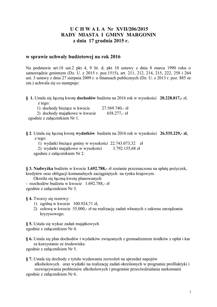 U C H W A Ł A Nr XVII/206/2015 RADY MIASTA I GMINY MARGONIN z dnia 17 grudnia 2015 r. w sprawie uchwały budżetowej na rok 2016 Na podstawie art.18 ust.2 pkt 4, 9 lit. d, pkt 10 ustawy z dnia 8 marca 1990 roku o samorządzie gminnym (Dz. U. z 2015 r. poz.1515), art. 211, 212, 214, 215, 222, 258 i 264 ust. 3 ustawy z dnia 27 sierpnia 2009 r. o finansach publicznych (Dz. U. z 2013 r. poz. 885 ze zm.) uchwala się co następuje: § 1. Ustala się łączną kwotę dochodów budżetu na 2016 rok w wysokości 28.228.017,- zł, z tego: 1) dochody bieżące w kwocie 27.569.740,- zł 2) dochody majątkowe w kwocie 658.277,- zł zgodnie z załącznikiem Nr 1. § 2. Ustala się łączną kwotę wydatków budżetu na 2016 rok w wysokości 26.535.229,- zł, z tego: 1) wydatki bieżące gminy w wysokości 22.743.073,32 zł 2) wydatki majątkowe w wysokości 3.792.155,68 zł zgodnie z załącznikiem Nr 2. § 3. Nadwyżka budżetu w kwocie 1.692.788,- zł zostanie przeznaczona na spłatę pożyczek, kredytów oraz obligacji komunalnych zaciągniętych na rynku krajowym. Określa się łączną kwotę planowanych - rozchodów budżetu w kwocie 1.692.788,- zł zgodnie z załącznikiem Nr 3. § 4. Tworzy się rezerwy: 1) ogólną w kwocie 100.924,71 zł, 2) celową w kwocie 55.000,- zł na realizację zadań własnych z zakresu zarządzania kryzysowego. § 5. Ustala się wykaz zadań majątkowych zgodnie z załącznikiem Nr 4. § 6. Ustala się plan dochodów i wydatków związanych z gromadzeniem środków z opłat i kar za korzystanie ze środowiska zgodnie z załącznikiem Nr 5. § 7. Ustala się dochody z tytułu wydawania zezwoleń na sprzedaż napojów alkoholowych oraz wydatki na realizację zadań określonych w programie profilaktyki i rozwiązywania problemów alkoholowych i programie przeciwdziałania narkomanii zgodnie z załącznikiem Nr 6. 1 § 8. Ustala się dochody i wydatki: 1) związane z realizacją zadań z zakresu administracji rządowej i innych zadań zleconych gminie ustawami zgodnie z załącznikiem Nr 7, 2) na realizację zadań własnych zgodnie z załącznikiem Nr 8, § 9. Ustala się dotacje udzielane z budżetu gminy, w tym: 1) dla jednostek sektora finansów publicznych 2) dla jednostek spoza sektora finansów publicznych zgodnie z załącznikiem Nr 9. § 10. Ustala się wydatki na przedsięwzięcia realizowane w ramach funduszu sołeckiego zgodnie z załącznikiem Nr 10. § 11. Ustala się limit zobowiązań z tytułu zaciąganych kredytów i pożyczek oraz emitowanych papierów wartościowych w kwocie 100.000 zł, w tym na: - pokrycie występującego w ciągu roku przejściowego deficytu budżetu w kwocie 100.000 zł. § 12. Upoważnia się Burmistrza Miasta i Gminy Margonin do: 1) zaciągania pożyczek i kredytów na pokrycie występującego w ciągu roku budżetowego deficytu budżetu do wysokości 100.000 zł, 2) udzielania pożyczek z budżetu do kwoty 95.000,- zł. 3) dokonywania zmian w planie wydatków pomiędzy paragrafami i rozdziałami w ramach działu w zakresie wydatków na wynagrodzenia ze stosunku pracy, wydatków majątkowych oraz przesunięć między wydatkami bieżącymi a majątkowymi, 4) lokowania wolnych środków budżetowych na rachunkach bankowych w innych bankach niż bank prowadzący obsługę budżetu, 5) przekazania uprawnień kierownikom jednostek organizacyjnych do zaciągania zobowiązań z tytułu umów, których realizacja w roku budżetowym i latach następnych jest niezbędna do zapewnienia ciągłości działania jednostki i z których wynikające płatności wykraczają poza rok budżetowy. 6) udzielania pożyczek z budżetu do kwoty 95.000,- zł. § 13. Ustala się kwotę 1.200.000 zł, do której Burmistrz Miasta i Gminy Margonin może samodzielnie zaciągać zobowiązania. § 14. Wykonanie uchwały powierza się Burmistrzowi Miasta i Gminy Margonin. § 15. Uchwała wchodzi w życie z dniem podjęcia z mocą obowiązującą od 1 stycznia 2016 roku i podlega publikacji w Dzienniku Urzędowym Województwa Wielkopolskiego. 2 Uzasadnienie do uchwały Nr XVII/206/2015 Rady Miasta i Gminy Margonin z dnia 17 grudnia 2015 r. w sprawie uchwały budżetowej na 2016 rok. Budżet na 2016 rok opracowany został w założeniu o sugerowane przez Ministerstwo Finansów wskaźniki wzrostu oraz kwoty subwencji oświatowej, wyrównawczej, równoważącej i udziału w podatku dochodowym od osób fizycznych. Podobnie postąpiono w przypadku przyjmowania do budżetu kwot dotacji celowych na zadania zlecone i zadania własne. W przedłożonym budżecie na 2016 rok zastosowano zmiany szczegółowej klasyfikacji dochodów i wydatków oraz przychodów i rozchodów. (Dz. U. z 2015 r. poz. 931 ze zm). Strona dochodowa budżetu zawiera wpływy z wszystkich możliwych źródeł wynikających z przepisów prawa. Po stronie wydatków przyjęto do realizacji wszystkie zadania obligatoryjnie ciążące na gminie oraz kwoty wydatków inwestycyjnych. Dochody budżetu Miasta i Gminy na 2016 rok wynoszą 28.228.017,- zł, a wydatki budżetu 26.535.229,- zł. W budżecie zaplanowano nadwyżkę budżetową w wysokości 1.692.788,- zł. Nadwyżka zostanie przeznaczona na spłatę zobowiązań z tytułu zaciągnięcia pożyczek i kredytów oraz wykup obligacji komunalnych. Po stronie rozchodów zaplanowano: - spłatę kredytów i pożyczek wcześniej zaciągniętych, których raty przypadają na 2016 rok w wysokości 497.788,- zł, - wykup obligacji komunalnych w kwocie 1.100.000,- zł, - udzielenie pożyczki z budżetu – 95.000,- zł. W planie budżetowym z stosunku do projektu budżetu na 2016 rok wprowadza się następujące zmiany: 3) Zwiększa się dochody o kwotę 350.000,- zł, w tym: - zwiększenie o środki na zadanie inwestycyjne pozyskane z innych źródeł-umowa partnerska Agrifirm (60016 § 6290) kwota 500.000,- zł. -zmniejszenie dochodów po rezygnacji z pomocy finansowej od Starostwa Powiatowego w Chodzieży na drogę Rutki-Klotyldzin (60016 § 6300) minus 1