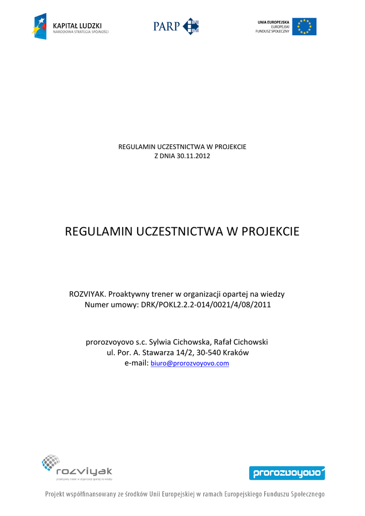 REGULAMIN UCZESTNICTWA W PROJEKCIE Z DNIA 30.11.2012 REGULAMIN UCZESTNICTWA W PROJEKCIE ROZVIYAK. Proaktywny trener w organizacji opartej na wiedzy Numer umowy: DRK/POKL2.2.2-‐014/0021/4/08/2011 prorozvoyovo s.c. Sylwia Cichowska, Rafał Cichowski ul. Por. A. Stawarza 14/2, 30-‐540 Kraków e-‐mail: [email protected] § 1 Informacje ogólne 1. Regulamin dotyczy projektu pt. „ROZVIYAK. Proaktywny trener w organizacji opartej na wiedzy” realizowanego przez prorozvoyovo s.c. Sylwia Cichowska, Rafał Cichowski we współpracy z Partnerem w ramach Projektu Systemowego Polskiej Agencji Rozwoju Przedsiębiorczości „Podnoszenie Kompetencji Kadry Szkoleniowej”. 2. Partnerem w Projekcie jest: Dialog Plus Psychologiczna Akademia Umiejętności Grażyna Ślifierz. 3. Realizacja Projektu zaplanowana jest w okresie od 1 sierpnia 2011 r. do 30 września 2013 r. na terenie Rzeczpospolitej Polskiej. 4. Ogólnym celem projektu „ROZVIYAK. Proakywny trener w organizacji opartej na wiedzy” jest podniesienie kompetencji 192 trenerów biznesu -‐ przede wszystkim kadry szkoleniowej przedsiębiorstw oraz trenerów kompetencji "twardych" -‐ w zakresie umiejętności przekazywania wiedzy, aktywnych metod prowadzenia szkoleń, technik prezentacji i autoprezentacji oraz dostosowywania działań szkoleniowych do specyficznych potrzeb klientów. Cel ten zrealizowany zostanie poprzez przeprowadzenie kompleksowego szkolenia dla szesnastu 12-‐osobowych grup trenerów wewnętrznych i zewnętrznych, posiadających minimum 80-‐godzinne doświadczenie szkoleniowe w samodzielnej pracy trenerskiej w obszarze kompetencji „twardych”. 5. W projekcie zaplanowano realizację 4 edycji kursów trenerskich. Na każdy kurs składają się 4 moduły szkoleniowe (rola trenera w organizacji, interaktywne metody prowadzenia szkoleń, autoprezentacja trenera i techniki prezentacji, osobista efektywność trenerska: toolbox) obejmujące 80 godzin szkoleniowych realizowanych w okresie 4 miesięcy. 6. Użyte w niniejszym Regulaminie pojęcia oznaczają: a) Lider Projektu / Organizator -‐ prorozvoyovo s.c. Sylwia Cichowska, Rafał Cichowski, ul. Porucznika Stawarza 14/2; 30-‐540 Kraków b) Partner -‐ Dialog Plus Psychologiczna Akademia Umiejętności Grażyna Ślifierz; ul. Gnieźnieńska 21; 85-‐313 Bydgoszcz c) Projekt – „ROZVIYAK. Proaktywny trener w organizacji opartej na wiedzy” realizowany przez prorozvoyovo s.c. Sylwia Cichowska, Rafał Cichowski we współpracy z Partnerem w ramach Projektu Systemowego Polskiej Agencji Rozwoju Przedsiębiorczości „Podnoszenie Kompetencji Kadry Szkoleniowej” d) Biuro Projektu -‐ prorozvoyovo s.c. Sylwia Cichowska, Rafał Cichowski, ul. Por. A. Stawarza 14/2. 30-‐540 Kraków, woj. małopolskie e) Kandydat – osoba, która zdeklarowała swój udział w Projekcie, przedstawiła dokumenty potwierdzające spełnianie wymogów uczestnictwa w projekcie f) Uczestnik (Beneficjent Ostateczny) – osoba zakwalifikowana do udziału w projekcie (po podpisaniu deklaracji uczestnictwa w projekcie), zgodnie z zasadami określonymi w niniejszym regulaminie g) Komisja Rekrutacyjna – organ oceniający i dokonujący kwalifikacji uczestników do Projektu. § 2 Organizacja Szkoleń 1. Cykle szkoleń „ROZVIYAK. Proaktywny trener w organizacji opartej na wiedzy” odbywały się będą 4-‐krotnie w układzie semestralnym (1 edycja = 1 semestr, odbędą się zatem 4 edycje projektu). W każdym semestrze (edycji) odbywały się będą zajęcia dla 4 grup szkoleniowych. 2. W każdej edycji szkolenia będą odbywać się w godzinach 9.00 do 18.00, w soboty i w niedziele, według harmonogramu stanowiącego załącznik nr 1 do umowy szkoleniowej, umieszczonego również na stronie internetowej www.rozviyak.com. Zajęcia mogą odbywać się w dwa kolejne dni od poniedziałku do piątku, jeśli taki harmonogram będzie bardziej dogodny dla grupy. 3. Prorozvoyovo s.c. zastrzega sobie prawo do zmiany harmonogramu szkoleń, o czym poinformuje uczestników projektu z odpowiednim wyprzedzeniem bez konieczności aneksowania umowy szkoleniowej. 4. Wszelkie informacje związane z organizacją szkoleń ogłaszane będą przez Organizatora na stronie internetowej www.rozviyak.com oraz przesyłane e-‐mailem uczestnikom. 5. Organizator ma możliwość zapewnienia noclegów podczas zjazdów uczestnikom mieszkającym poza miastem gdzie będzie się odbywać szkolenie. Ilość Uczestników korzystających z tej formy wsparcia nie może przekroczyć 50%. Decyzję o możliwości zapewnienia noclegu podejmuje Organizator. Szczegółowe warunki korzystania z noclegów zostaną podane osobom, które zakwalifikują się do Projektu. 6. Organizator zapewni Uczestnikom wyżywienie (obiad, przerwy kawowe podczas zajęć oraz śniadanie i kolacje Uczestnikom korzystającym z noclegu). 7. Organizator nie pokrywa kosztów dojazdu na szkolenie. 8. Organizator zapewni Uczestnikom materiały szkoleniowe. 9. Po zakończeniu udziału w szkoleniu Uczestnik otrzyma certyfikat. § 3 Uczestnicy Projektu 1. Uczestnikiem Projektu mogą być osoby, które są: a) pracownikami osób prawnych prowadzących działalność w zakresie szkoleń, nie będących przedsiębiorcami lub b) osobami fizycznymi prowadzącymi działalność gospodarczą w zakresie szkoleń lub c) pracownikami przedsiębiorców lub d) osobami fizycznymi świadczącymi na podstawie umów cywilnoprawnych usługi szkoleniowe dla podmiotów prowadzących działalność w zakresie szkoleń. 2. Uczestnikiem Projektu mogą być osoby posiadające minimum 80-‐godzinne doświadczenie szkoleniowe w samodzielnej pracy trenerskiej (preferowane doświadczenie w prowadzeniu szkoleń w obszarze kompetencji „twardych”, m.in. zarządzanie projektami, zarządzanie projektami IT, optymalizowanie procesów organizacyjnych np. w metodologii KAIZEN, lean mangement, zarządzanie jakością, zarządzanie wiedzą w organizacji, etc.). 3. Uczestnikami Projektu nie 