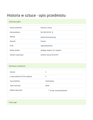 Historia w sztuce - opis przedmiotu Informacje ogólne Nazwa przedmiotu Historia w sztuce Kod przedmiotu 08.3-WH-HD-HS- 16 Wydział Wydział Humanistyczny Kierunek Historia Profil ogólnoakademicki Rodzaj studiów drugiego stopnia z tyt. magistra Semestr rozpoczęcia semestr zimowy 2016/2017 Informacje o przedmiocie Semestr 3 Liczba punktów ECTS do zdobycia 9 Typ przedmiotu obowiązkowy Język nauczania polski Sylabus opracował Formy zajęć dr hab. Andrzej Gillmeister Forma Liczba godzin w Liczba godzin w Liczba godzin w Liczba godzin w Forma zajęć semestrze tygodniu semestrze tygodniu zaliczenia (stacjonarne) (stacjonarne) (niestacjonarne) (niestacjonarne) 30 2 - - Ćwiczenia Projekt Cel przedmiotu Przedmiot ma dać studentom podstawową wiedzę o instytucjach kultury i orientację we współczesnym życiu kulturalnym. Wymagania wstępne brak Zakres tematyczny 1) Sztuka jako narracja o historii. 2) Tradycje malarstwa historycznego do końca XVIII wieku. 3) Europejskie malarstwo historyczne XIX wieku: Jacques-Louis David, Eugene Delacroix, Francisco Goya, Paule Delaroche. 4) Polskie malarstwo historyczne XIX wieku: Jan Matejko, Juliusz i Wojciech Kossakowie, Wojciech Gerson, Jacek Malczewski. 5) Polska powieść historyczna XIX wieku: Henryk Sienkiewicz i Józef Ignacy Kraszewski. 6) Sztuka wobec I wojny światowej. 7) Sztuka wobec II wojny światowej. 8) Rewolucja i socjalizm w sztuce. 9) Historia w filmie. 10) Inny film historyczny: „Królik po berlińsku”. 11) Historia i sztuka w przestrzeni publicznej: pomniki i inne formy upamiętniania; graffiti. 12) Architektura jako głos w debacie historycznej. 13) Historia w sztuce współczesnej. 14) Instytucje kultury w Polsce po 1989 roku. Metody kształcenia Dyskusja, dyskusja panelowa, kula, debata „za i przeciw”, wycieczka, przygotowanie projektu. Efekty kształcenia i metody weryfikacji osiągania efektów kształcenia Opis efektu Symbole efektów Metody weryfikacji Forma zajęć Opis efektu Student ma wszechstronną znajomość i Symbole efektów Metody weryfikacji KH2_W15 obserwacja i dogłębne rozumienie roli refleksji ocena historycznej w kształtowaniu kultury i nauki aktywności na Forma zajęć Ćwiczenia zajęciach zna i rozumie różnicę pomiędzy różnymi KH2_W20 projekt Ćwiczenia KH2_W23 obserwacja i Ćwiczenia wytworami kultury i zasadach ich analizy i interpretacji ma podstawową wiedzę o zbiorach sztuki współczesnej i orientację we współczesnym ocena życiu kulturalnym aktywności na zajęciach wycieczka wykrywa złożone zależności między KH2_U12 obserwacja i przeszłością a współczesnymi procesami ocena społecznymi i kulturalnymi aktywności na Ćwiczenia zajęciach potrafi porozumiewać się z wykorzystaniem KH2_U17 obserwacja i różnych kanałów i technik komunikacyjnych ocena ze specjalistami w zakresie przynajmniej aktywności na jednej epoki i dziedziny historycznej lub zajęciach Ćwiczenia pokrewnych oraz niespecjalistami w języku polskim potrafi popularyzować wiedzę o humanistyce oraz wytworach kultury i jej instytucjach KH2_U18 projekt Ćwiczenia Opis efektu posiada pogłębioną umiejętność Symbole efektów KH2_U20 Metody weryfikacji obserwacja i przygotowania wystąpień ustnych w języku ocena polskim z zakresu historii lub pokrewnych aktywności na dyscyplin humanistycznych i społecznych zajęciach efektywnie potrafi współdziałać z członkami Forma zajęć Ćwiczenia KH2_K04 projekt Ćwiczenia potrafi kierować pracą grupy KH2_K05 projekt Ćwiczenia wykazuje motywację do zaangażowania w KH2_K08 projekt Ćwiczenia KH2_K11 obserwacja i Ćwiczenia zespołu i pracować pod kierunkiem życiu społecznym ma świadomość znaczenia europejskiego dziedzictwa kulturowego i historycznego dla ocena rozumienia współczesnych wydarzeń aktywności na społecznych i kulturalnych zajęciach uczestniczy w życiu kulturalnym, korzystając KH2_K12 wycieczka Ćwiczenia z różnych mediów i różnych jego form Warunki zaliczenia Warunkiem zaliczenia przedmiotu jest przedstawienie projektu (w postaci prezentacji PP) dotyczącego wybranego pomnika historycznego oraz wybranego artysty oraz przedstawienie tego projektu na forum publicznym i uzyskanie minimum 4 pkt. za aktywność na zajęciach polegającą na udziale w dyskusji i debatach. Uzyskane punkty są potwierdzeniem aktywności studenta. Może im towarzyszyć ocena w skali od 2 do 5 za merytoryczne przygotowanie się do zajęć. W przypadku negatywnej oceny pracy studenta, nie przyznaje się punktów. Obciążenie pracą Obciążenie pracą Studia Studia niestacjonarne stacjonarne (w godz.) (w godz.) Godziny kontaktowe (udział w zajęciach; konsultacjach; egzaminie, itp.) 75 - Samodzielna praca studenta (przygotowanie do: zajęć, kolokwium, 155 - Łącznie 230 - Punkty ECTS Studia Studia niestacjonarne egzaminu; studiowanie literatury przygotowanie: pracy pisemnej, projektu, prezentacji, raportu, wystąpienia; itp.) stacjonarne Zajęcia z udziałem nauczyciela akademickiego 3 - Zajęcia bez udziału nauczyciela akademickiego 6 - Łącznie 9 - Literatura podstawowa 1. Historia w sztuce. History in Art., red. M. A. Potocka, Kraków 2011. 2. Kowalczyk I., Podróż do przeszłości. Interpretacje najnowszej historii w polskiej sztuce krytycznej, Poznań 2010. Literatura uzupełniająca 1. Art now. Nowy przegląd sztuki współczesnej: 81 artystów z całego świata, red. U. Grosenick, Köln 2008. 2. Białostocki J., Pięć wieków myśli o sztuce. Studia i rozprawy z dziejów teorii i historii sztuki, Warszawa 1976. 3. Bujnicki T., „Potop” Henryka Sienkiewicza. Powieść i film, Warszawa 1977. 4. Carrol N., Filozofia sztuki masowej, Gdańsk 2011. 5. Dzieła nowoczesnej architektury, red. M. Agnoletto [i in.], Warszawa 2007. 6. Hollingswotth M., Sztuka w dziejach człowieka, Wrocław 1992. 7. Kolekcja 04/Collection 04. 2001-2005. Centrum Sztuki Współczesnej Zamek Ujazdowski, red. A, Mazur, W. Krukowski, Warszawa 2005. 8. Kr
