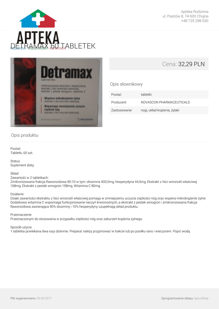 Apteka Rodzinna ul. Piastów 8, 74-500 Chojna +48 725 298 530 DETRAMAX 60 TABLETEK Cena: 32,29 PLN Opis słownikowy Postać tabletki Producent NOVASCON PHARMACEUTICALS Zastosowanie nogi, układ krążenia, żylaki Opis produktu Postać Tabletki, 60 szt. Status Suplement diety. Skład Zawartość w 2 tabletkach: Zmikronizowana frakcja flawonoidowa 90:10 w tym: diosmina 400,5mg, hesperydyna 44,5mg, Ekstrakt z liści winorośli właściwej 168mg, Ekstrakt z pestek winogron 158mg, Witamina C 80mg. Działanie Dzięki zawartości ekstraktu z liści winorośli właściwej pomaga w zmniejszeniu uczucia ciężkości nóg oraz wspiera mikrokrążenie żylne. Dodatkowo witamina C wspomaga funkcjonowanie naczyń krwionośnych, a ekstrakt z pestek winogron i zmikronizowana frakcja flawonoidowa zawierająca 90% diosminy i 10% hesperydyny uzupełniają skład produktu. Przeznaczenie Przeznaczonym do stosowania w przypadku ciężkości nóg oraz zaburzeń krążenia żylnego. Sposób użycia 1 tabletka powlekana dwa razy dziennie. Preparat należy przyjmować w trakcie lub po posiłku rano i wieczorem. Popić wodą Plik wygenerowano: 03-03-2017 Powered by TCPDF (www.tcpdf.org) Oprogramowanie sklepu: AptusShop